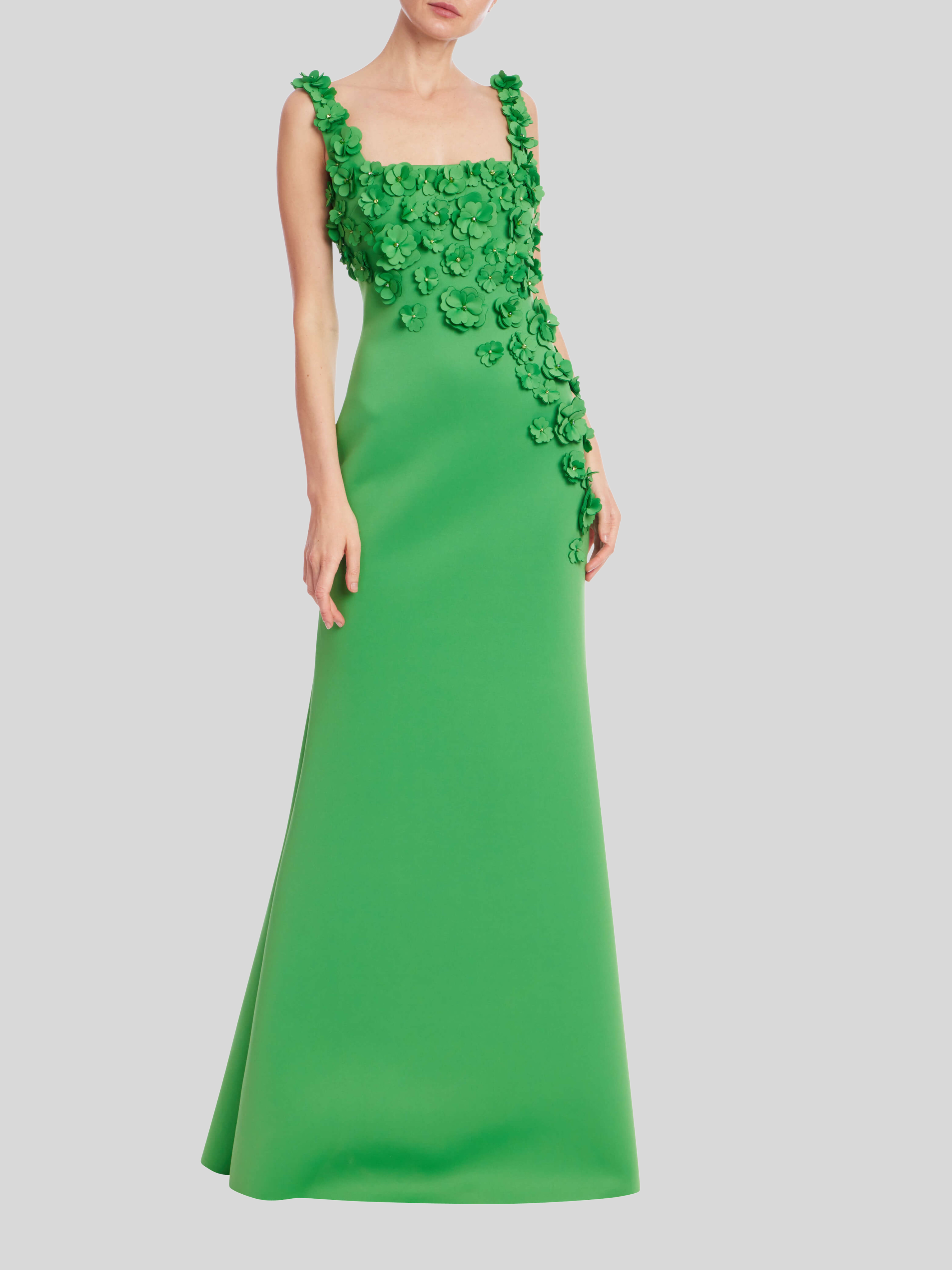 Dazzle at your next black-tie event in this stunning Badgley Mischka gown. The maxi length and flattering A-line silhouette create a timeless and elegant look. This sleeveless gown features delicate tank style straps and a chic square neckline. Notice the captivating cascading 3D floral appliqué detailing, adding a touch of romance. The low back design provides a subtly alluring finish. Crafted from a comfortable and figure-flattering scuba material, this gown ensures a perfect fit. This Badgley Mischka dress is a must-have for any special occasion.