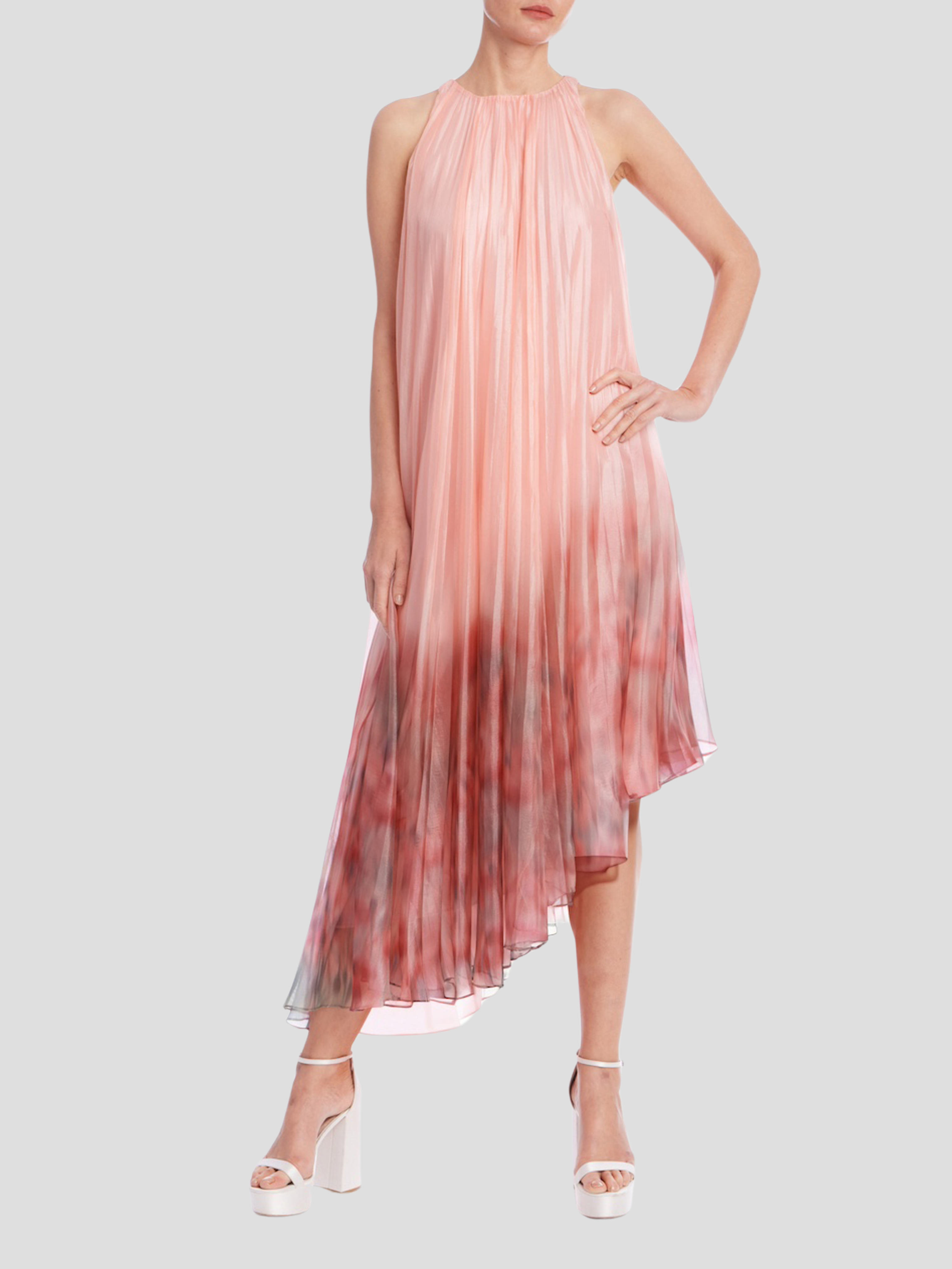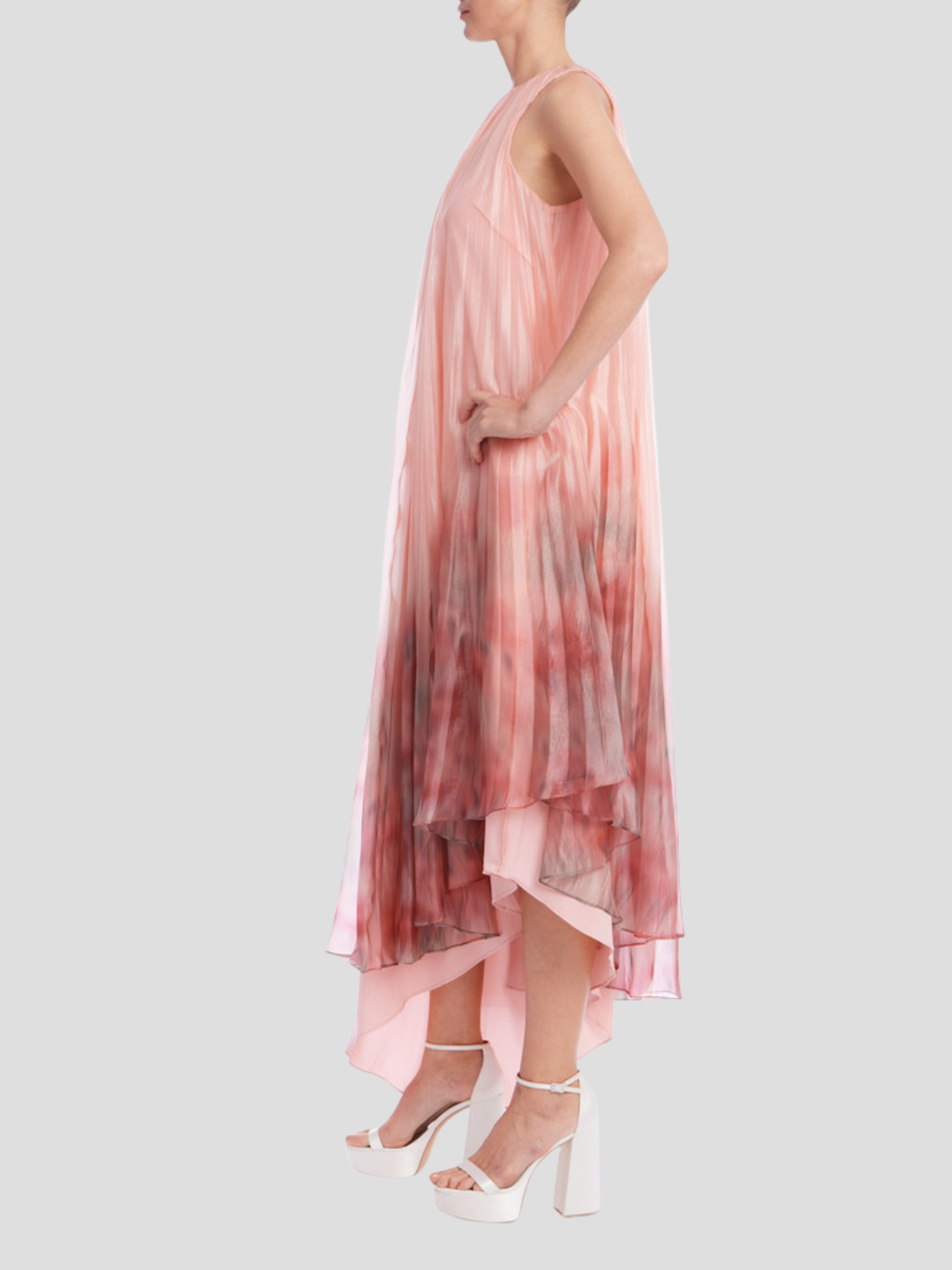 Effortlessly ethereal, the Ombre Pleated High-Low Dress captivates with its airy silhouette and dreamy color palette. This sleeveless chiffon dress features a soft rose hue that deepens into a romantic, watercolor-inspired ombré at the hem. The high neckline and delicate pleating offer graceful movement, while the asymmetric hem adds a modern edge. Perfect for garden parties, destination weddings, or any occasion that calls for subtle sophistication with a twist.
