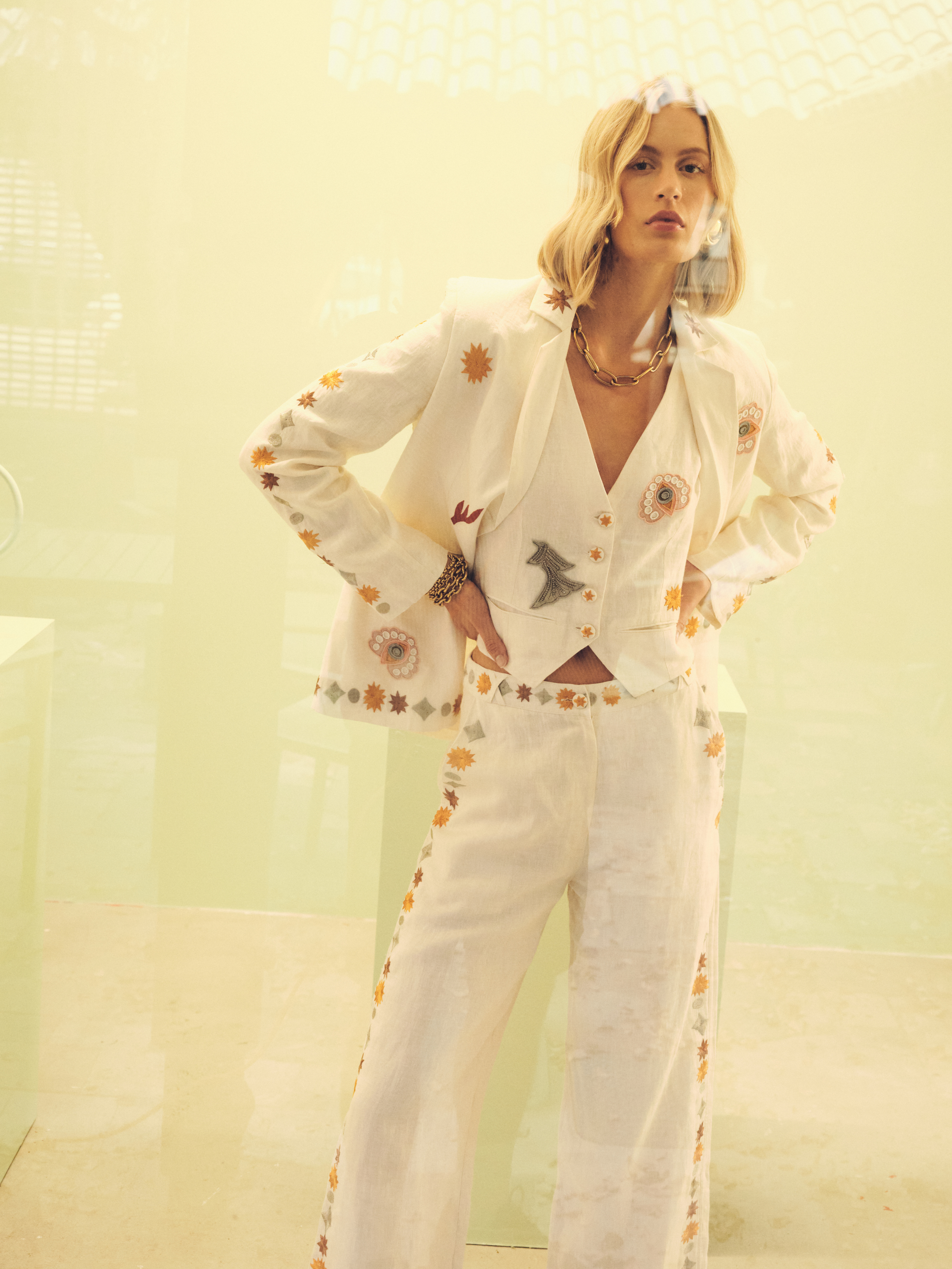 Vera Embroidered Linen Blazer in Ivory