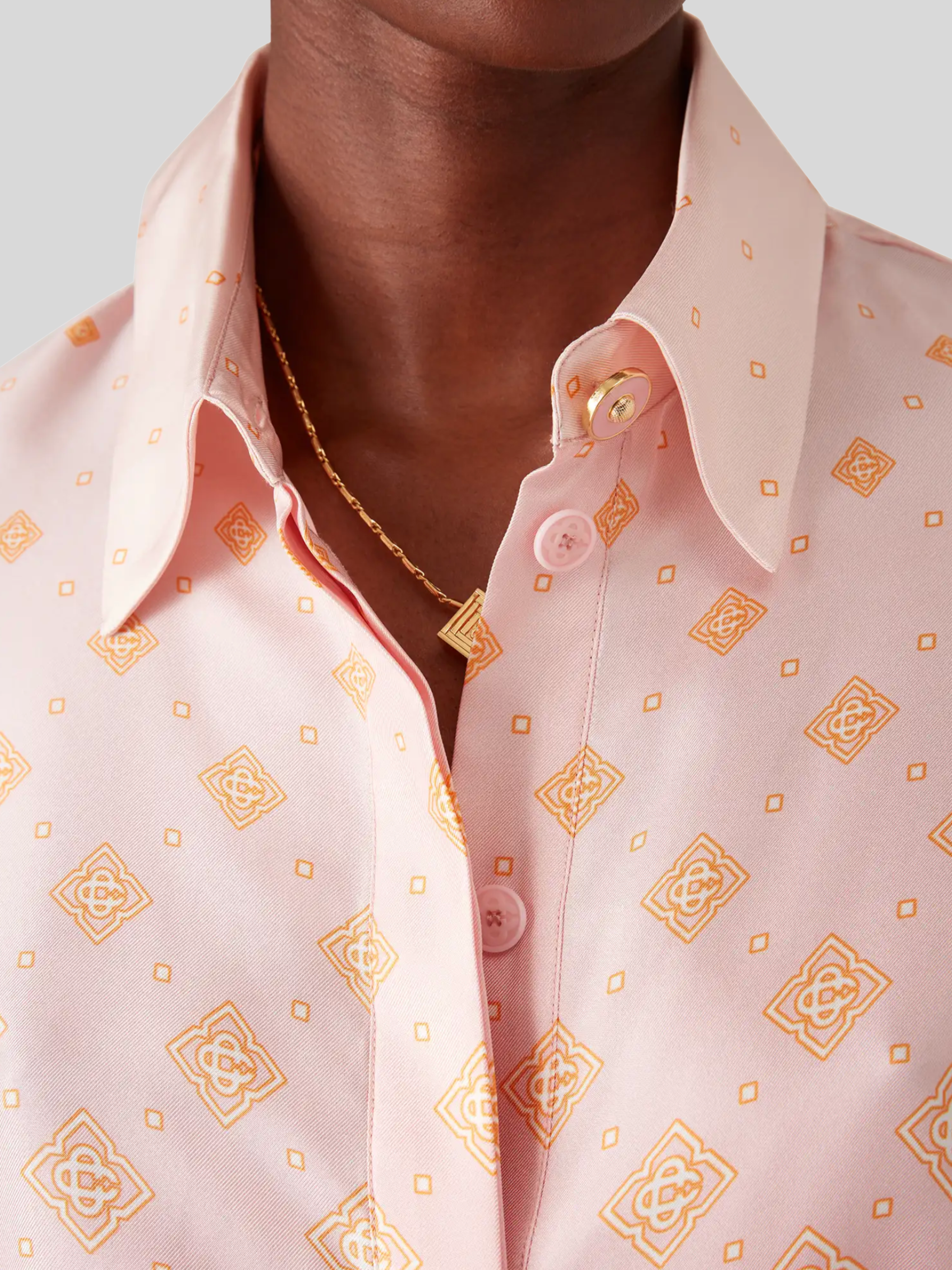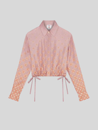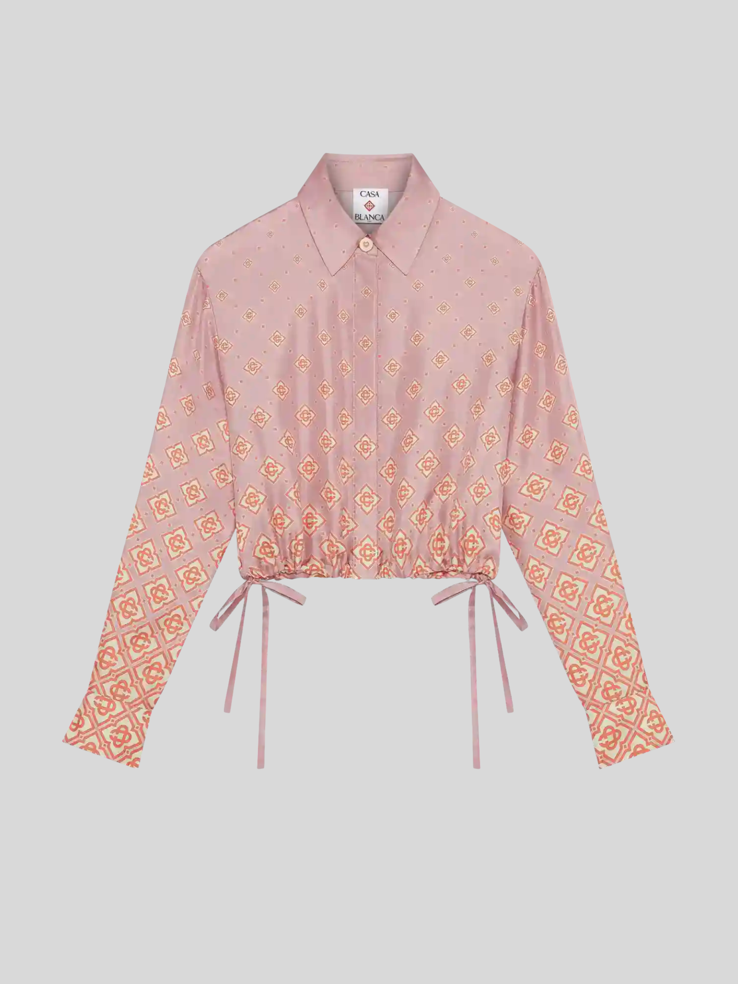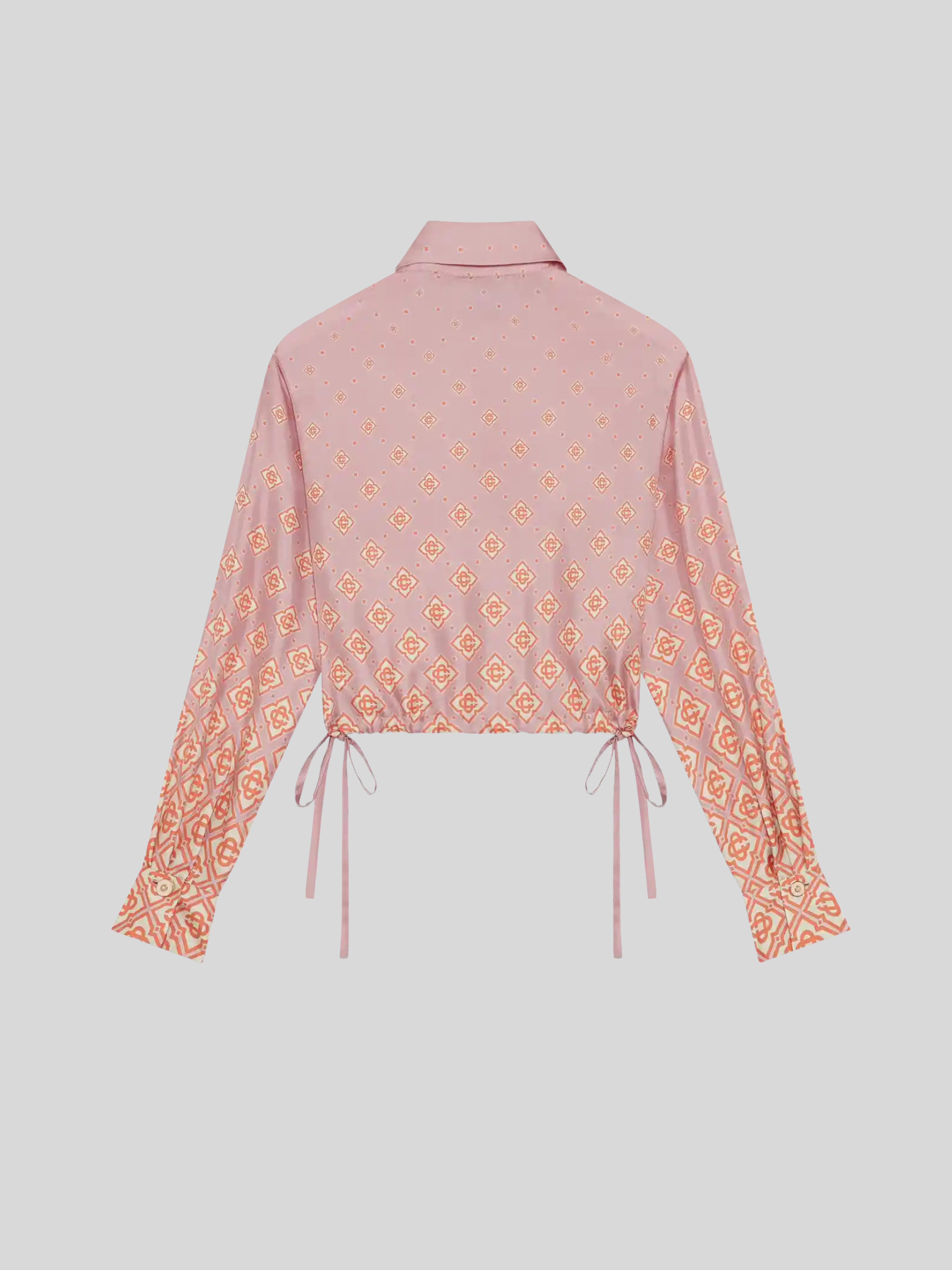 The Degrade Monogram long-sleeve silk shirt is a cropped design crafted from silk twill, featuring the house's monogram rendered in gradient tones. Completed with a point collar, button closure, interlocking CC logo corozo buttons, signature gold rim pearl buttons on the cuffs and collar, string fastenings at the sides, and a cropped silhouette.