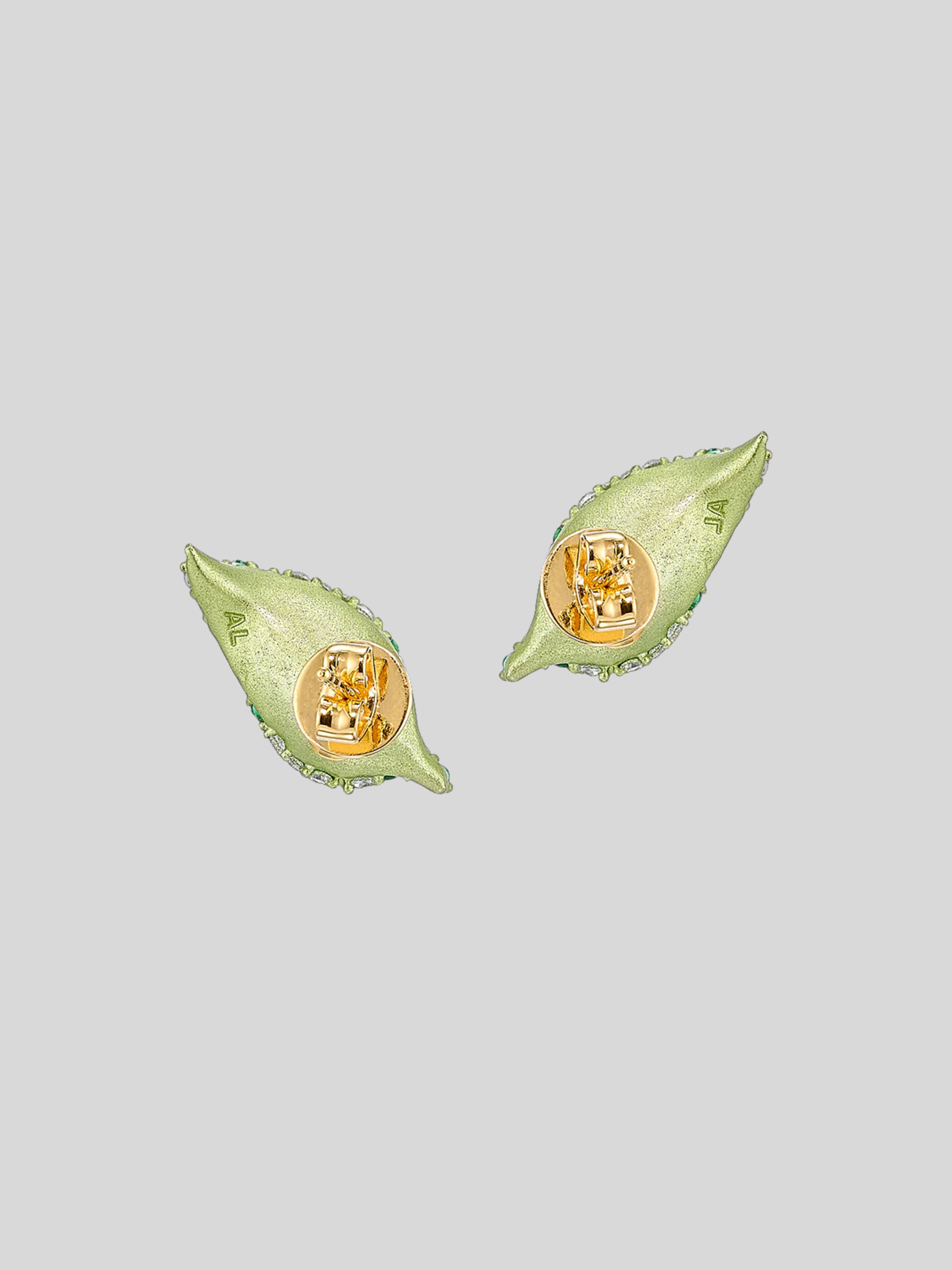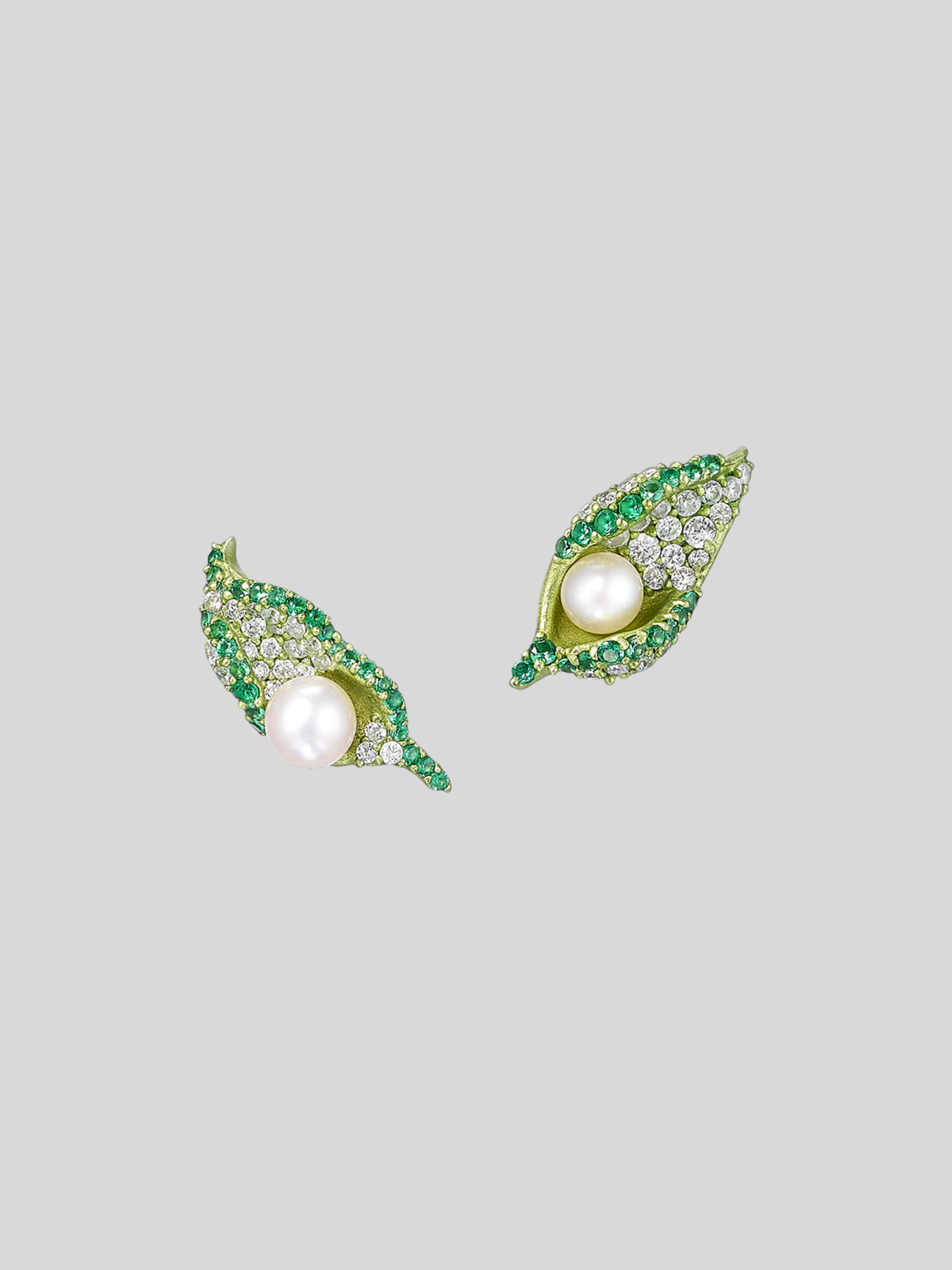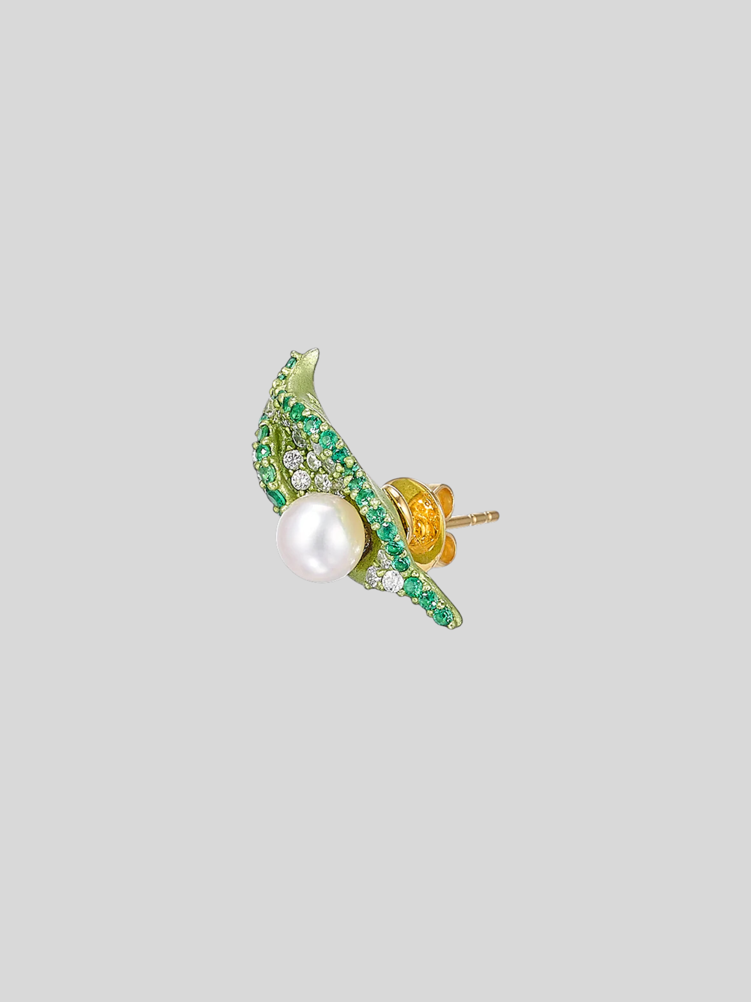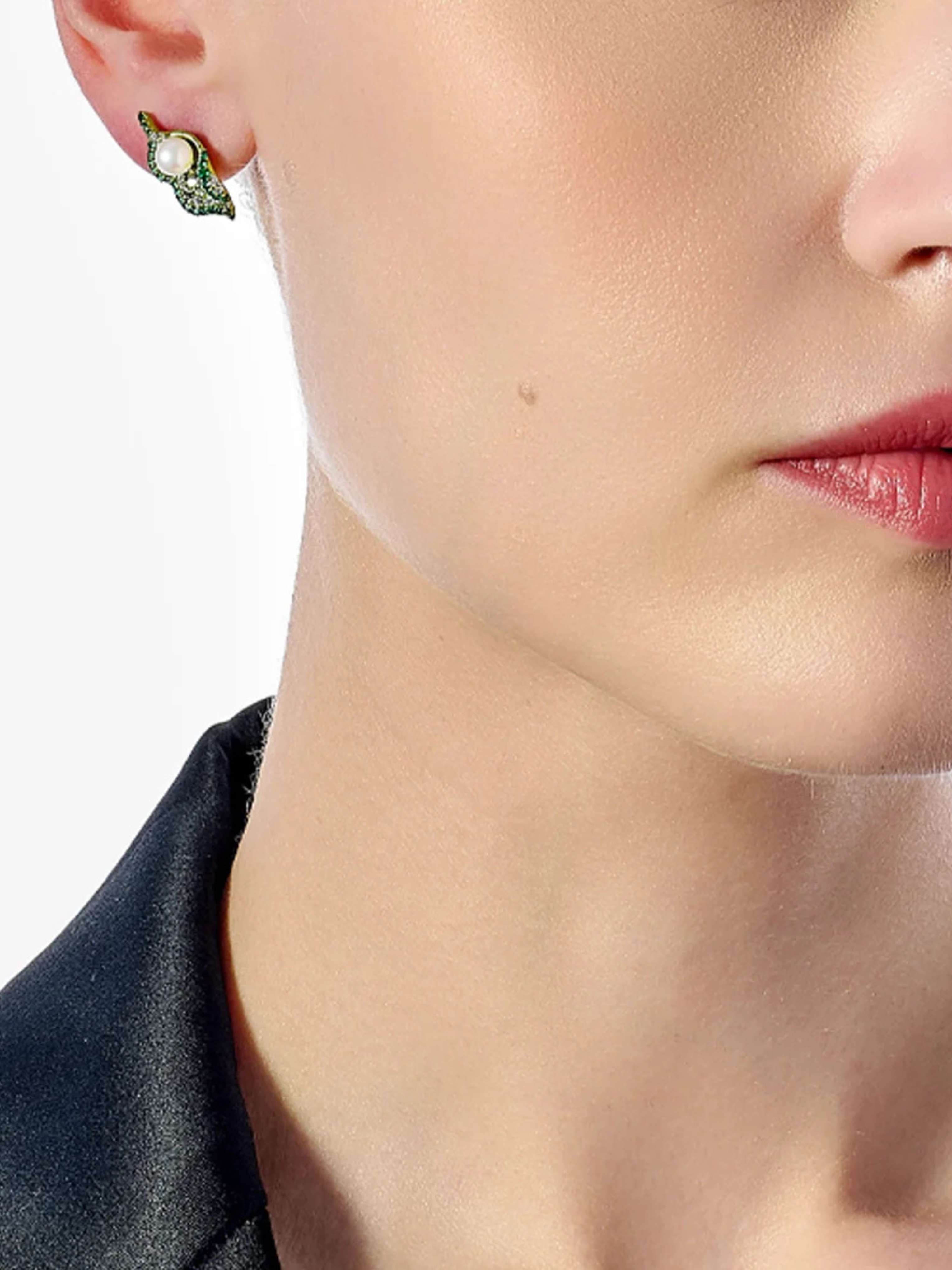 A pair of mis-matched earrings with butterfly backs in recycled citrus aluminium, hand-set with laboratory-grown and created gemstones including pavé-set emeralds and simulated white diamonds of the highest brilliance with freshwater pearls, mimicking delicate dew drops resting on the jewelled petal. With delicate variations in shape and form, the petals mimic the organic wonders of nature.