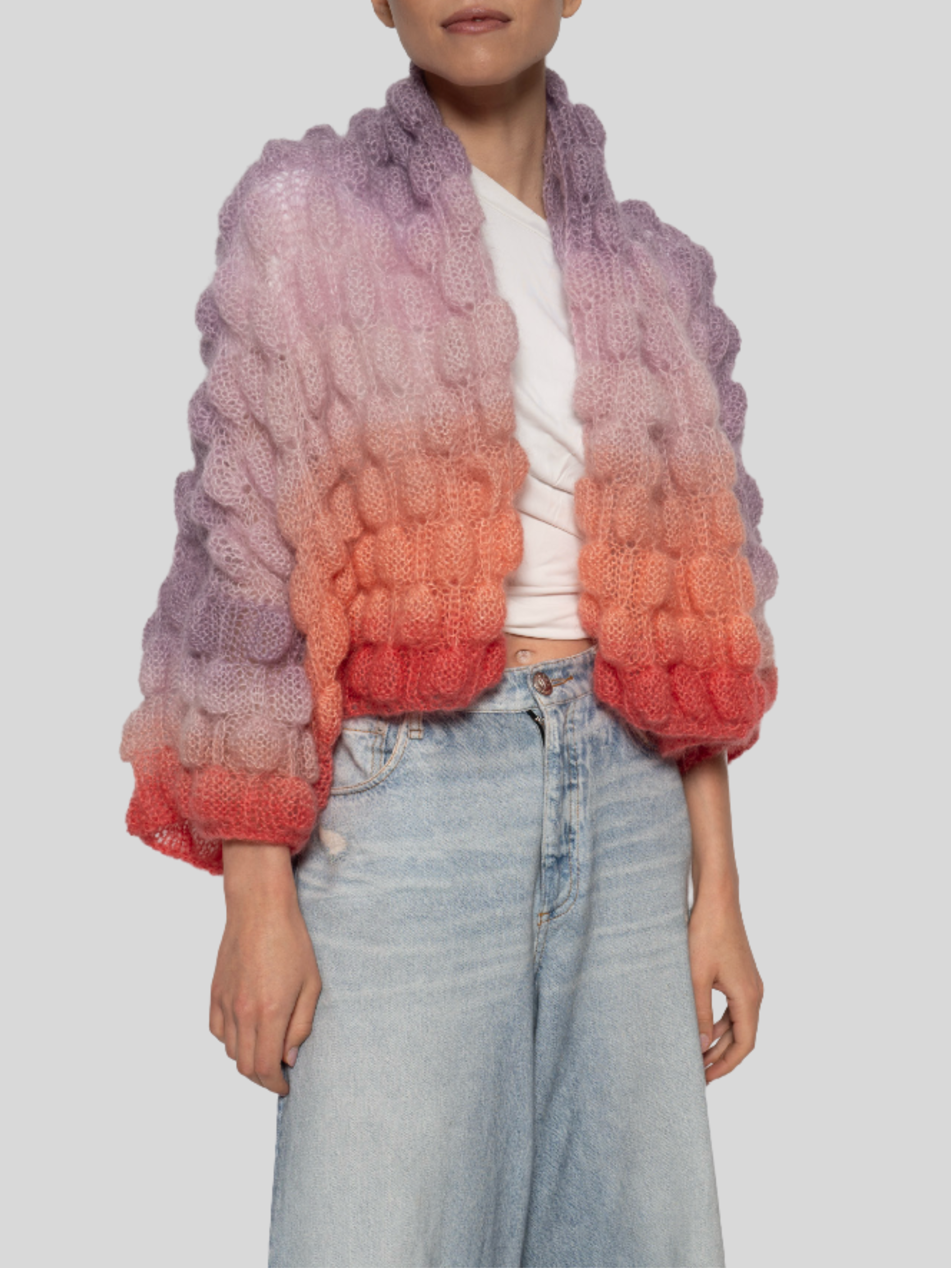 The Crop Emma Lace with 3/4 Sleeves is your new go-to for effortless charm. This enchanting piece pairs lilac and raspberry in a color combination that's both bold and beautifully balanced. Made from 75% baby mohair and 25% silk, it's wonderfully soft and breathable with a luxe feel. The three-quarter sleeves add just the right amount of coverage while keeping the cropped silhouette playful and modern. Whether you're layering it over basics or wearing it solo, this lace top brings personality and sophistication to every outfit. Pure joy in two gorgeous shades.