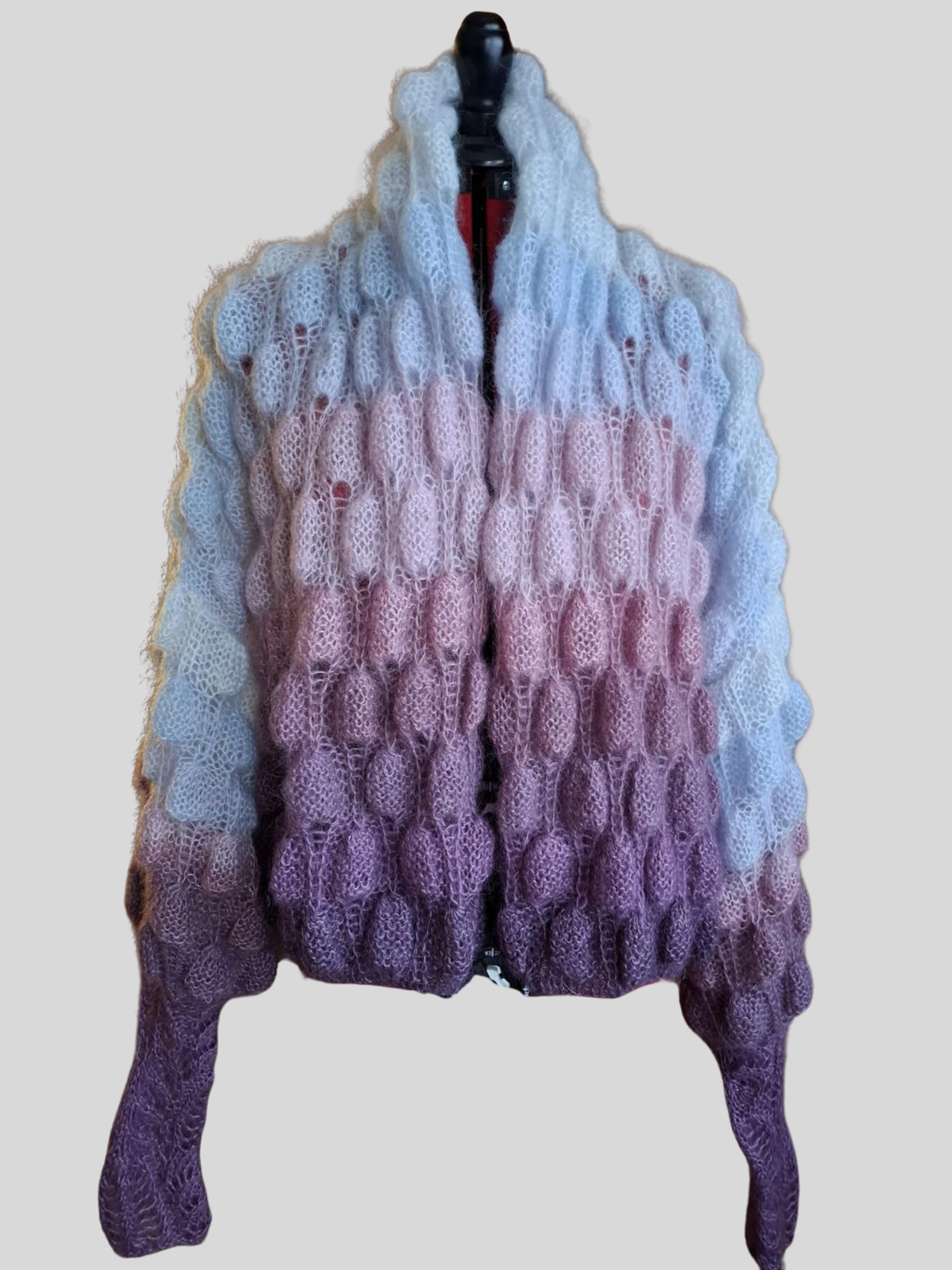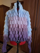 Introducing the Crop Emma Lace—a breezy two-tone beauty in soothing baby blue and lilac. This delicate lace top is crafted from a sumptuous blend of 75% baby mohair and 25% silk, creating a piece that's feather-light yet luxuriously soft. The gentle color palette brings a serene, dreamy quality to any outfit, while the cropped length keeps things contemporary and fun. Perfect for layering over slip dresses or wearing as a standalone statement piece, this top effortlessly transitions from casual to dressed-up. Comfort meets style in the most enchanting way.