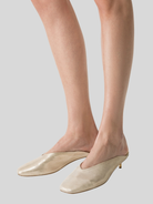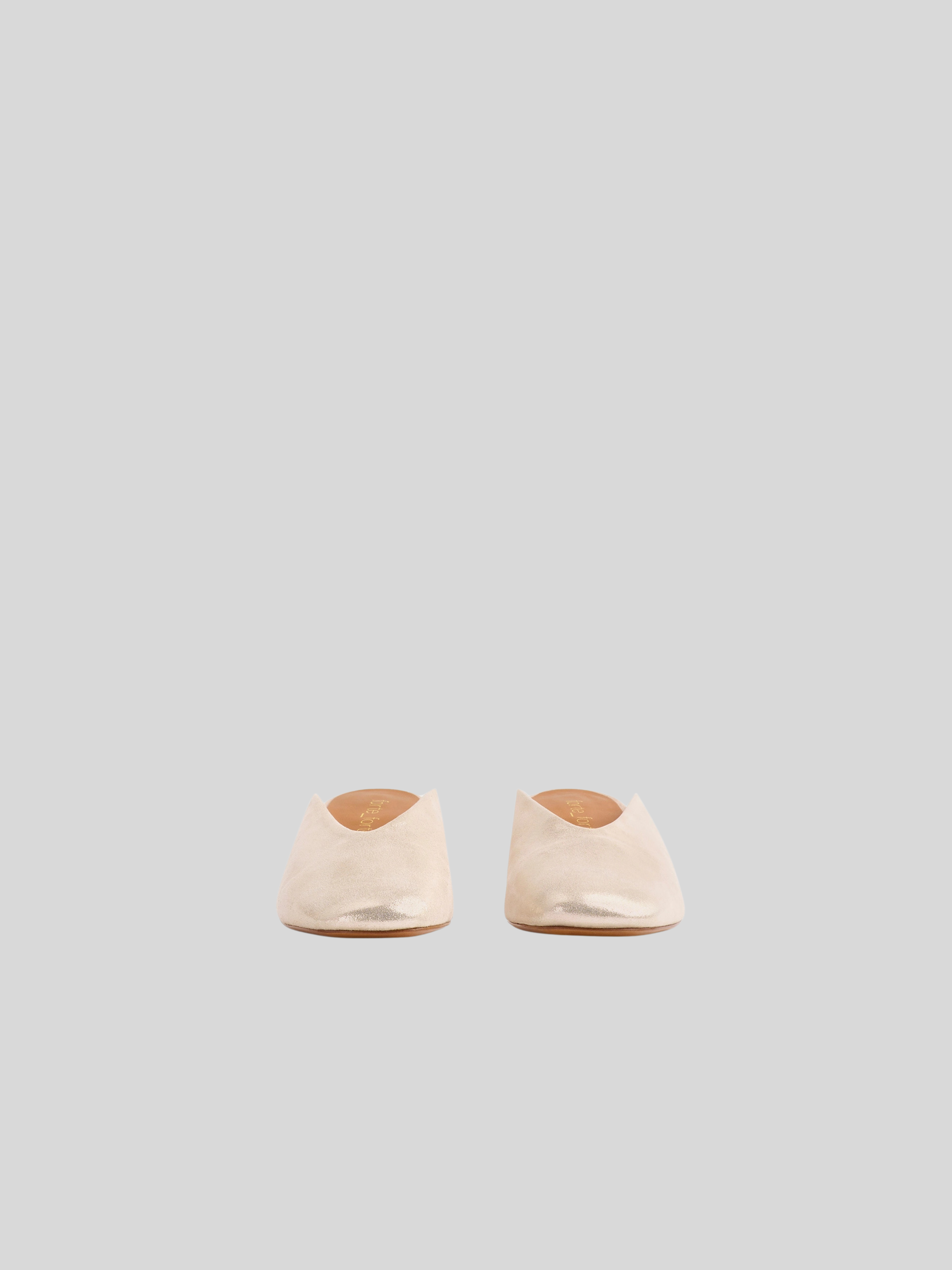 Soft shapes at the toe and a rounded neckline introduce the new platinum laminated leather mule. the slim 4 cm metallic—finish heel elongates the silhouette while keeping the relaxed comfort typical of forte_forte.