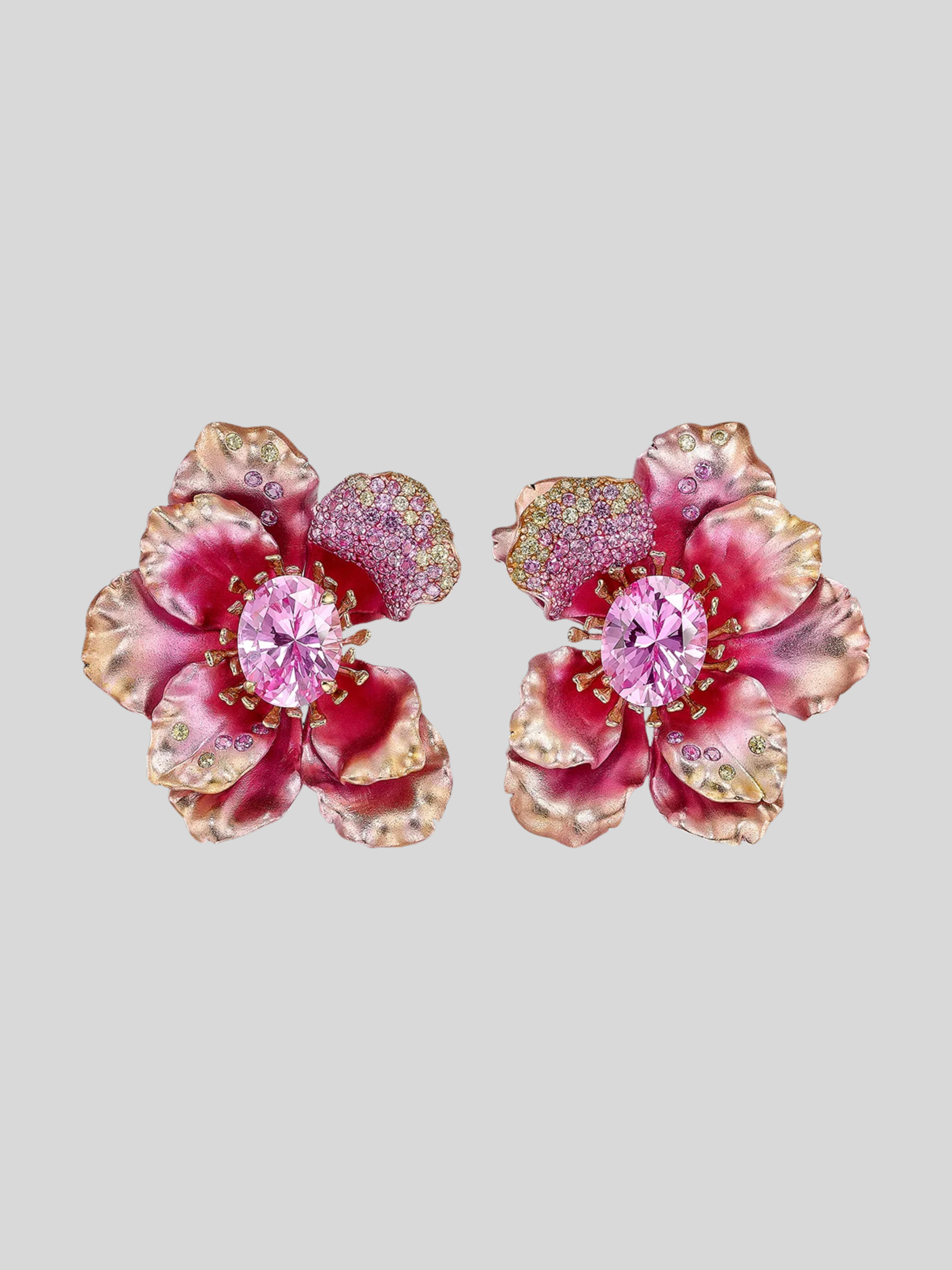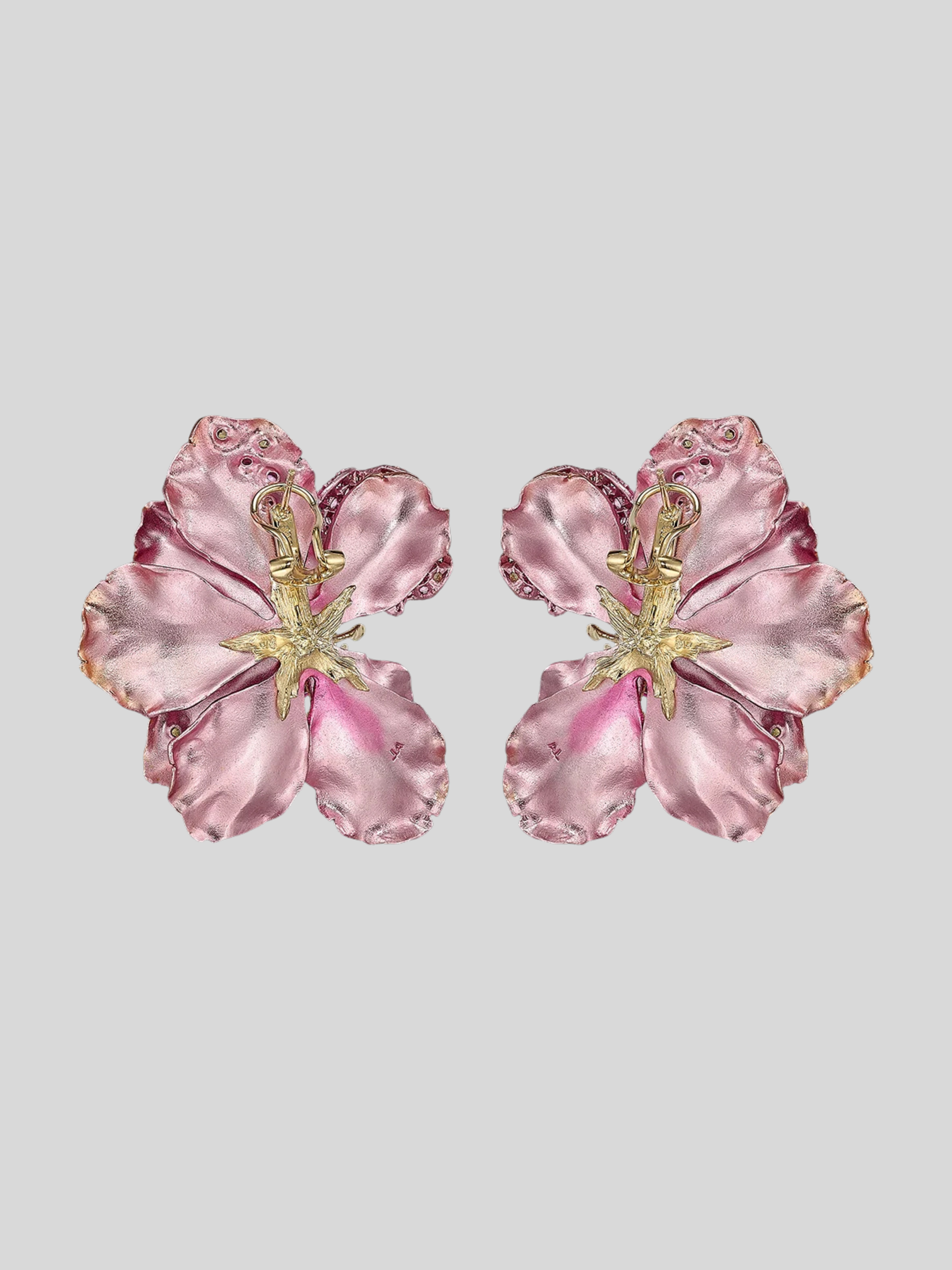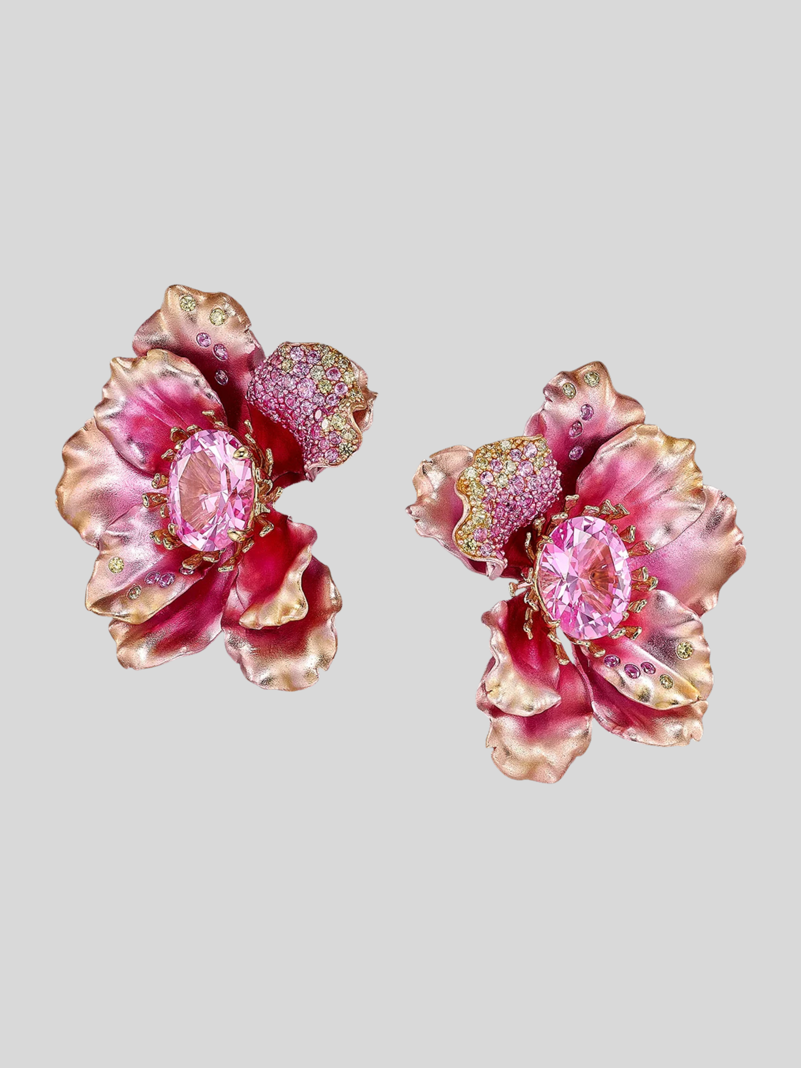A stunning pair of feather-light earrings with omega backs in painterly anodised recycled aluminium and 18k yellow gold vermeil, with 14k yellow gold earring posts and omega backs. This innovative pair of earrings is intricately hand-set with laboratory-grown and created gemstones including fuchsia pink sapphires, yellow sapphires, and lilac amethysts.
