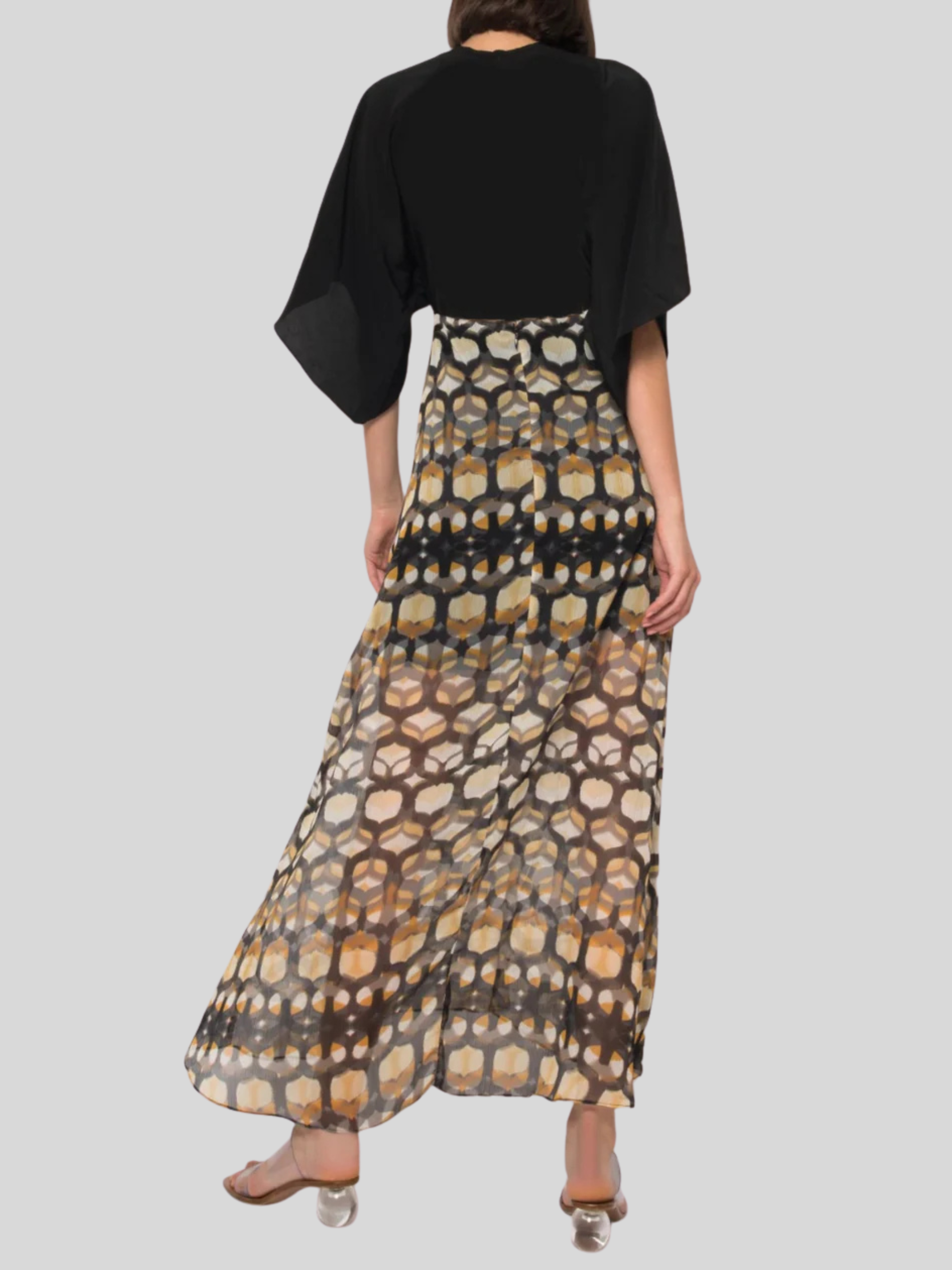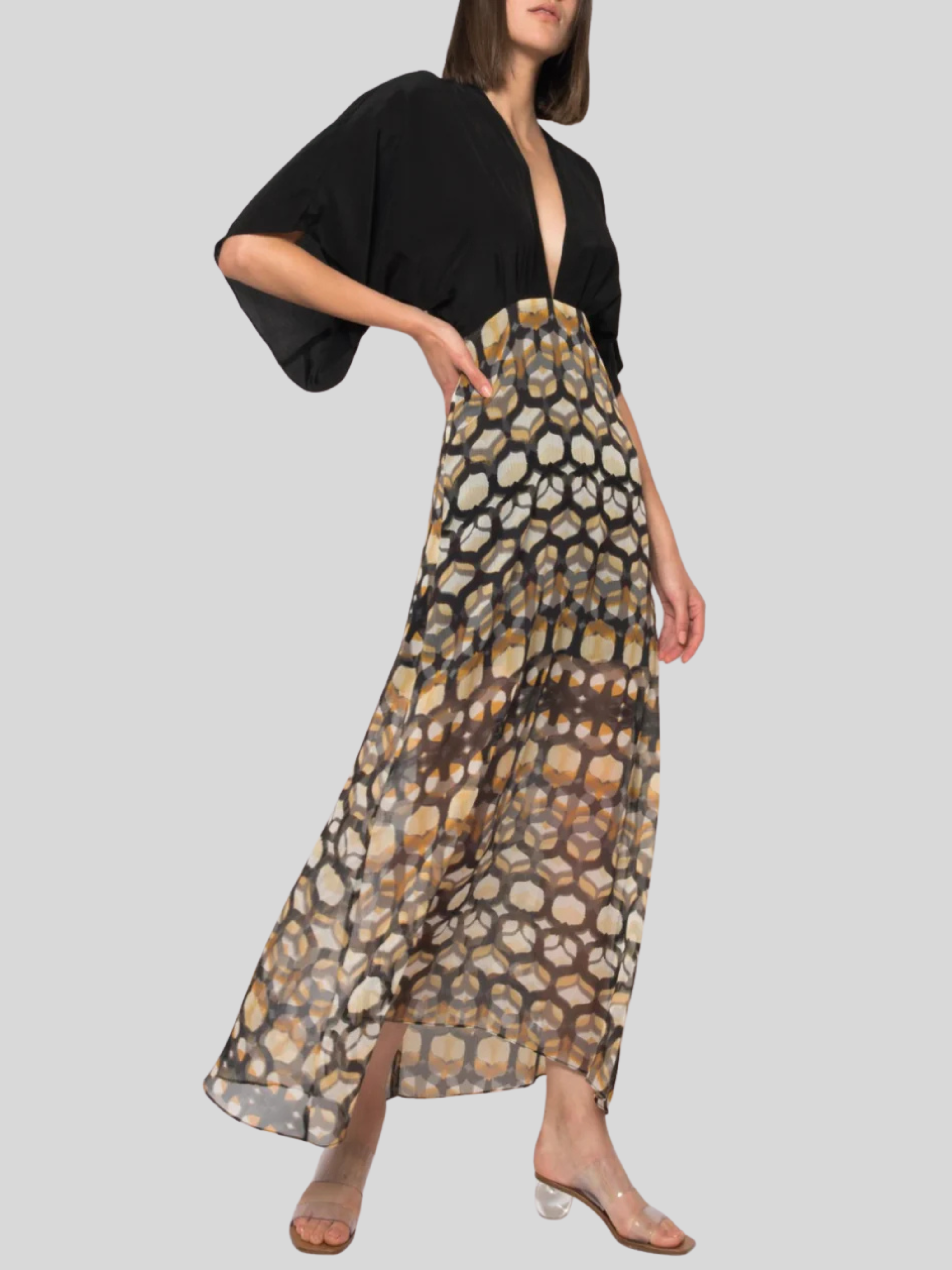 This 100% silk Tanya dress features a bold black-and-patterned full-length silhouette with a plunging neckline and an A-line maxi skirt. This ethereal design is optimal for any event, from garden parties to more formal galas--it's light, airy, and perfect for any occasion.