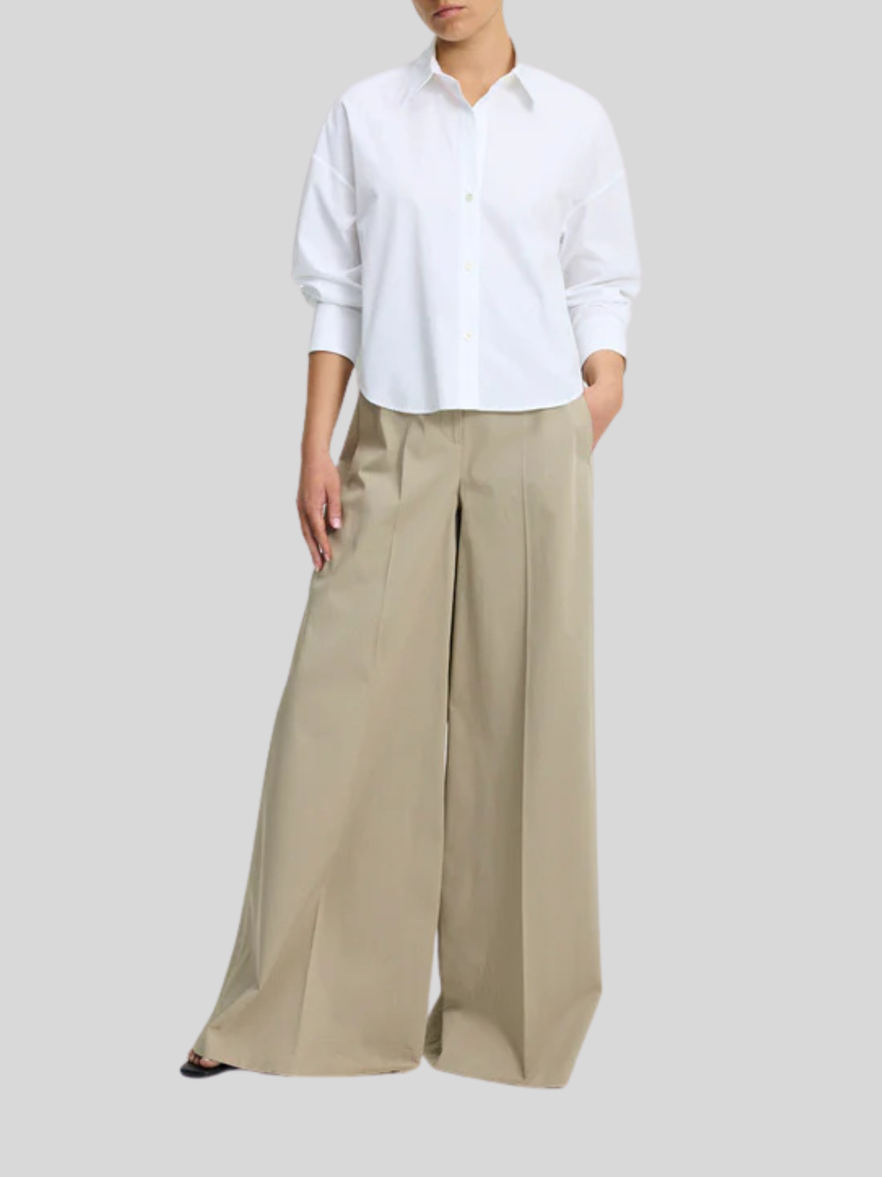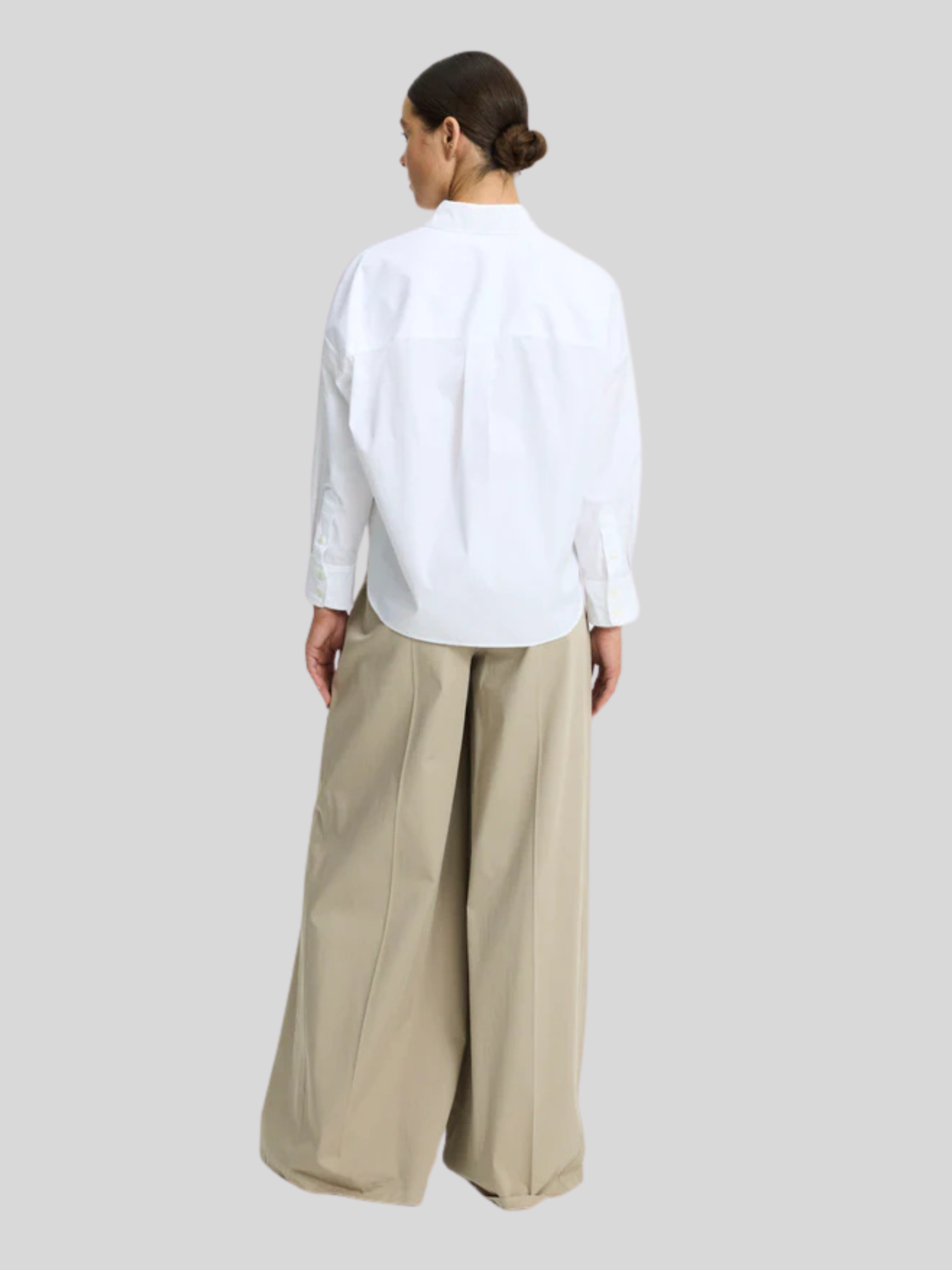 Kelly is a cropped button-front shirt with a tailored collar and bracelet-length sleeves.