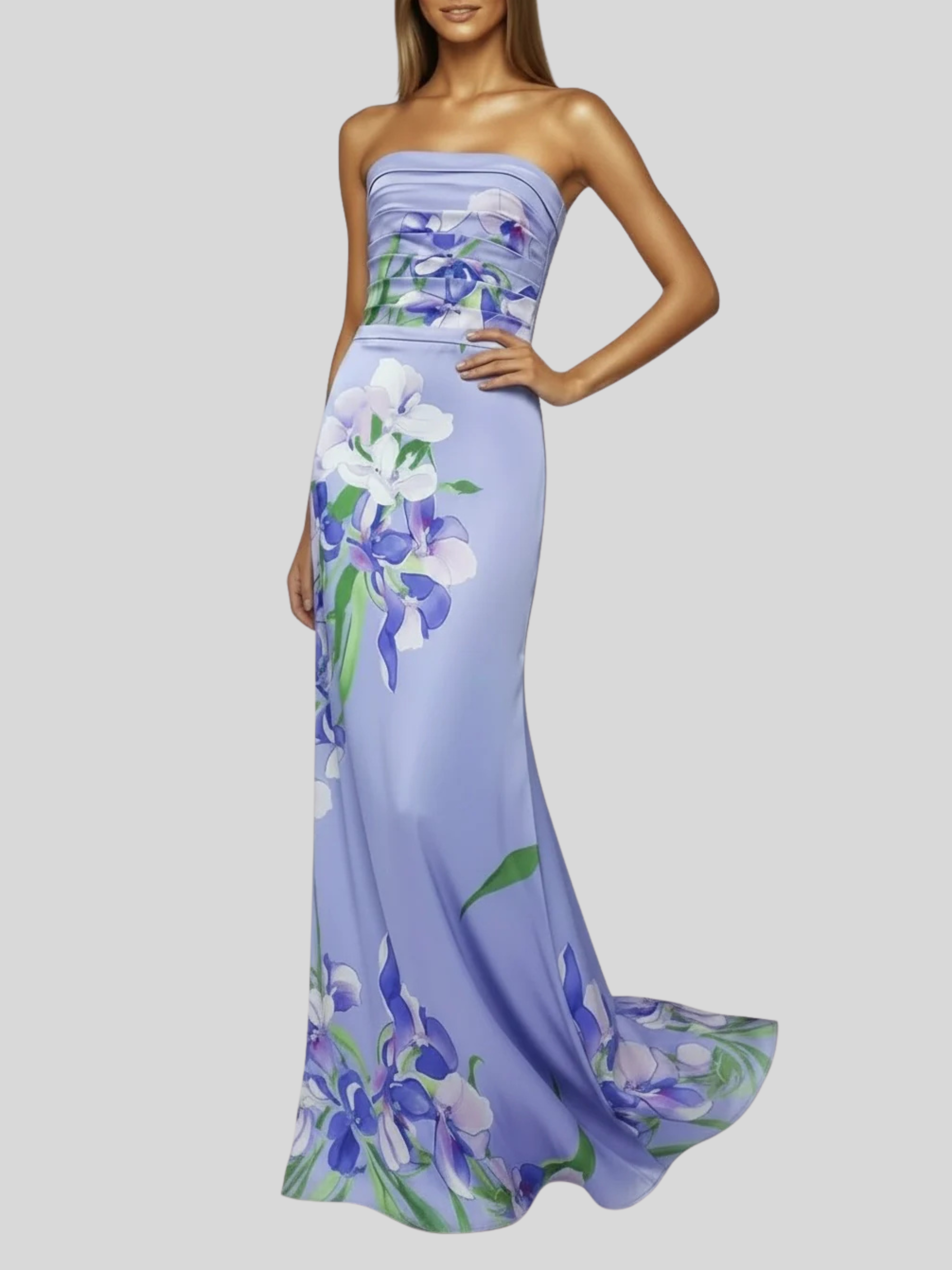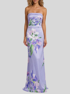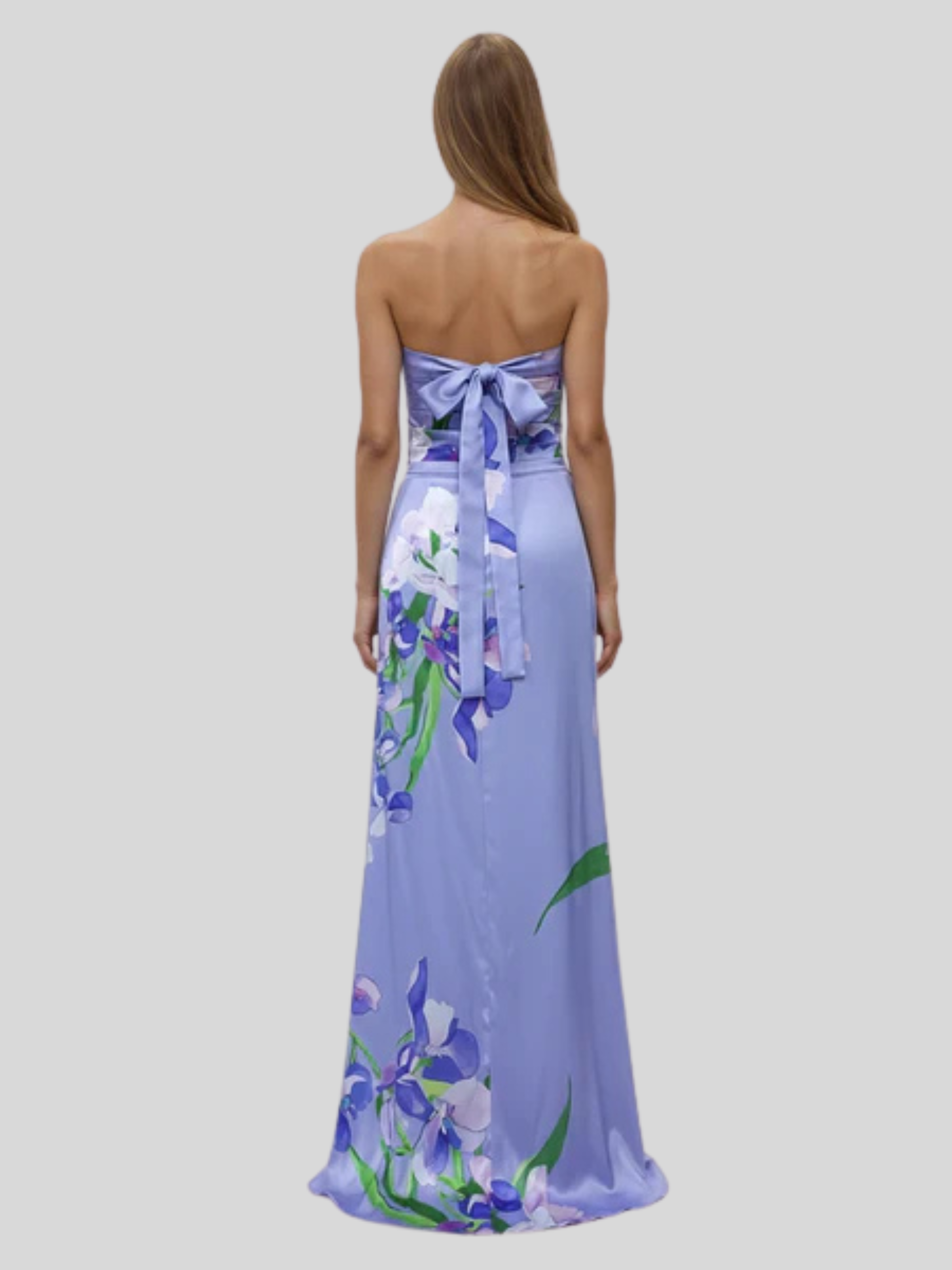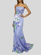The lavender ground is brought to life with a painterly floral motif in shades of violet, blush, and fresh green, placed to flatter the silhouette and create a sense of movement. Subtle pleating through the bodice adds structure while maintaining a light, feminine feel. The clean strapless neckline highlights the shoulders and décolletage, making it equally striking worn simply or styled with statement jewelry.