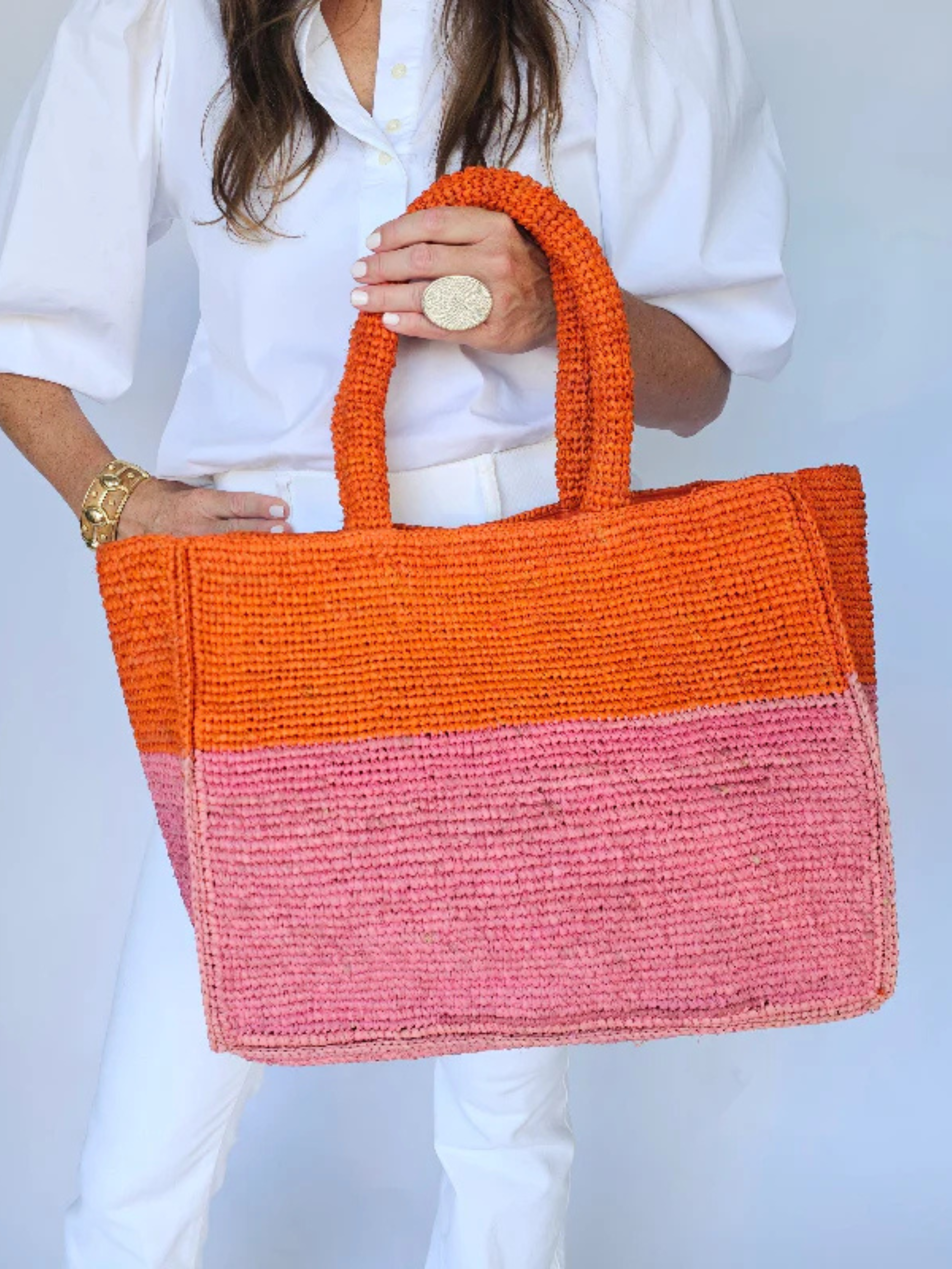 Add a burst of color to your wardrobe with this stunning two-toned raffia tote. Handcrafted with precision, this bag features vibrant orange and pink hues, making it a perfect accessory for a day at the beach, a weekend getaway, or as your everyday go-to bag. The spacious interior and durable design ensure it can handle all your essentials while complementing any outfit with its chic and timeless design.