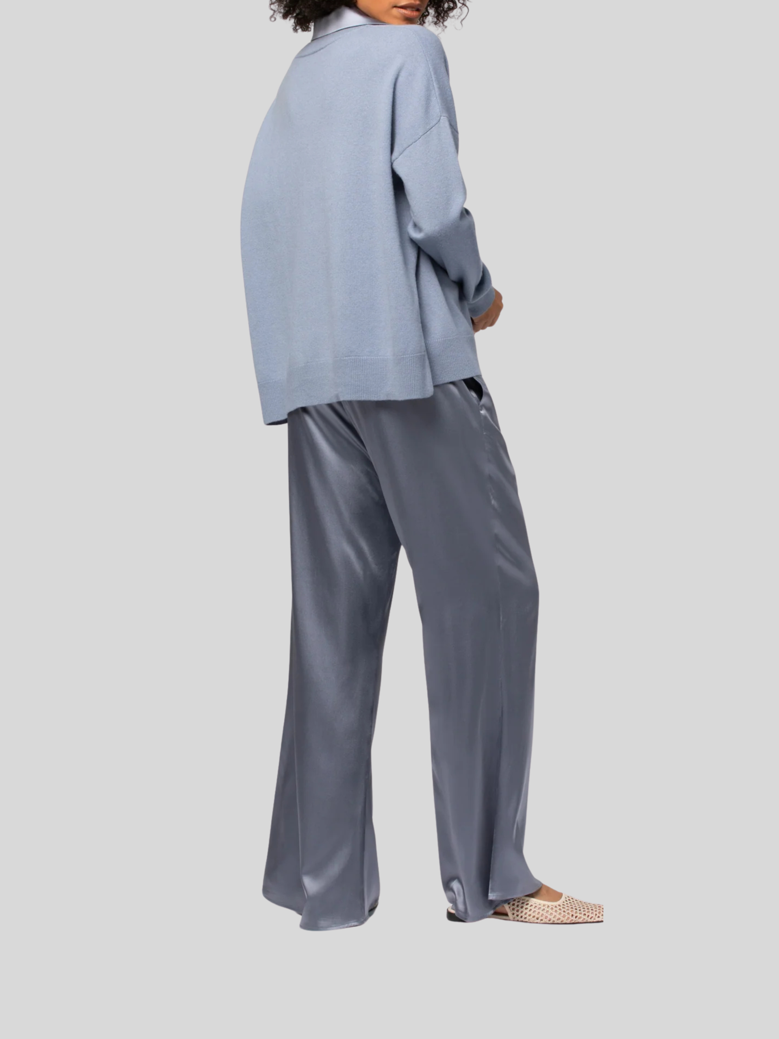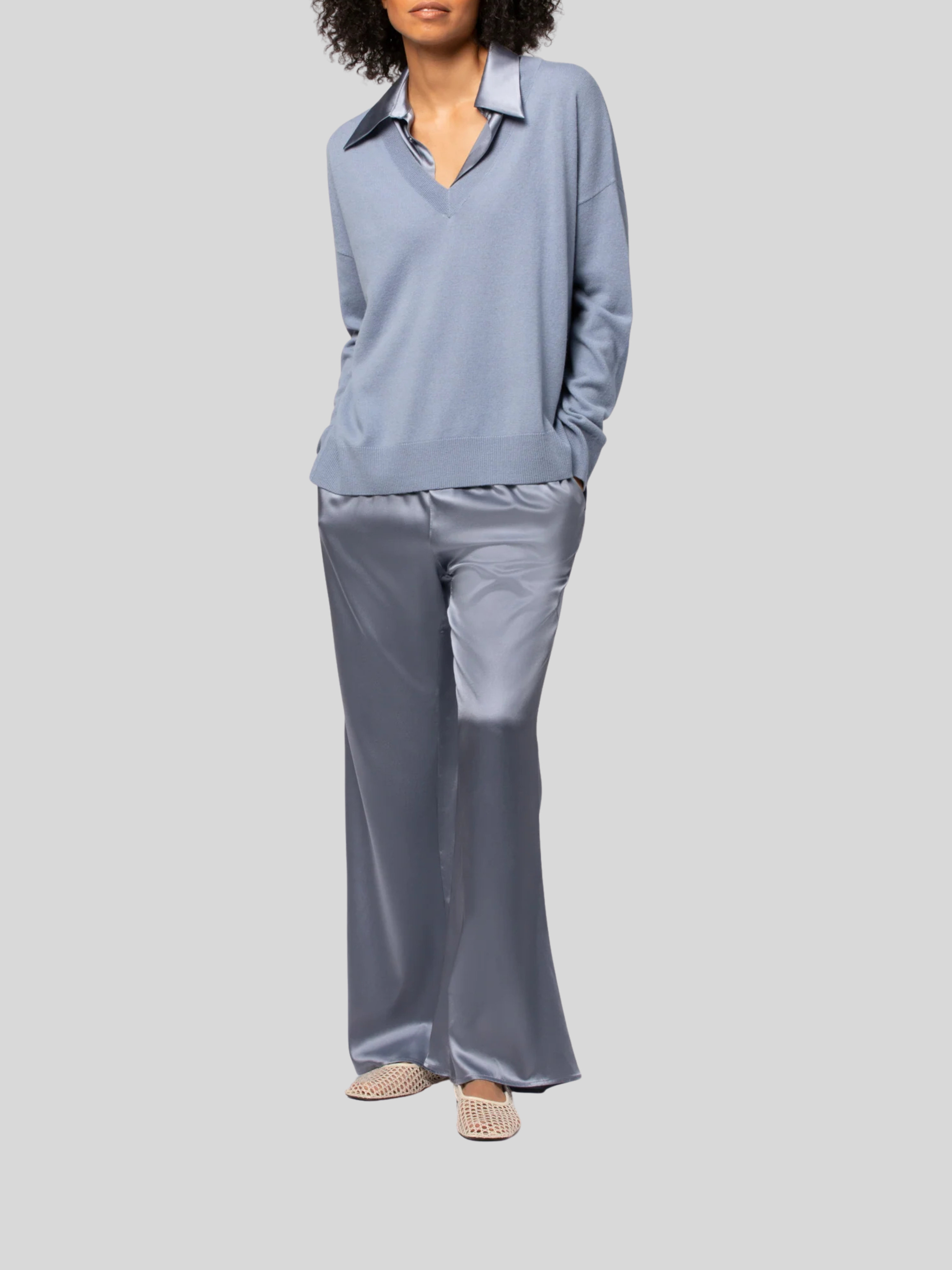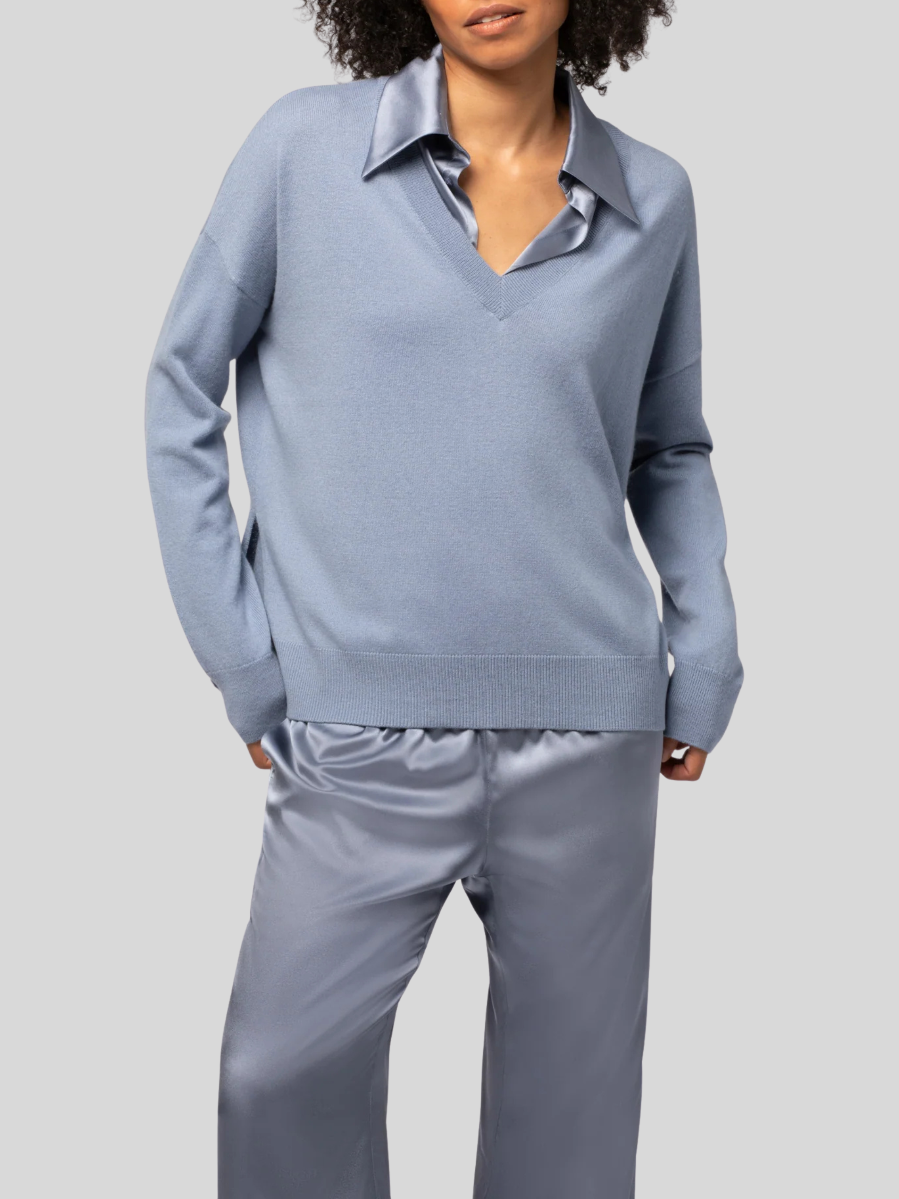 Its V-neck jersey collar is enhanced by an integrated silk shirt-style collar, creating a chic, modern layered effect without the constraints of styling. The relaxed fit, finished with two side slits, adds ease and fluidity to the silhouette.