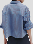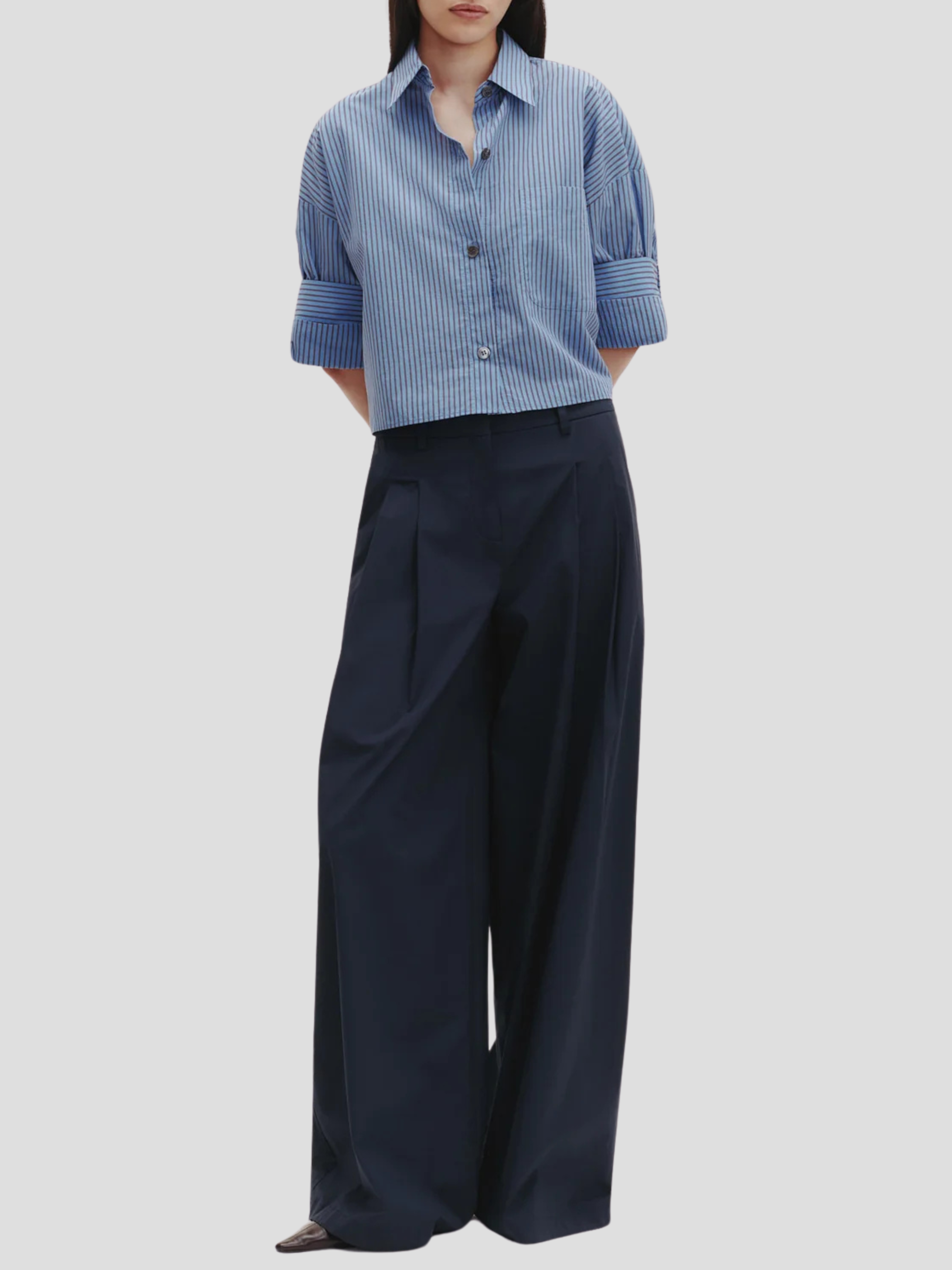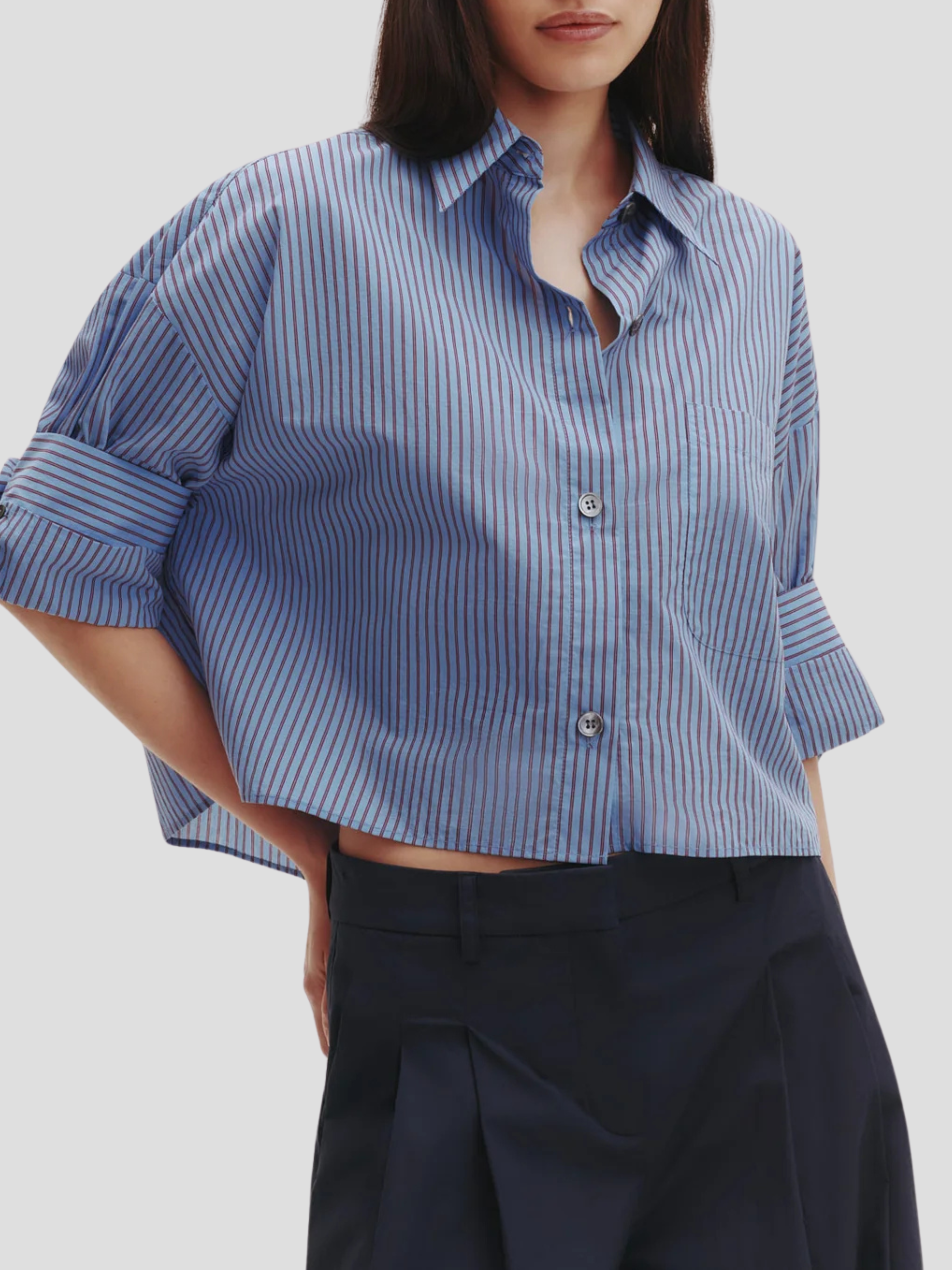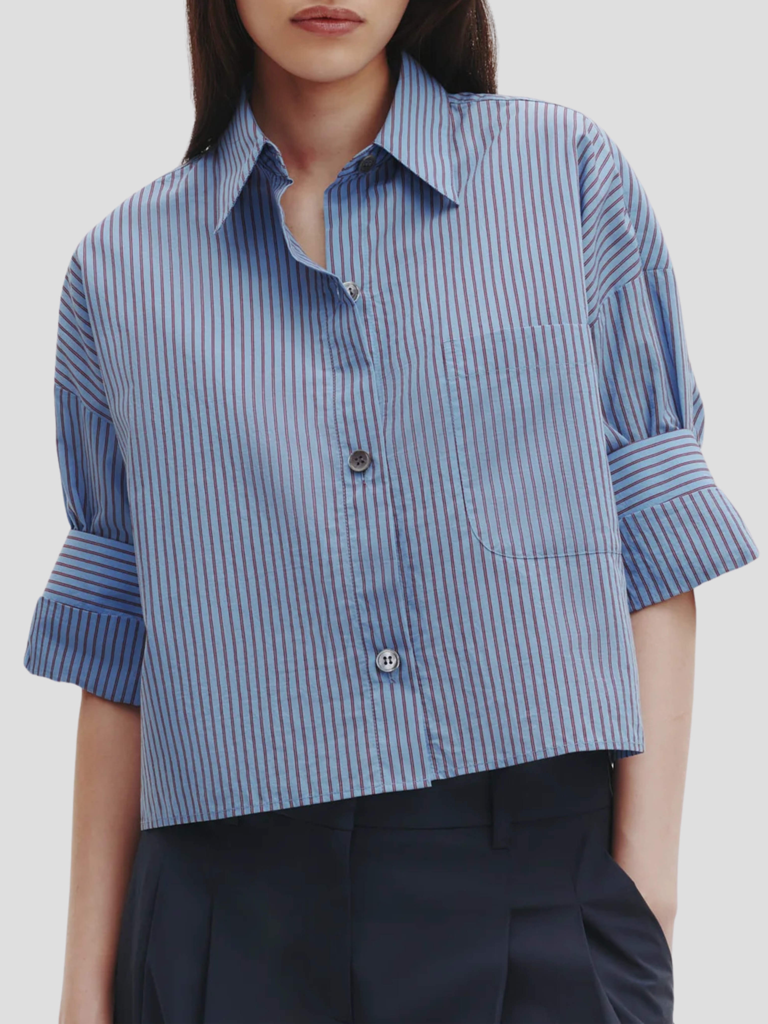 Cropped, short sleeved button down in striped Italian cotton shirting. The Next Ex is a cropped, boxy silhouette. Complete with a chest patch pocket, button up placket, spread collar, and our signature double roll button cuffs.