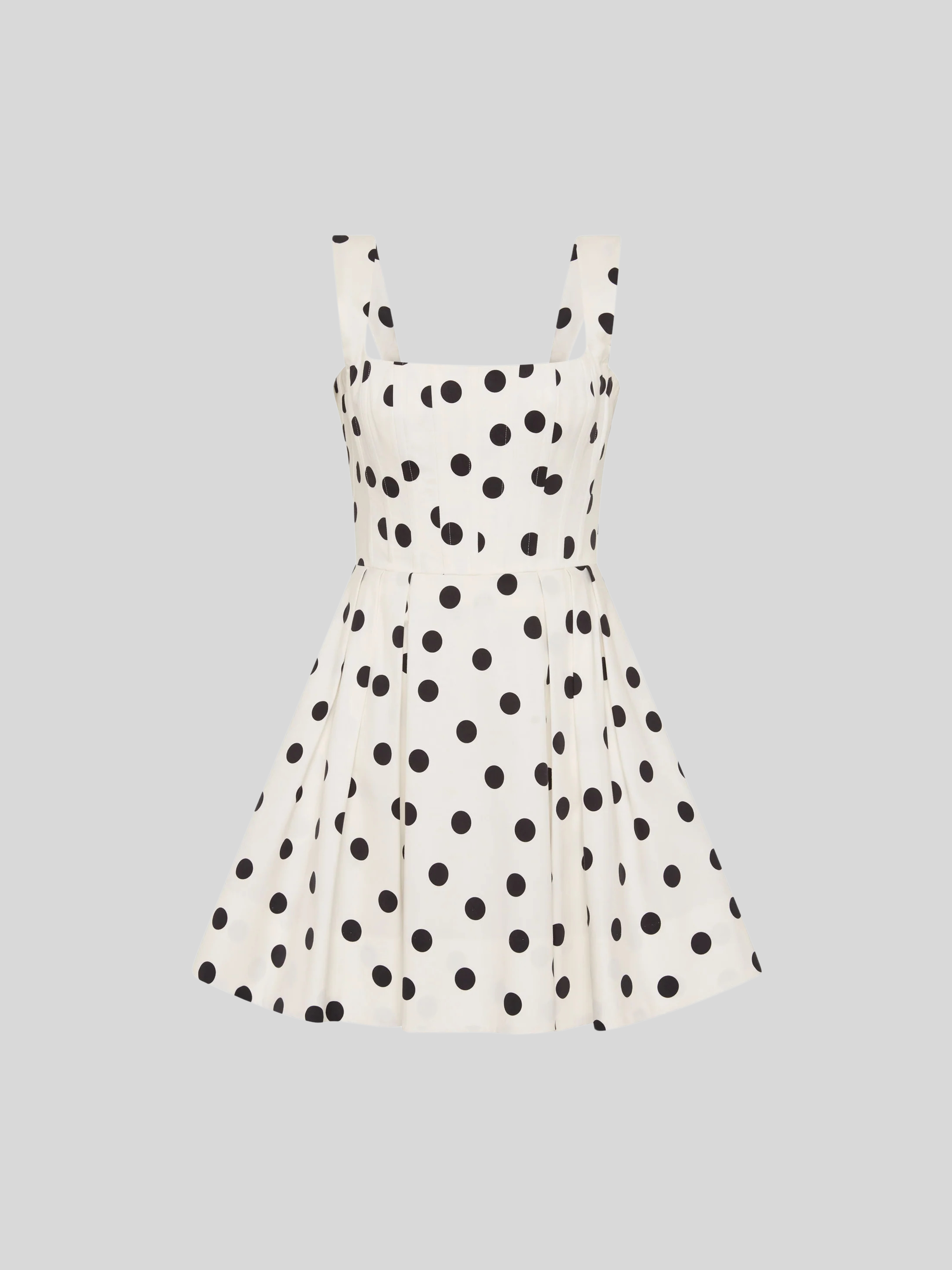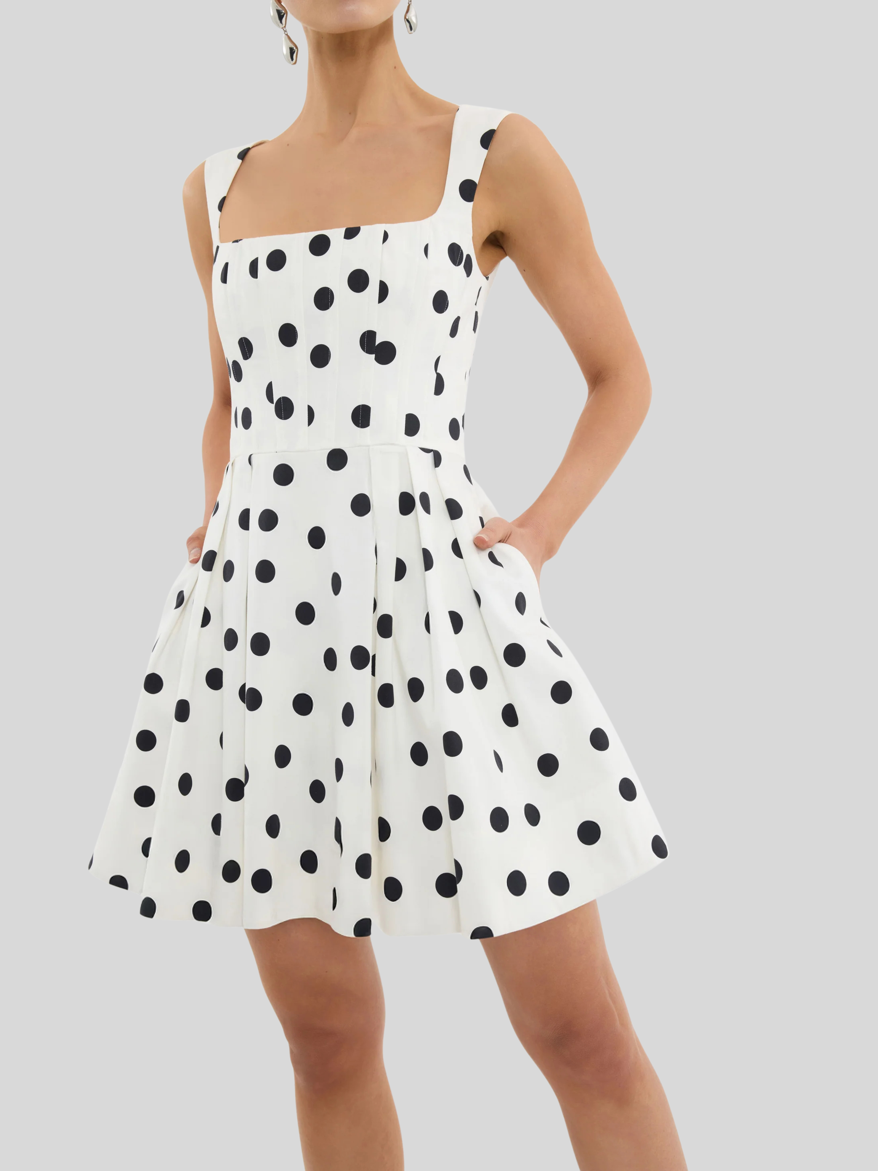 The Maisie Mini Dress exudes chic style, featuring an eye-catching monochrome polka dot print. Its corseted bodice and square neckline shape a feminine silhouette, supported by wide straps for utmost comfort. Cinched at the waist, the circular mini skirt is detailed with side seam pockets for added convenience, while an invisible zip fastening at the back ensures a secure fit. Fully lined, this dress is perfect for both day and evening occasions.