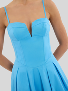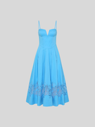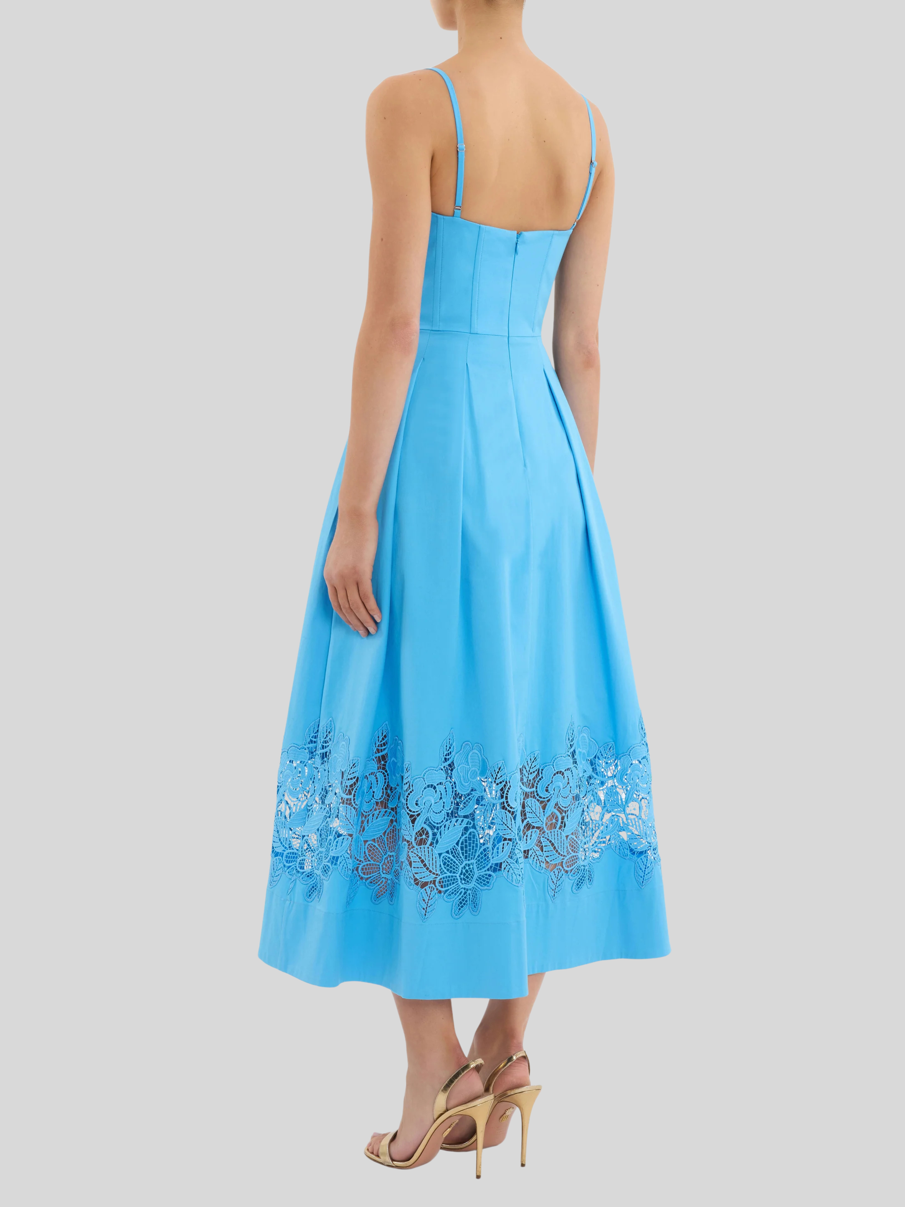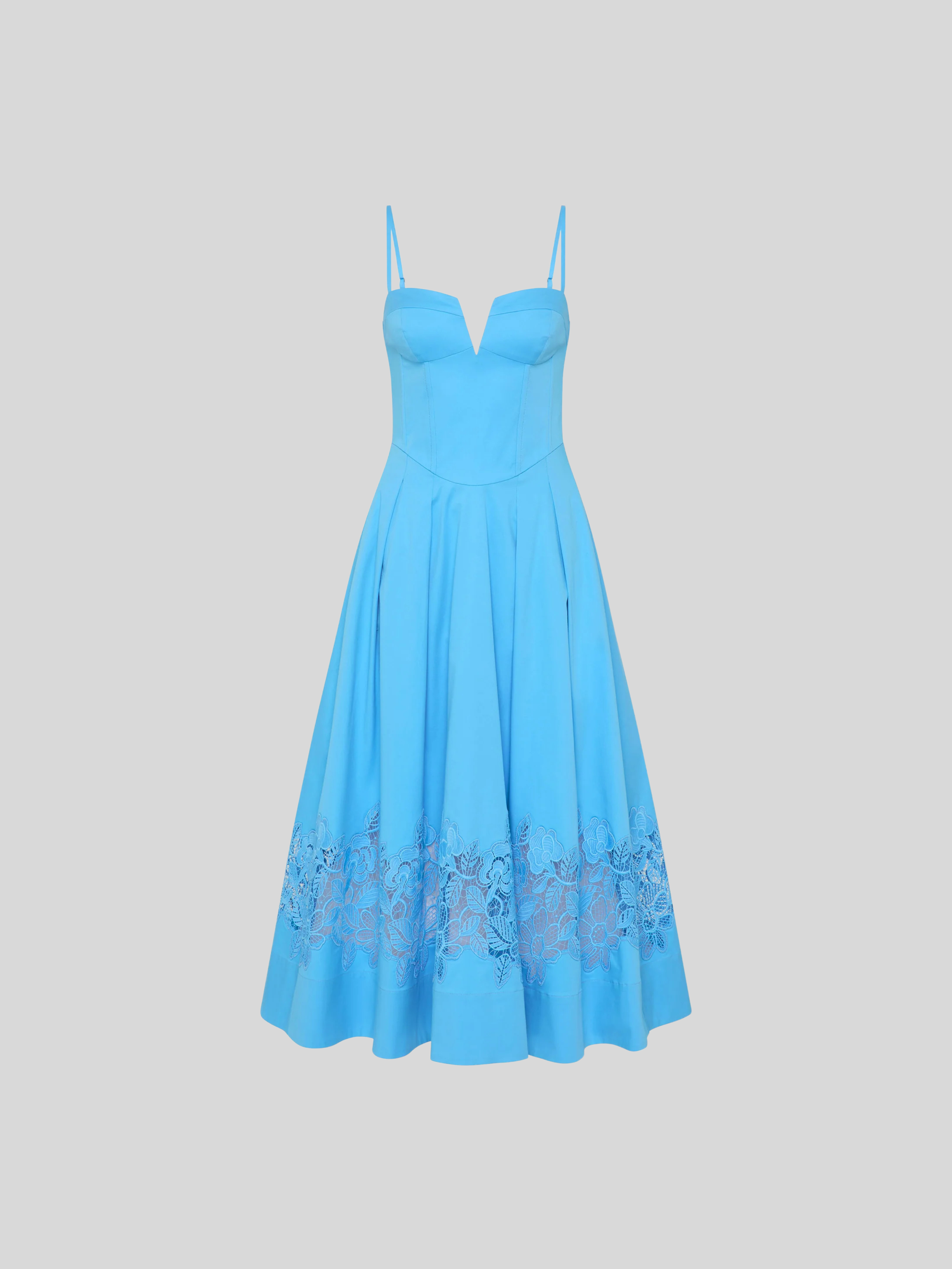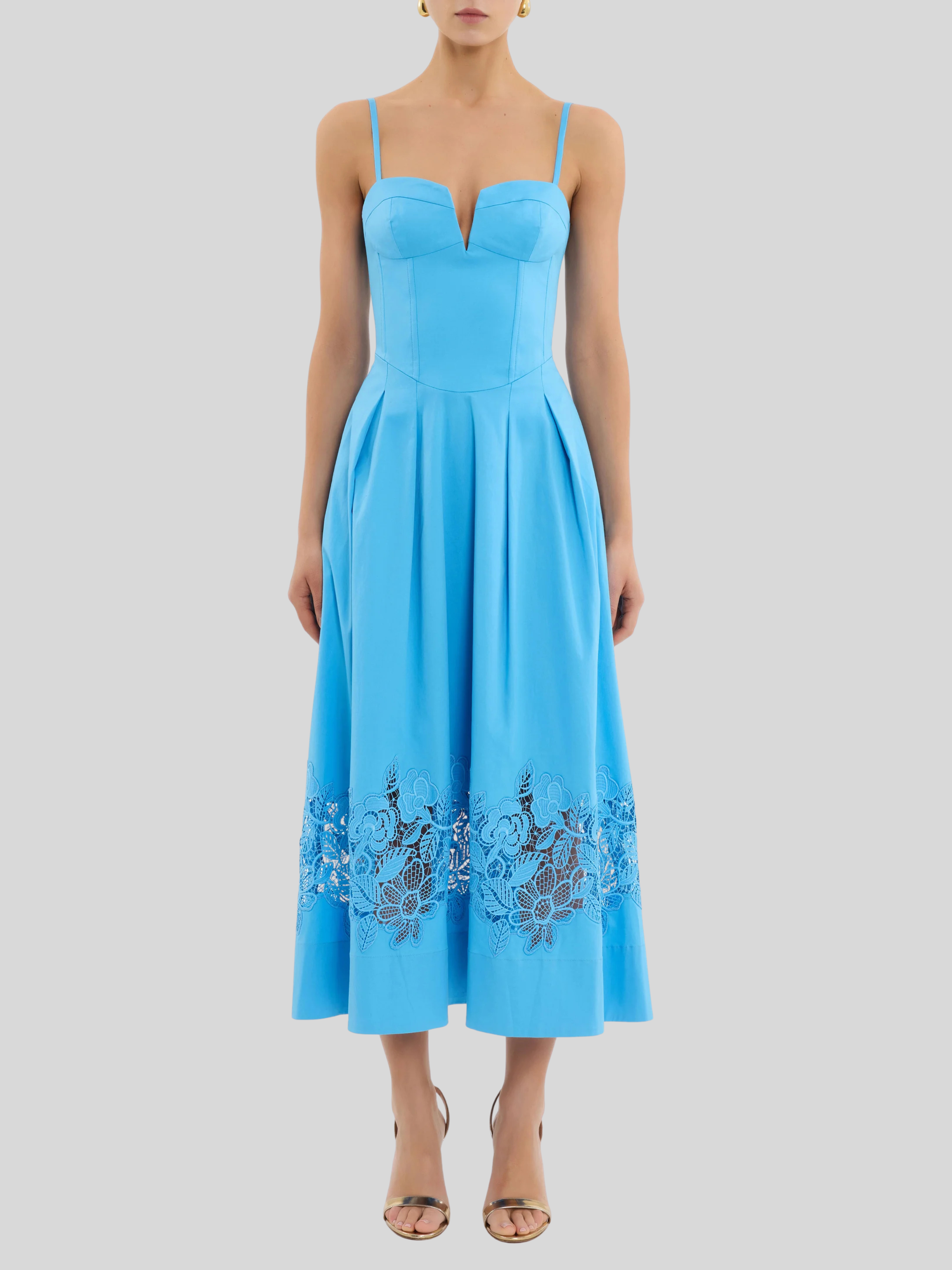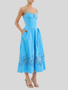 The Montreux Midi Dress stuns in a vibrant blue hue, adorned with intricate lace detailing. Its sweetheart neckline and fitted bodice, designed with soft cups and internal boning, sculpt a feminine silhouette, enhanced by a curved drop waist that flatters the figure. Adjustable spaghetti straps and side seam pockets ensure ease of wear, while a zip fastening at the back provides a precise fit. Complete with lining, this dress is the epitome of polished sophistication.