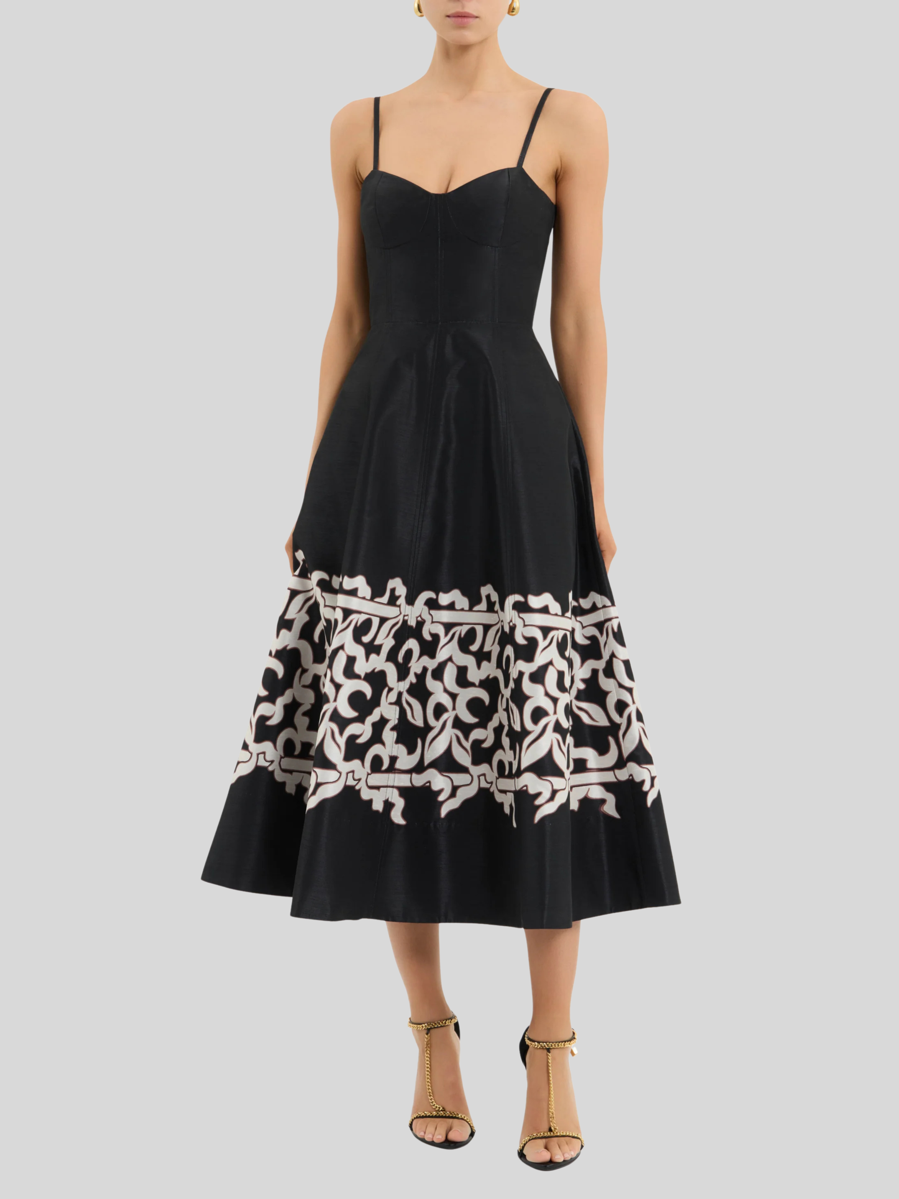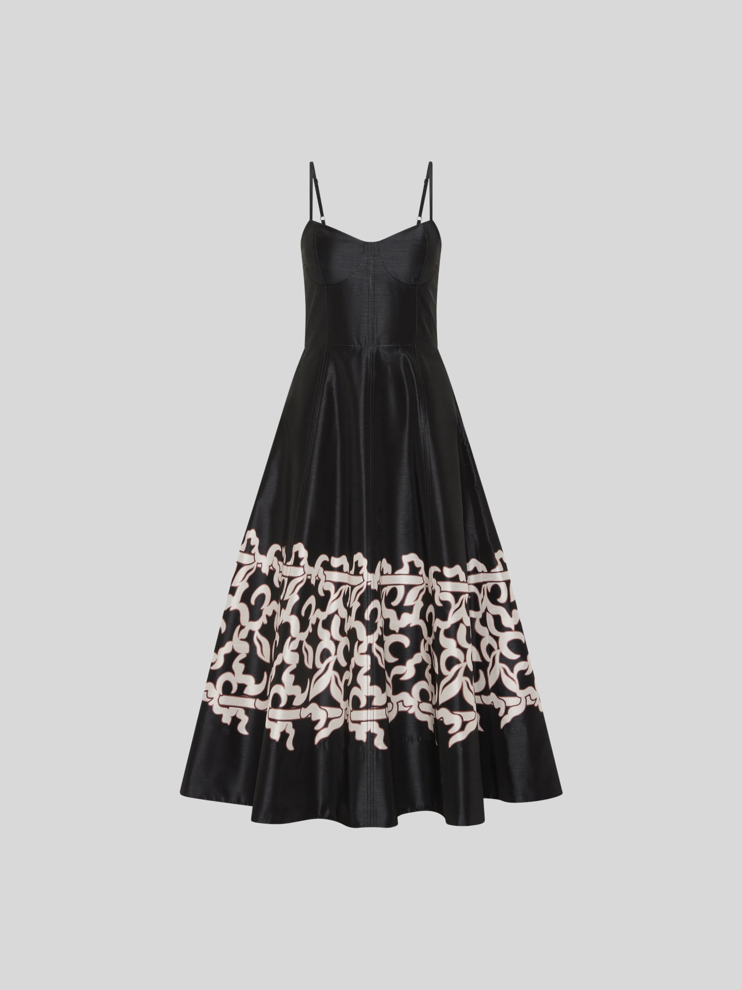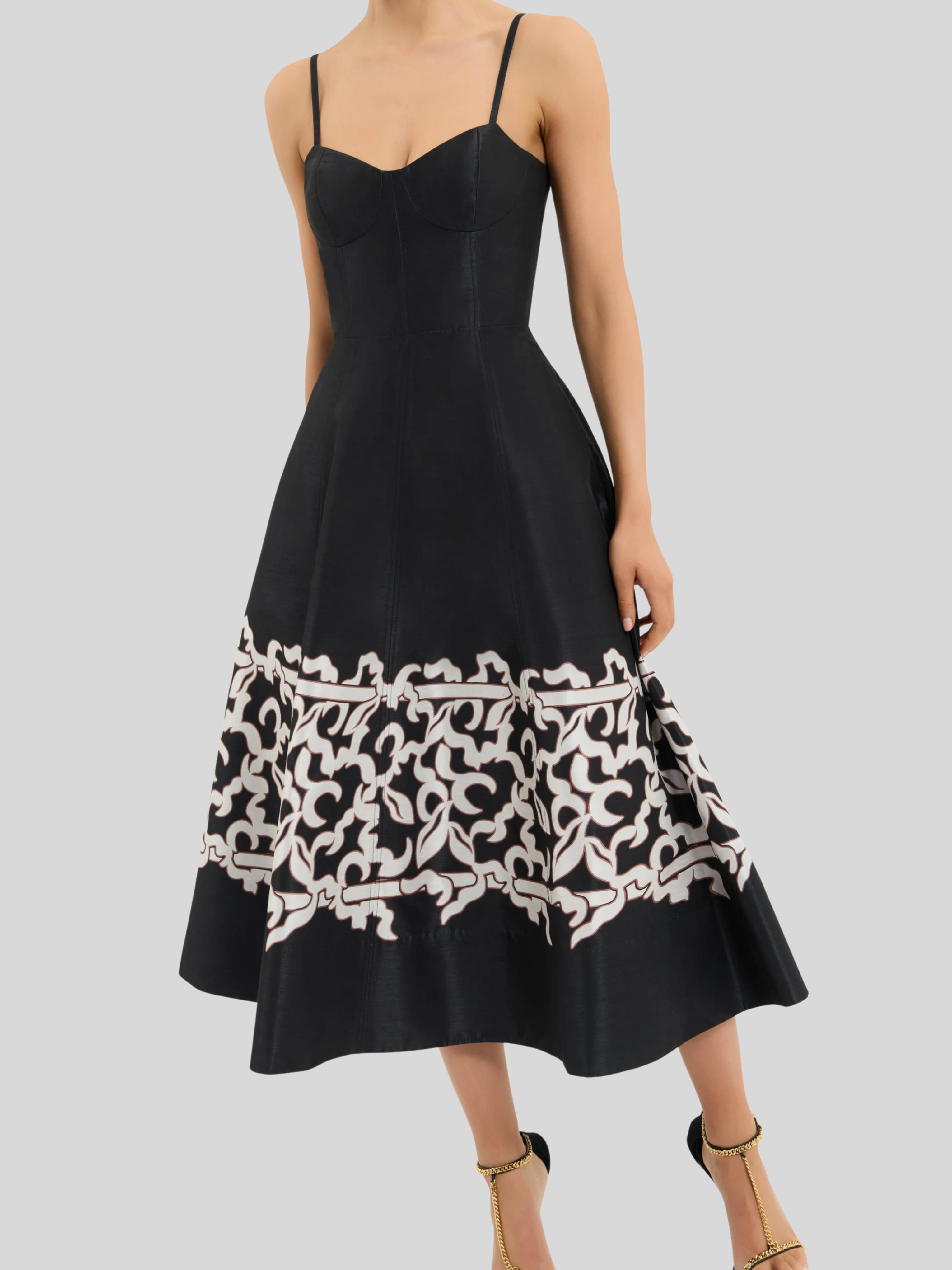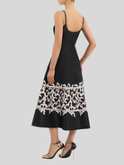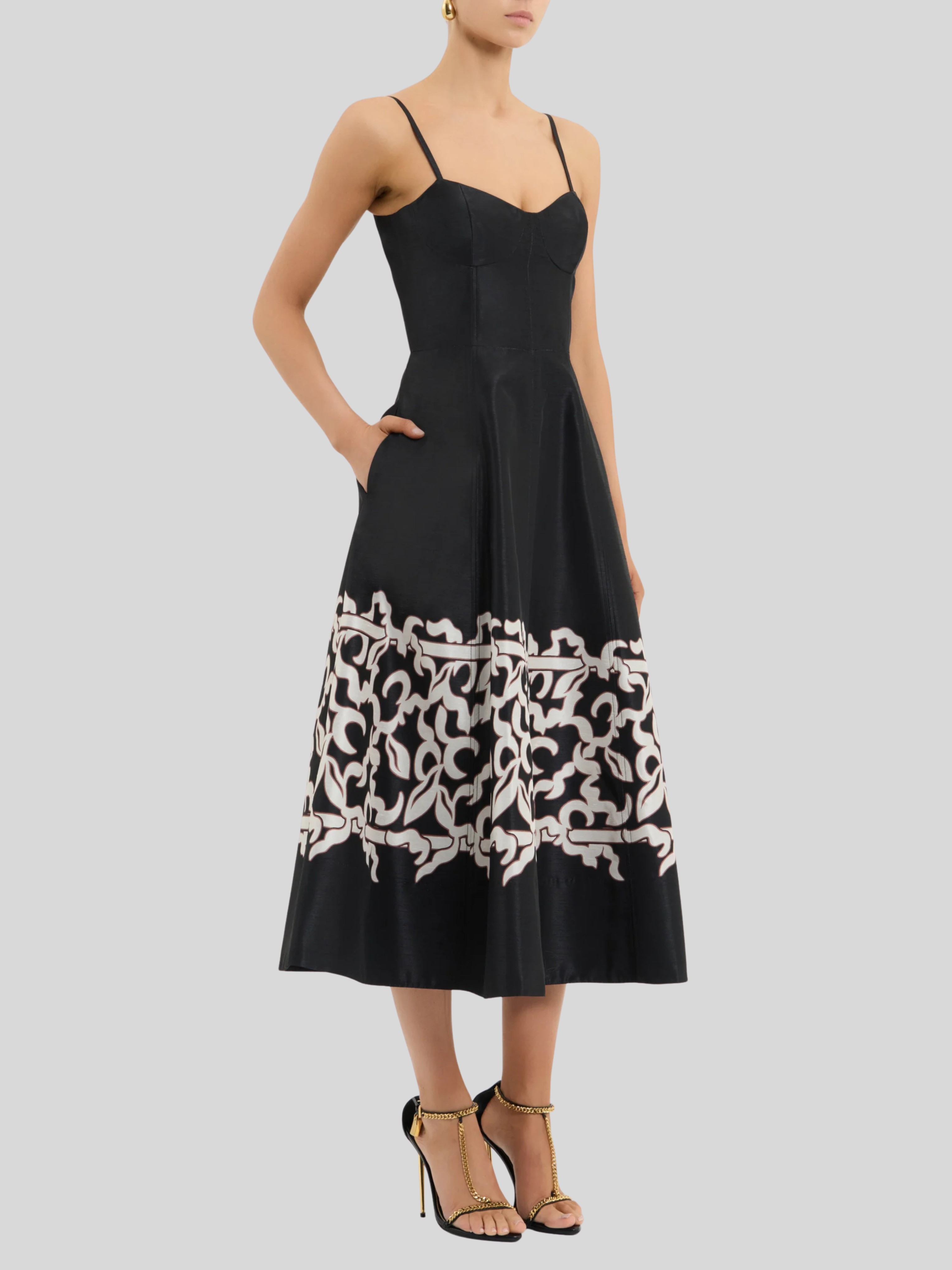 The Sundia Midi Dress in black radiates chic sophistication. Featuring a sweetheart neckline, its fitted bodice with soft cups shapes a flattering figure, structured with adjustable spaghetti straps for comfort. The circular midi skirt is cinched at the waist to accentuate the elegant silhouette, enhanced with side seam pockets for convenience. Fully lined and finished with a zip fastening at the back, this versatile dress is a timeless staple.