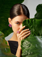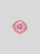 The Rose Sugarloaf Ring is handcrafted with Purple Sweet Potato and Beetroot Fruit Gems™, with betalains contributing to hues of red and purple; Regenerative rose quartz; casted into the form of a layered cake, set with laboratory-grown and created pink and orange sapphires.