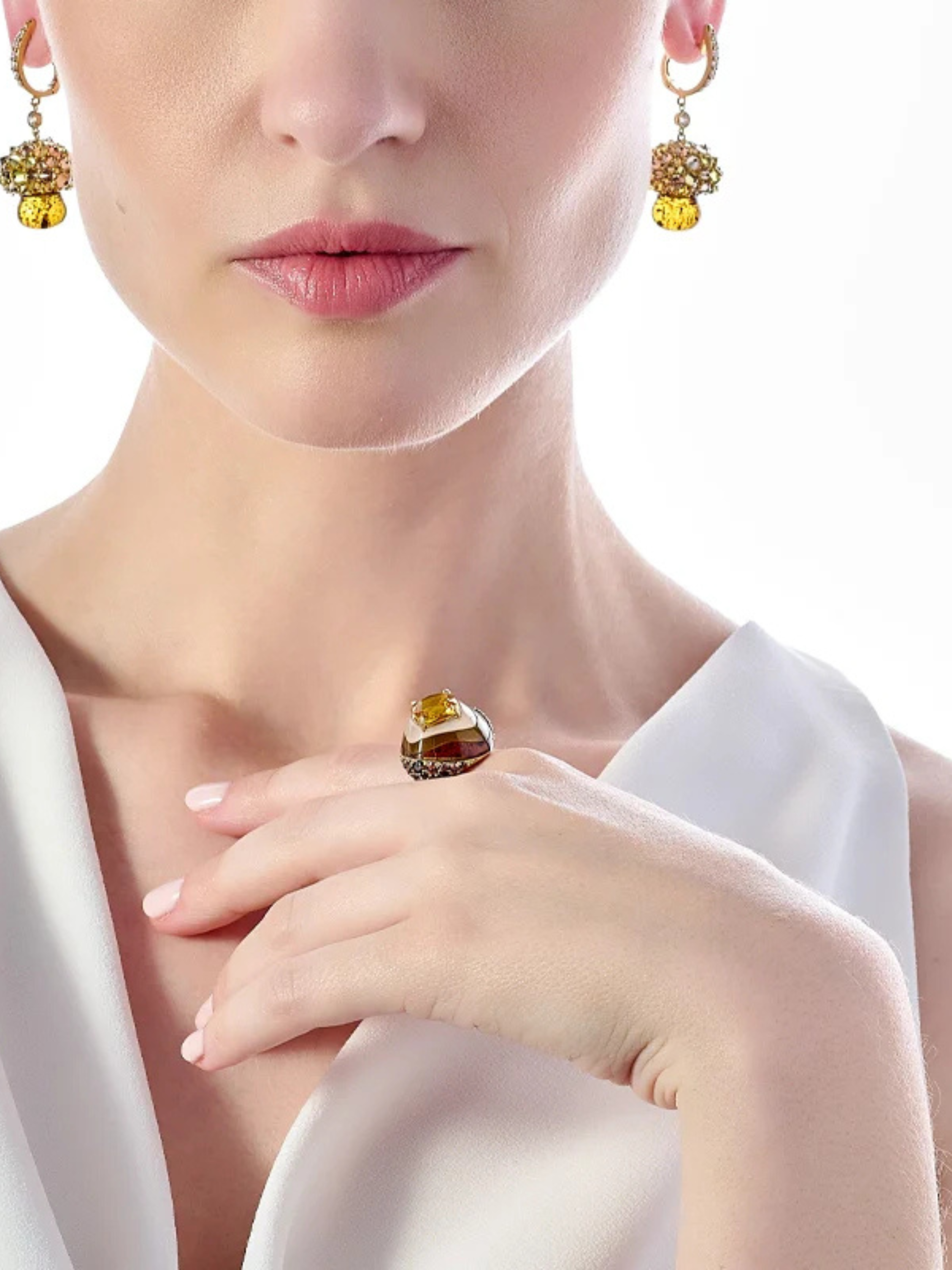 The Amber Virosa Earrings is handcrafted with Regenerative Amber, - with golden hues of a new Amber created with preserved autumn leaves and twigs; casted into the form of a toadstool, reverse-set with laboratory-grown and created yellow and champagne sapphires.