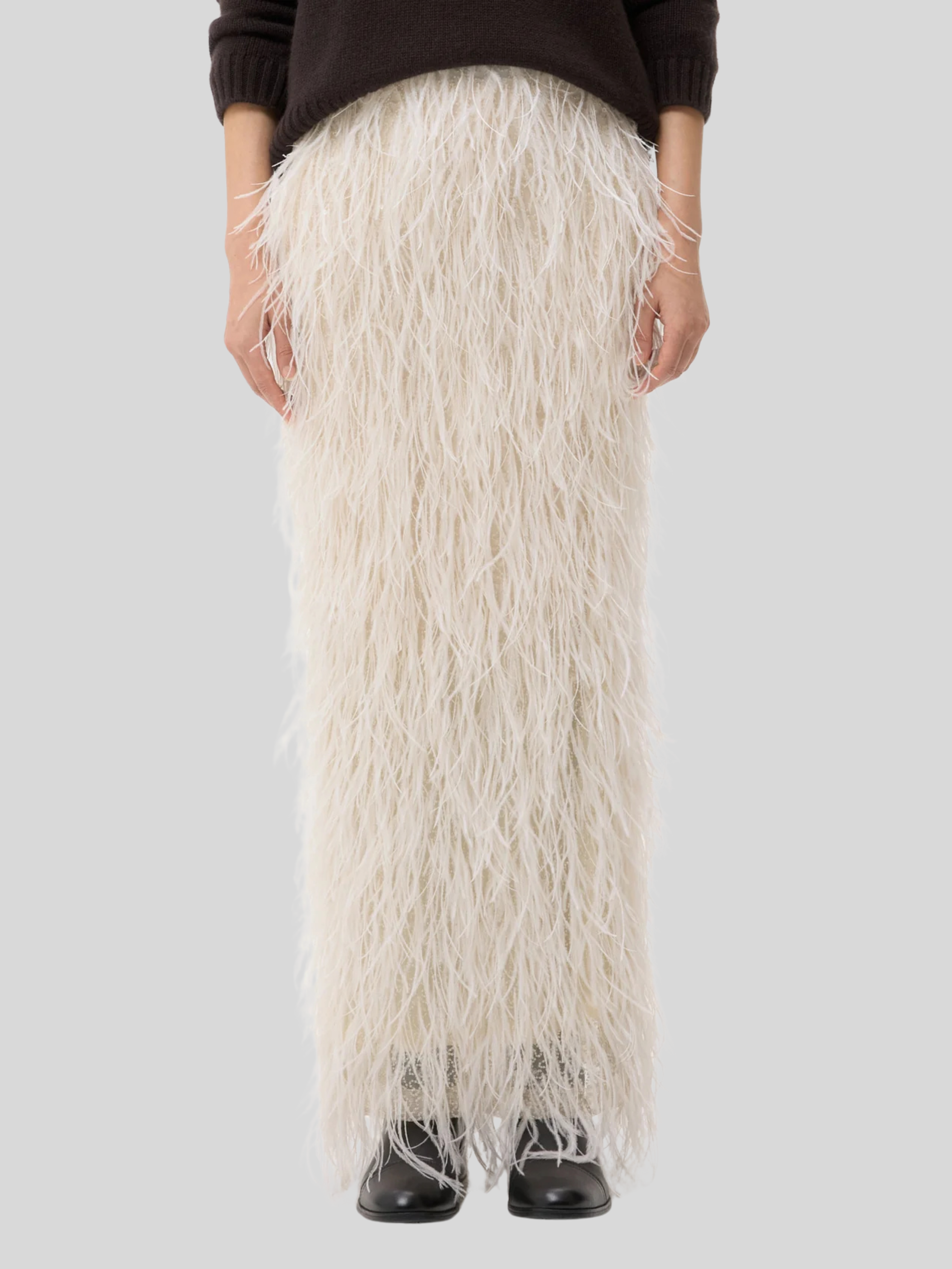 Mid-length skirt lined in silk georgette and embellished with glass beads and ostrich feathers on mesh. Light as a Feather has a fitted silhouette with a mid-rise waist. Complete with a back slit and hidden zipper.