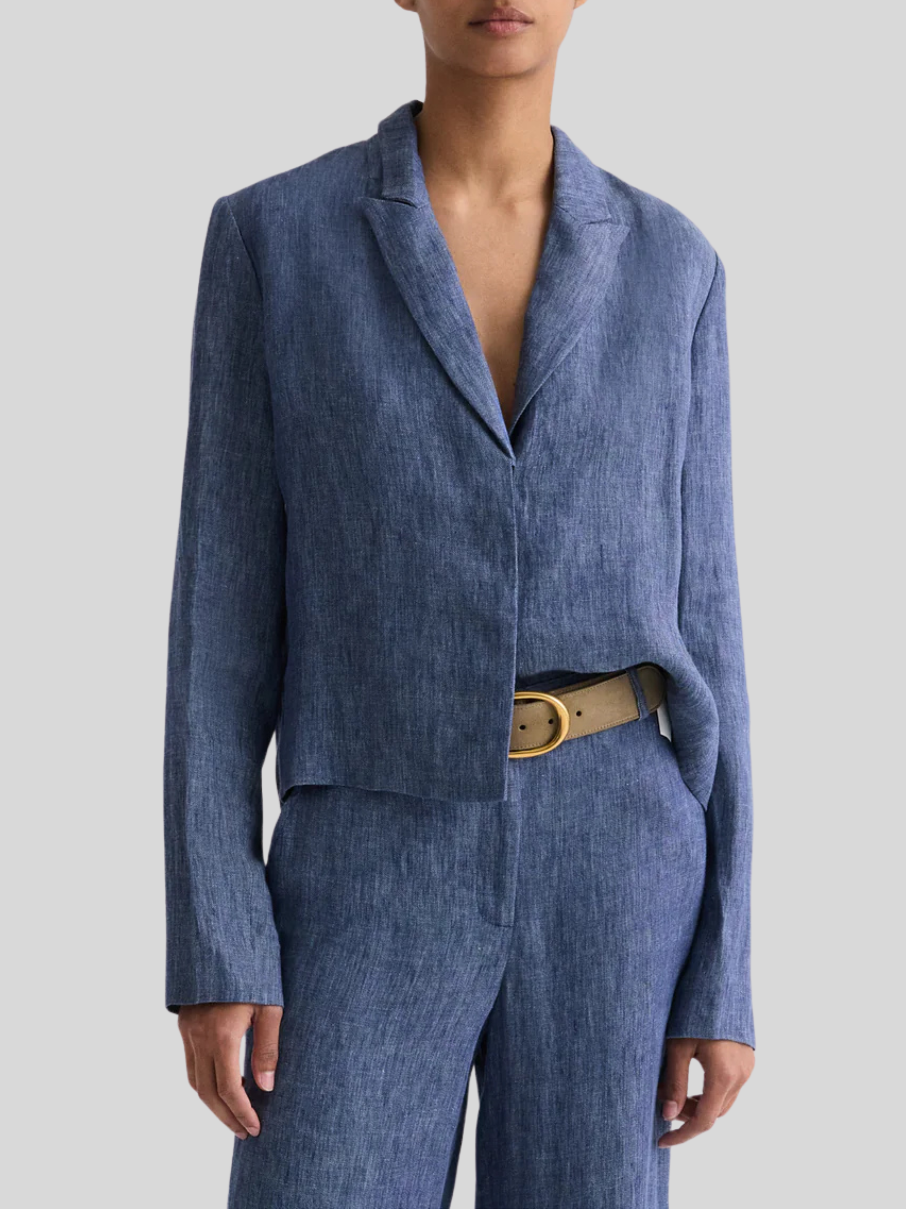 The Lucy Blazer in Hemp Denim combines tailored elegance with sustainable craftsmanship. Constructed from durable hemp denim, this structured blazer delivers a refined silhouette perfect for elevated everyday wear or professional settings. The natural fabric develops character over time, offering both timeless style and environmental consciousness. A versatile layering piece that transitions seamlessly from season to season, this blazer elevates any wardrobe with understated sophistication.