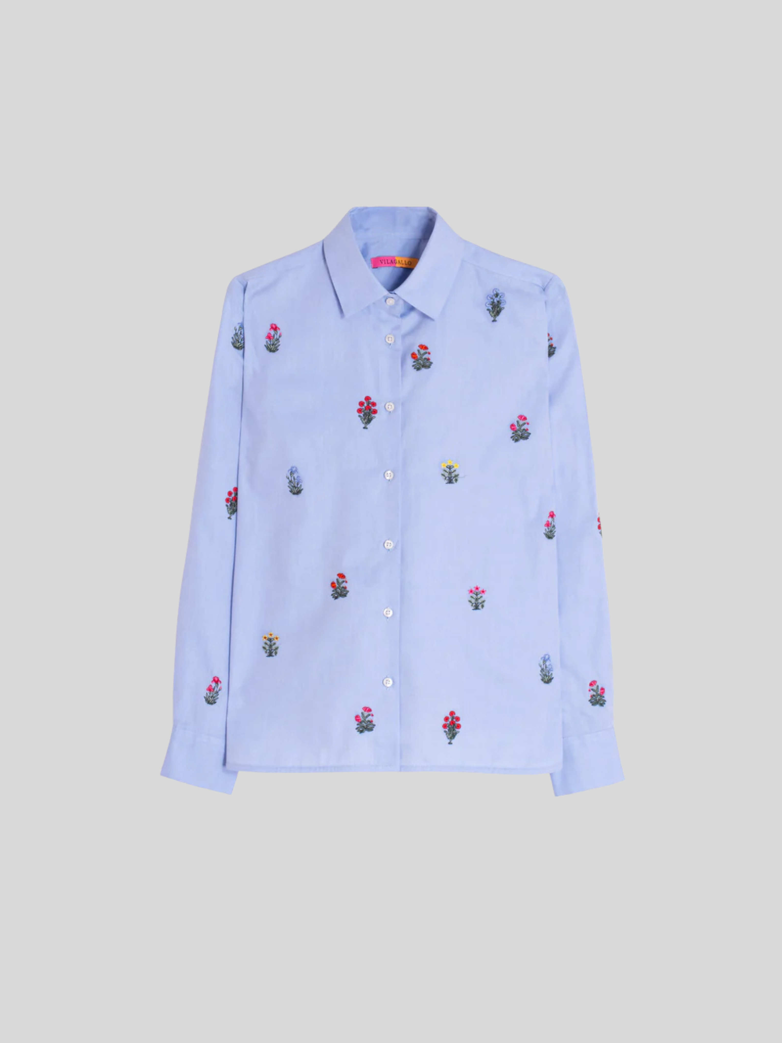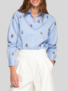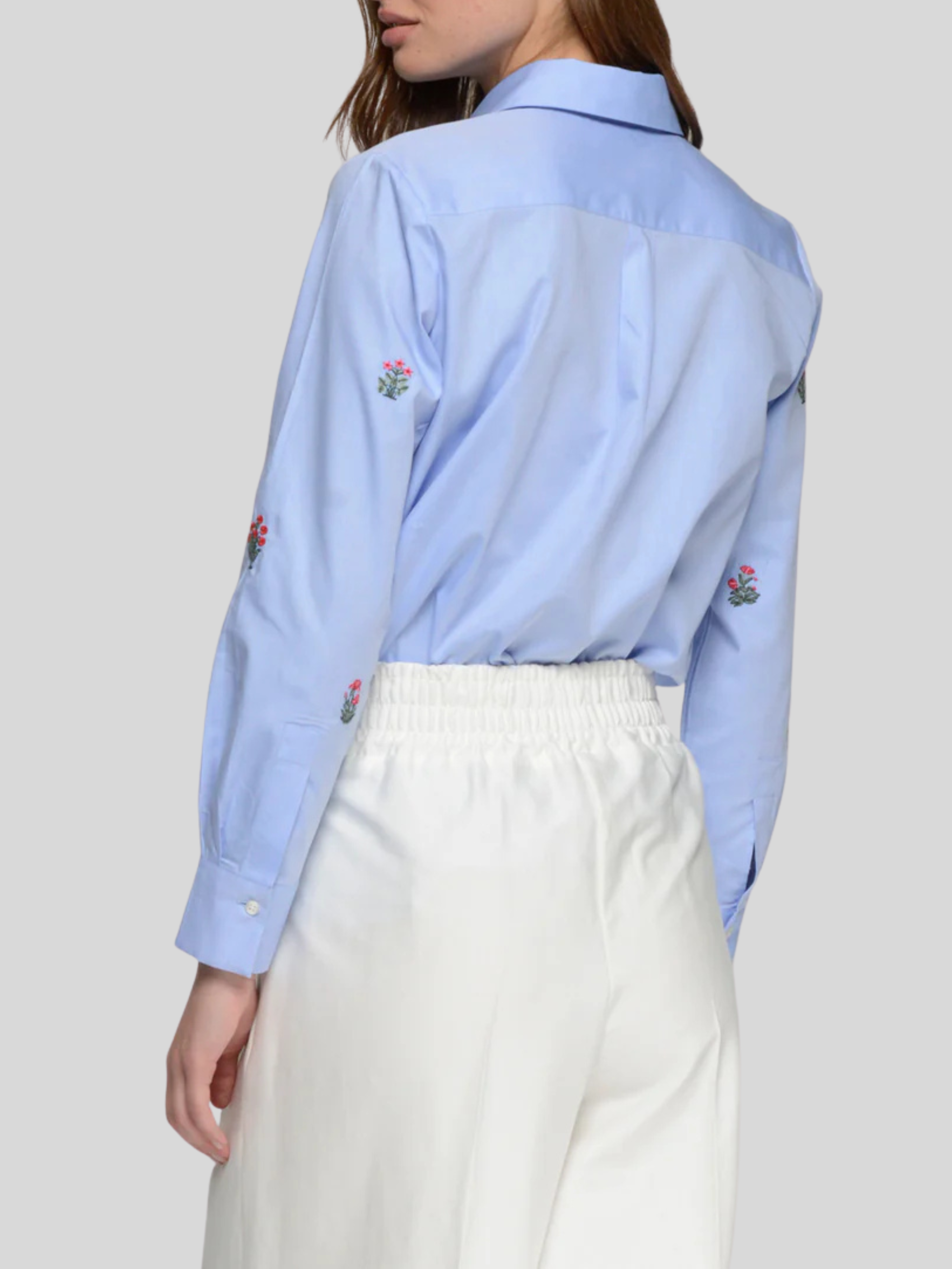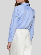 Classic-cut shirt with a shirt collar and button-front closure. Features floral embroidery on the front and sleeves. Long sleeves with buttoned cuffs and a straight hem.