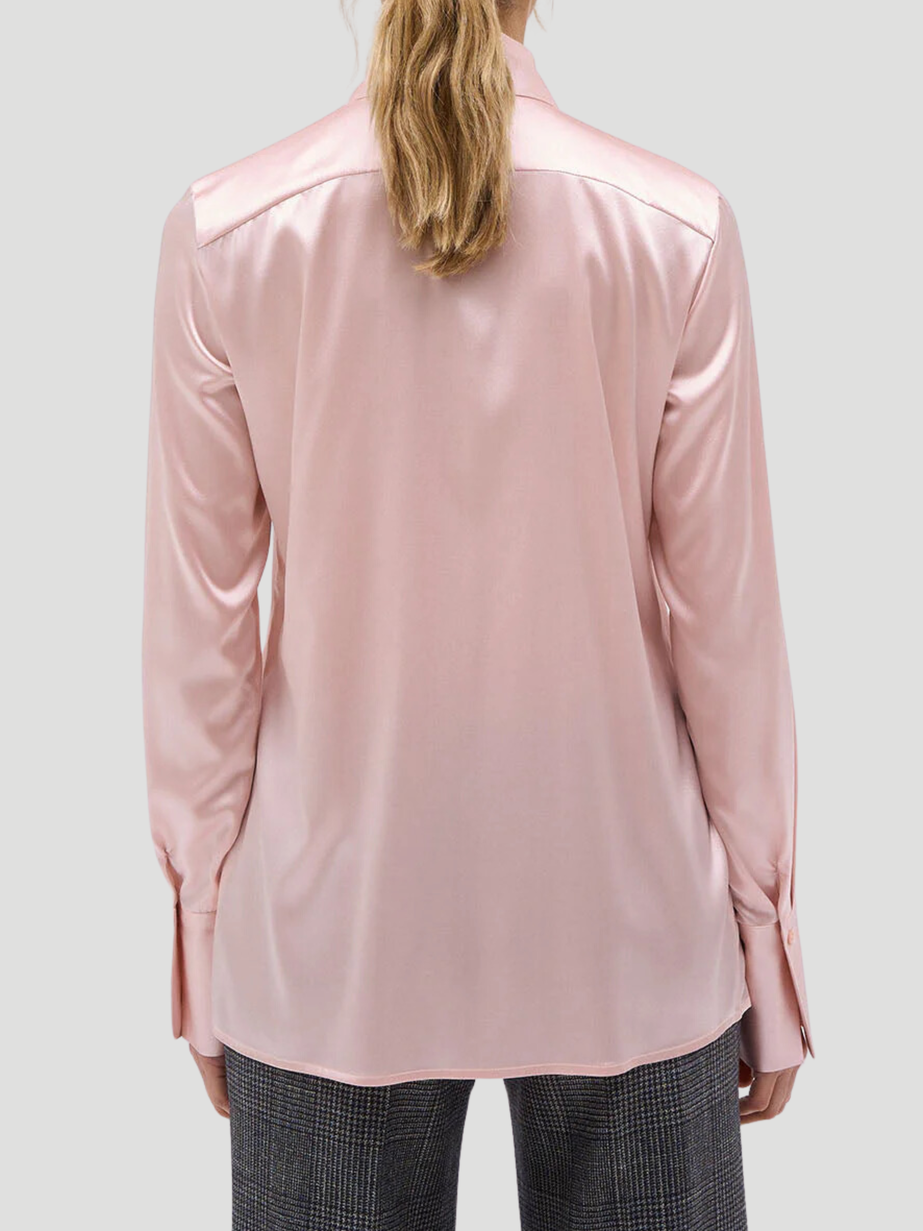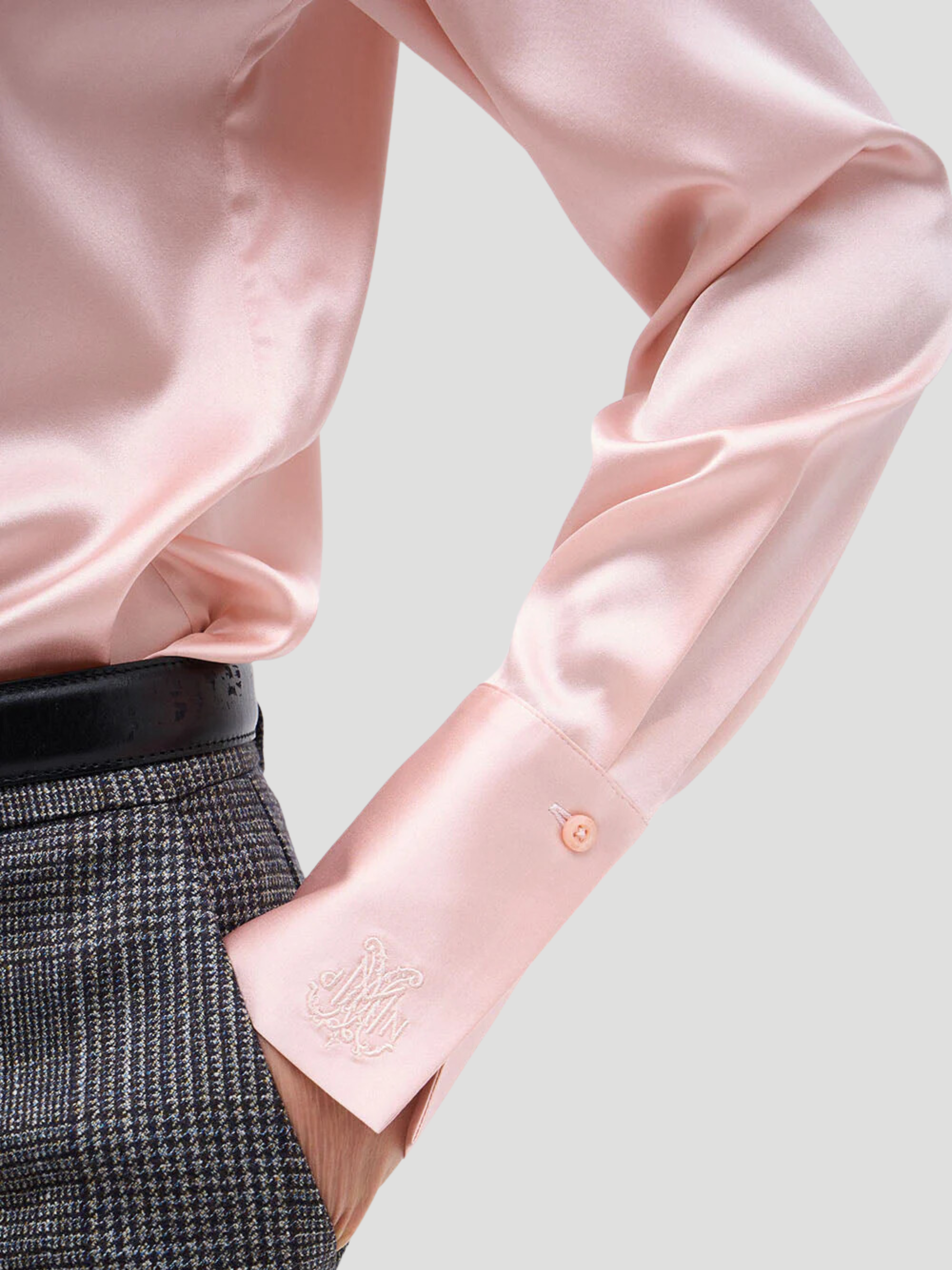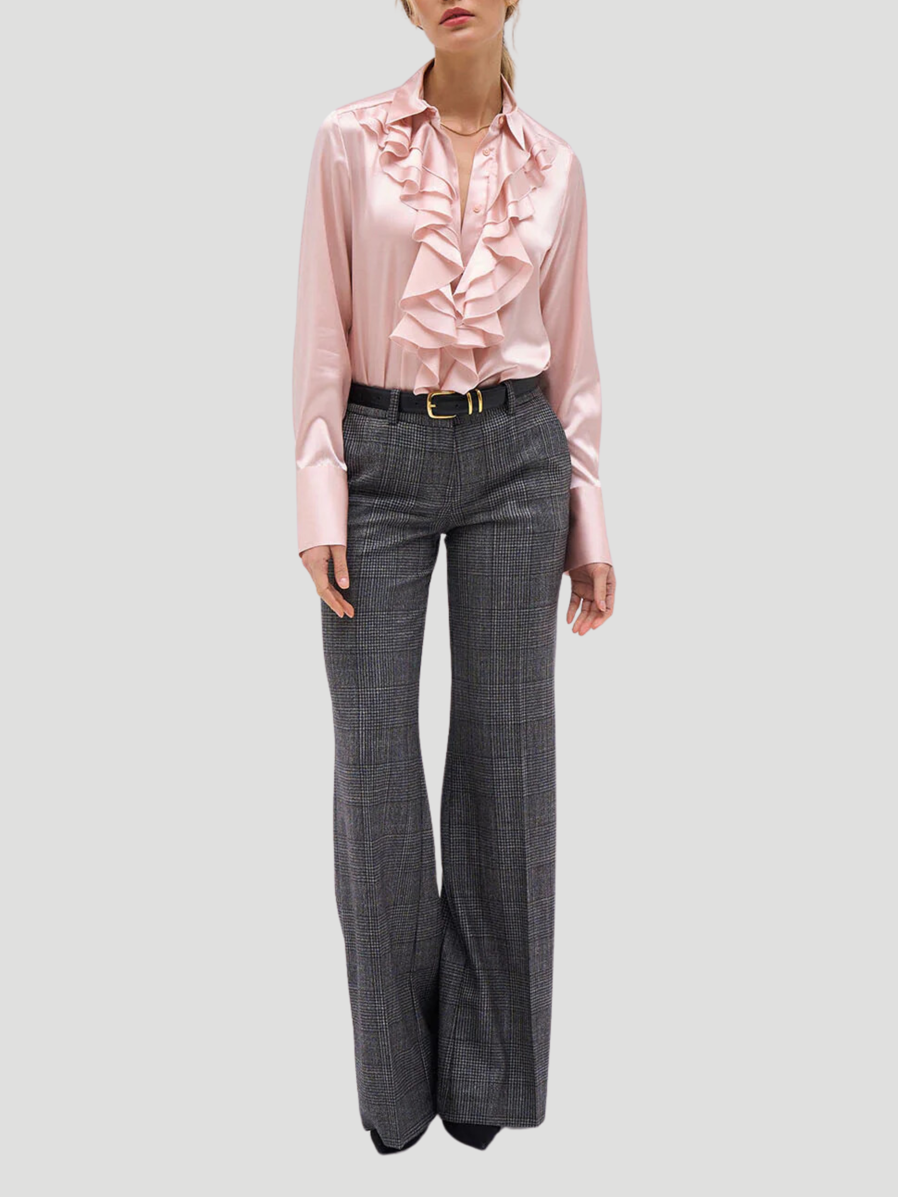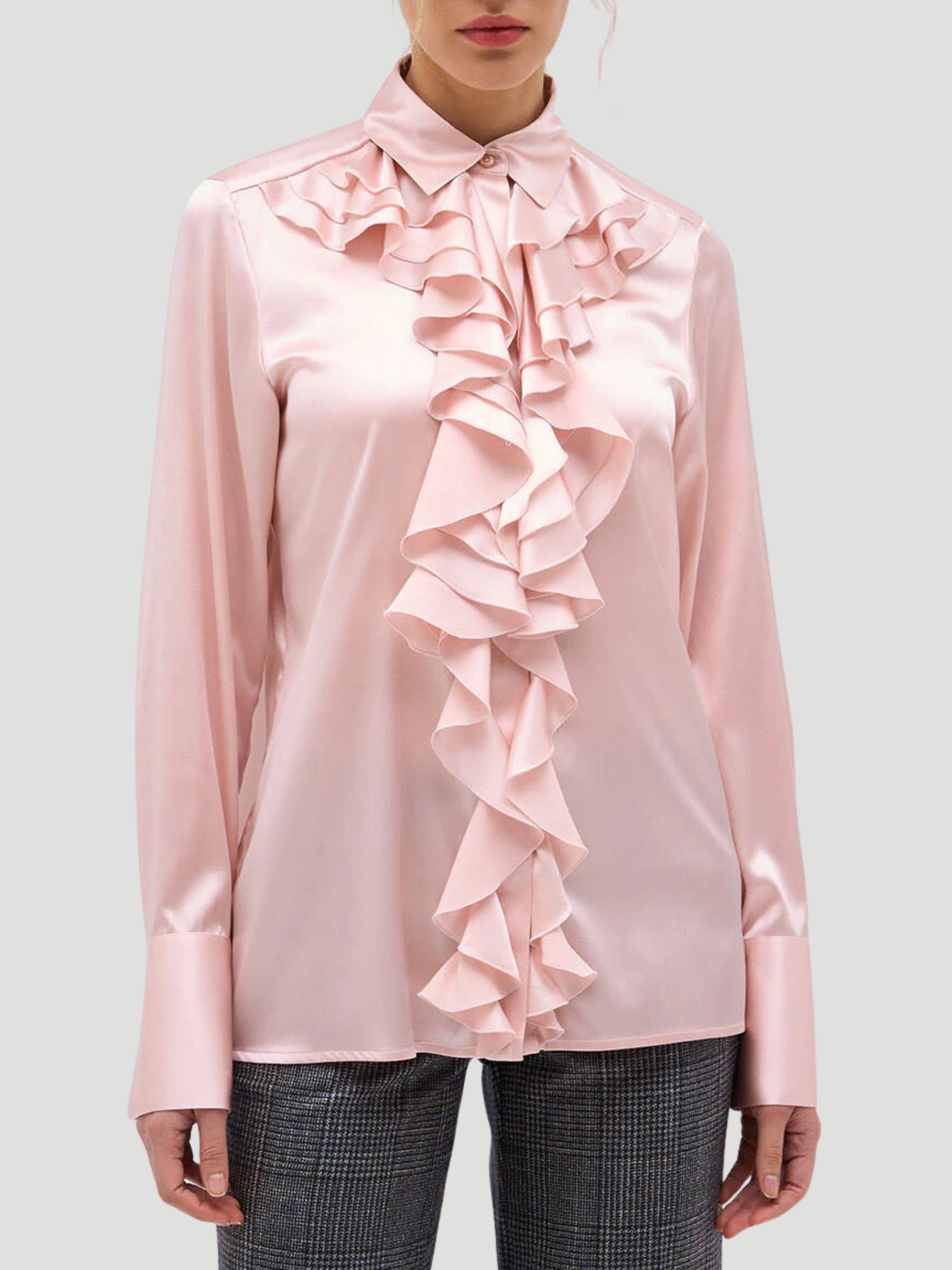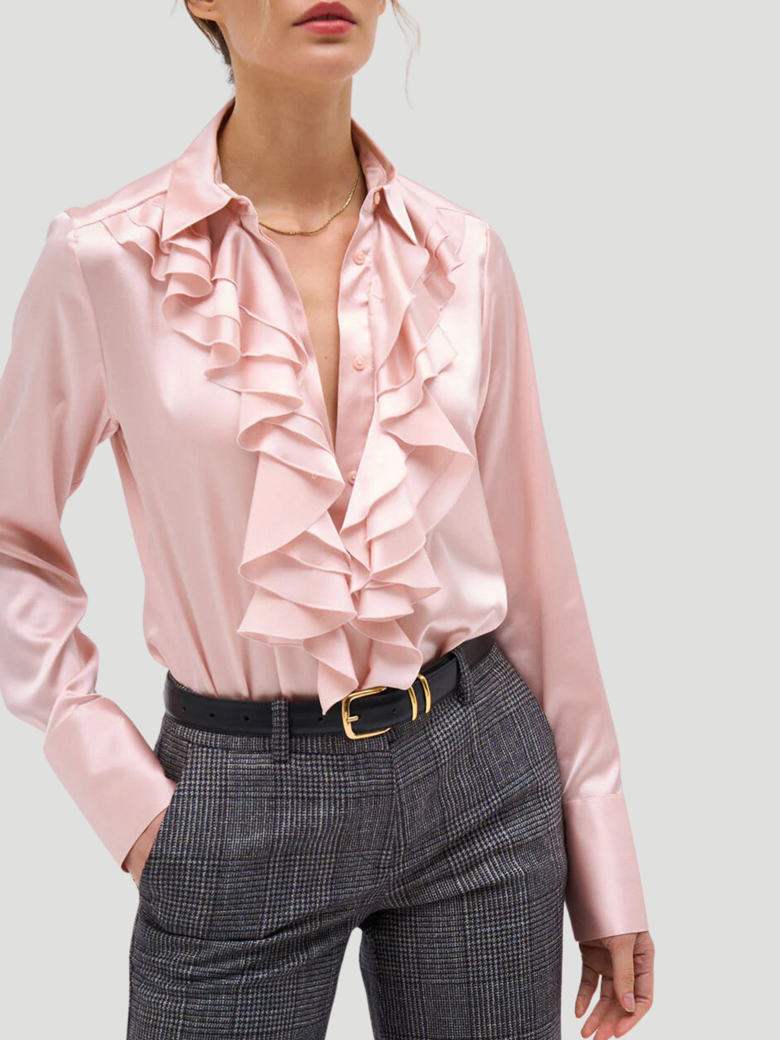 Introducing the Regina Jabot Front-Ruffle Blouse by DMN Paris. Crafted from luxurious stretch silk satin fabric, this belted shirt features a statement shirt collar and elegant long sleeves. The button closure under the placket adds a touch of sophistication. Elevate your wardrobe with this must-have piece.