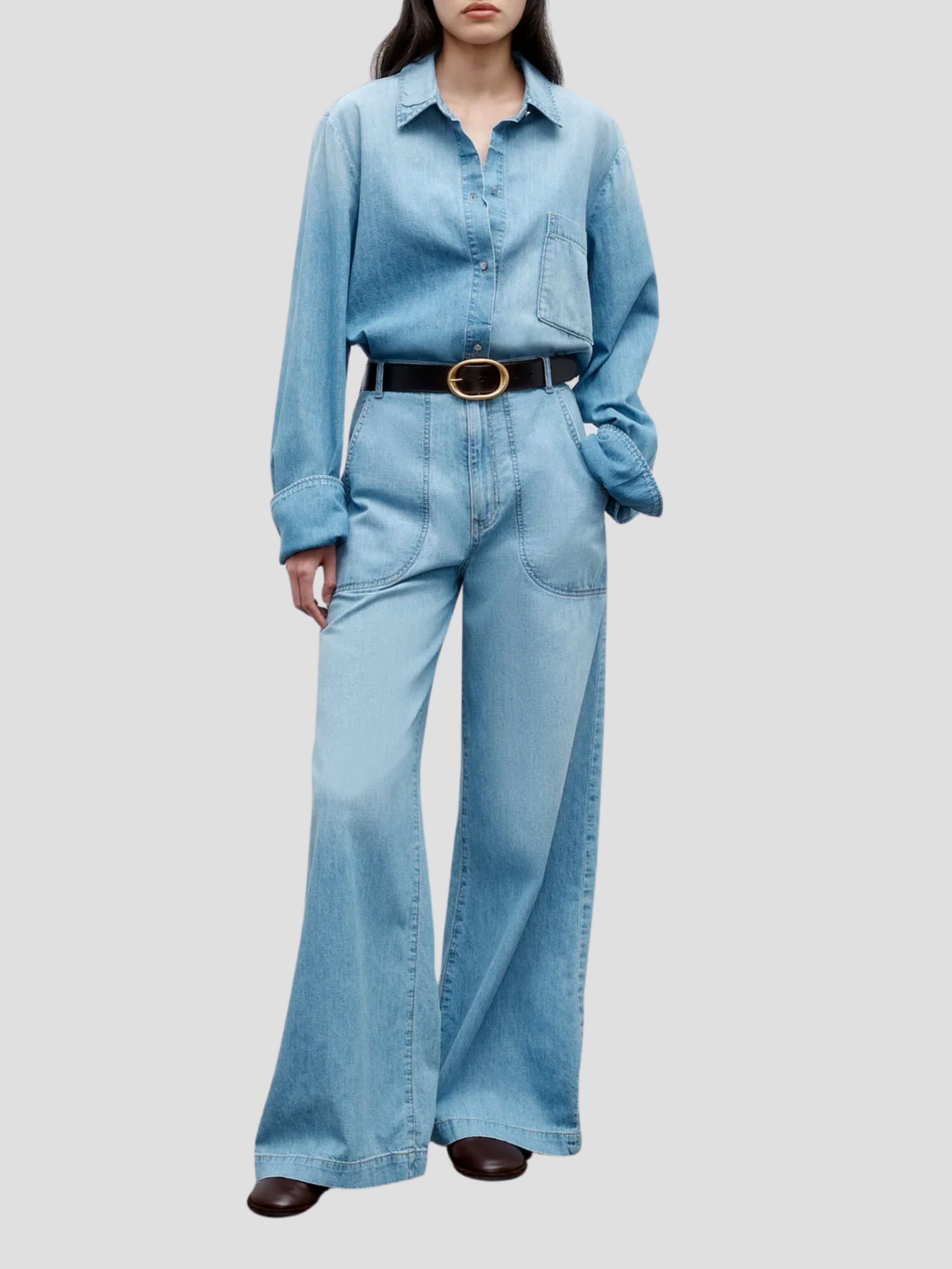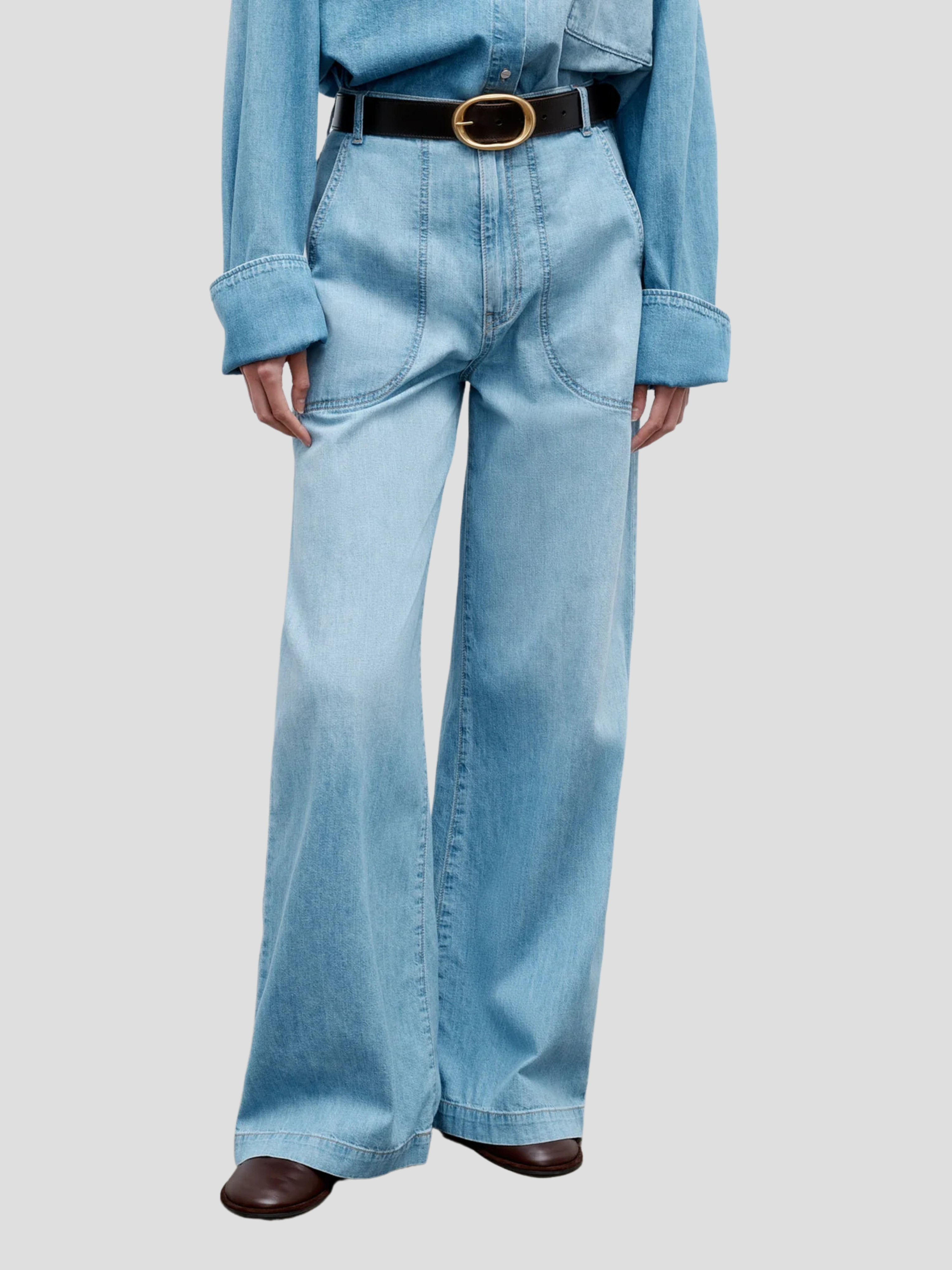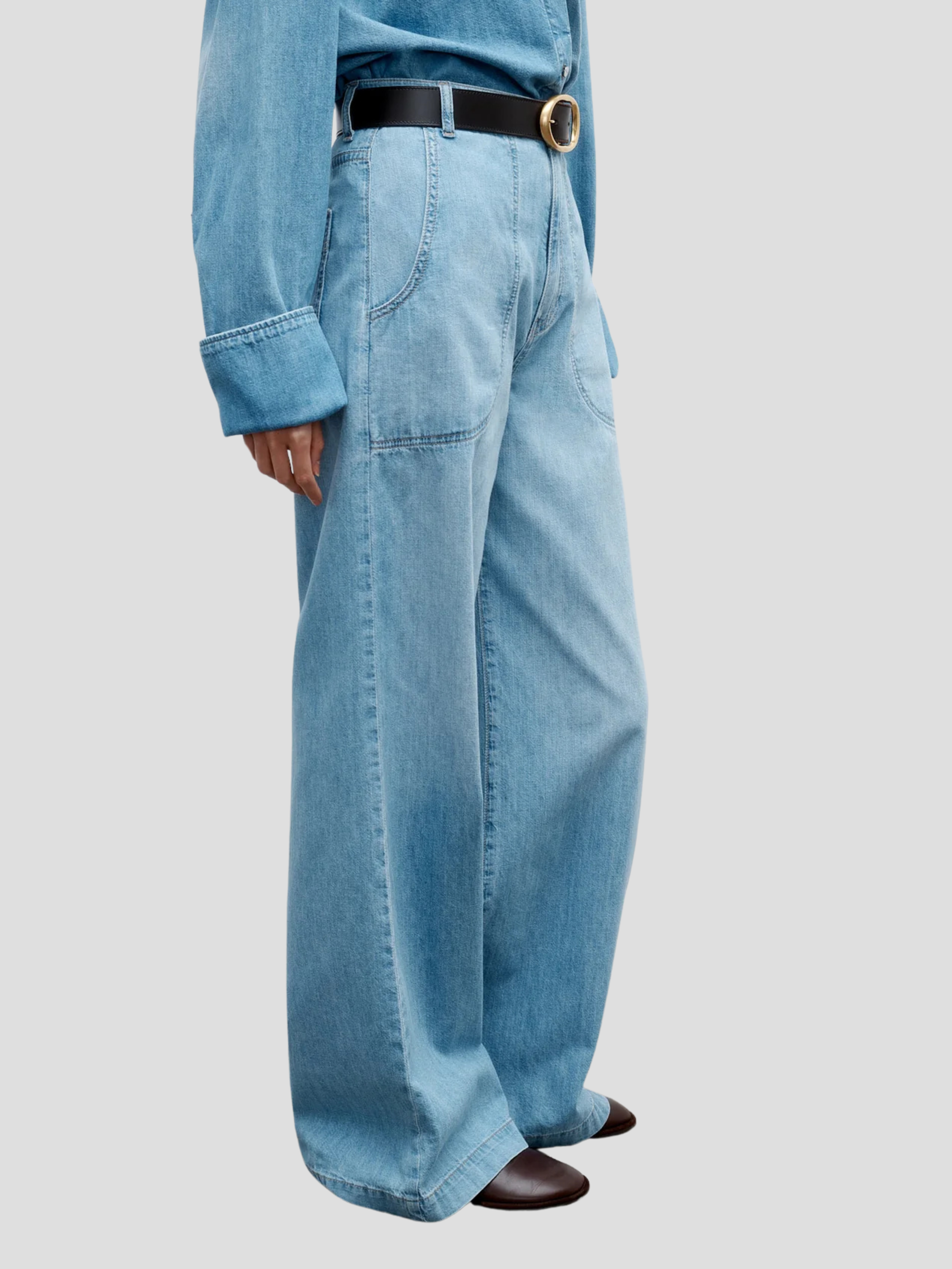 High-rise, wide leg jeans in linen cotton denim. This fabric is light and breathable with a textured hand and vintage inspired wash. Mecox beach is relaxed through the hip and leg. Complete with large curved pockets with exposed stitching at the seams, back pockets, concealed zip fly and button fastening.
