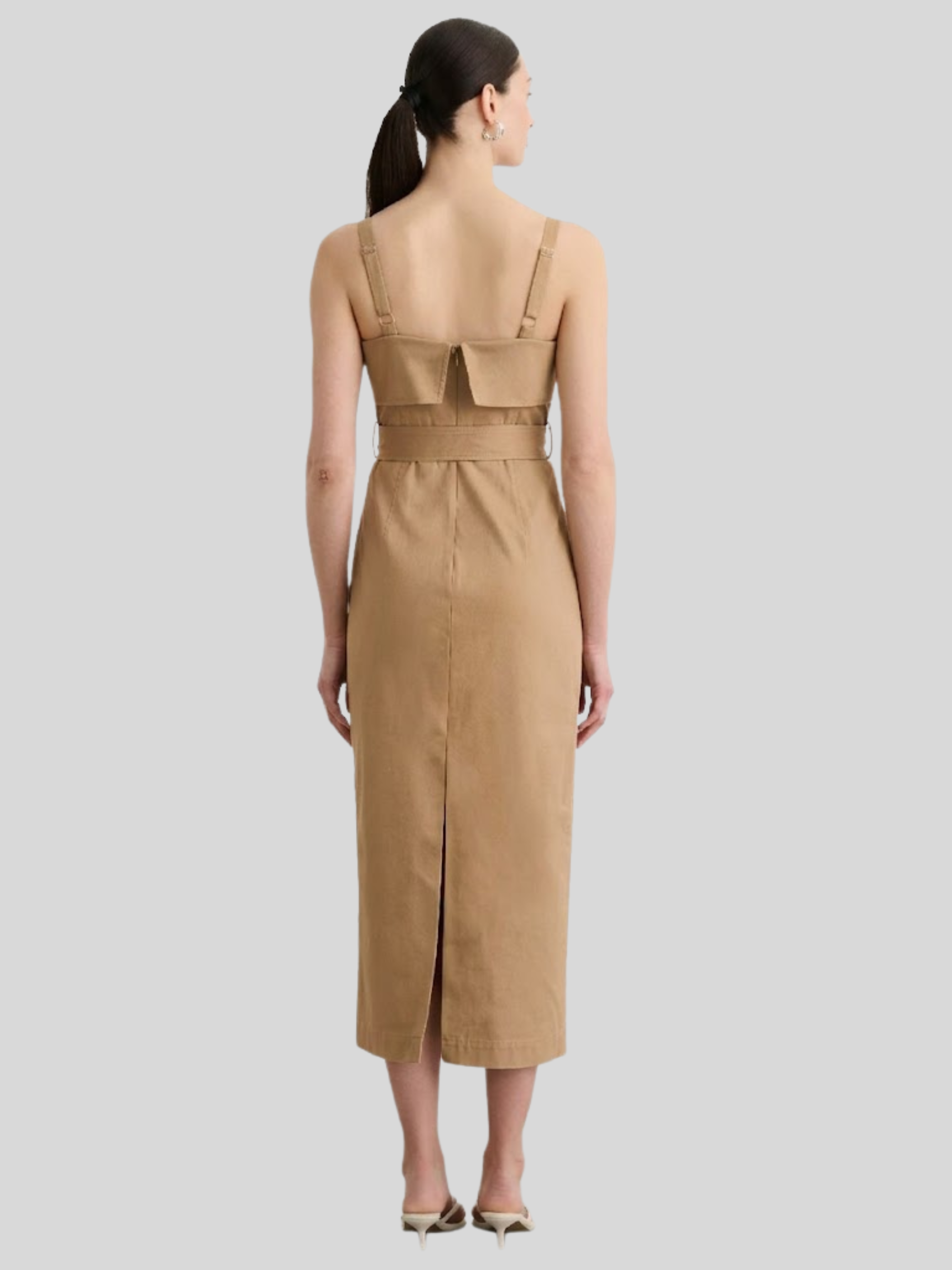 The Theodora Belted Midi Dress is a sleeveless square-neck midi dress with a sculpted fit and a waist-defining belt for a clean, flattering silhouette. Wear it with strappy heels for an elevated occasion look, or layer on a tailored blazer for polished day-to-night styling.