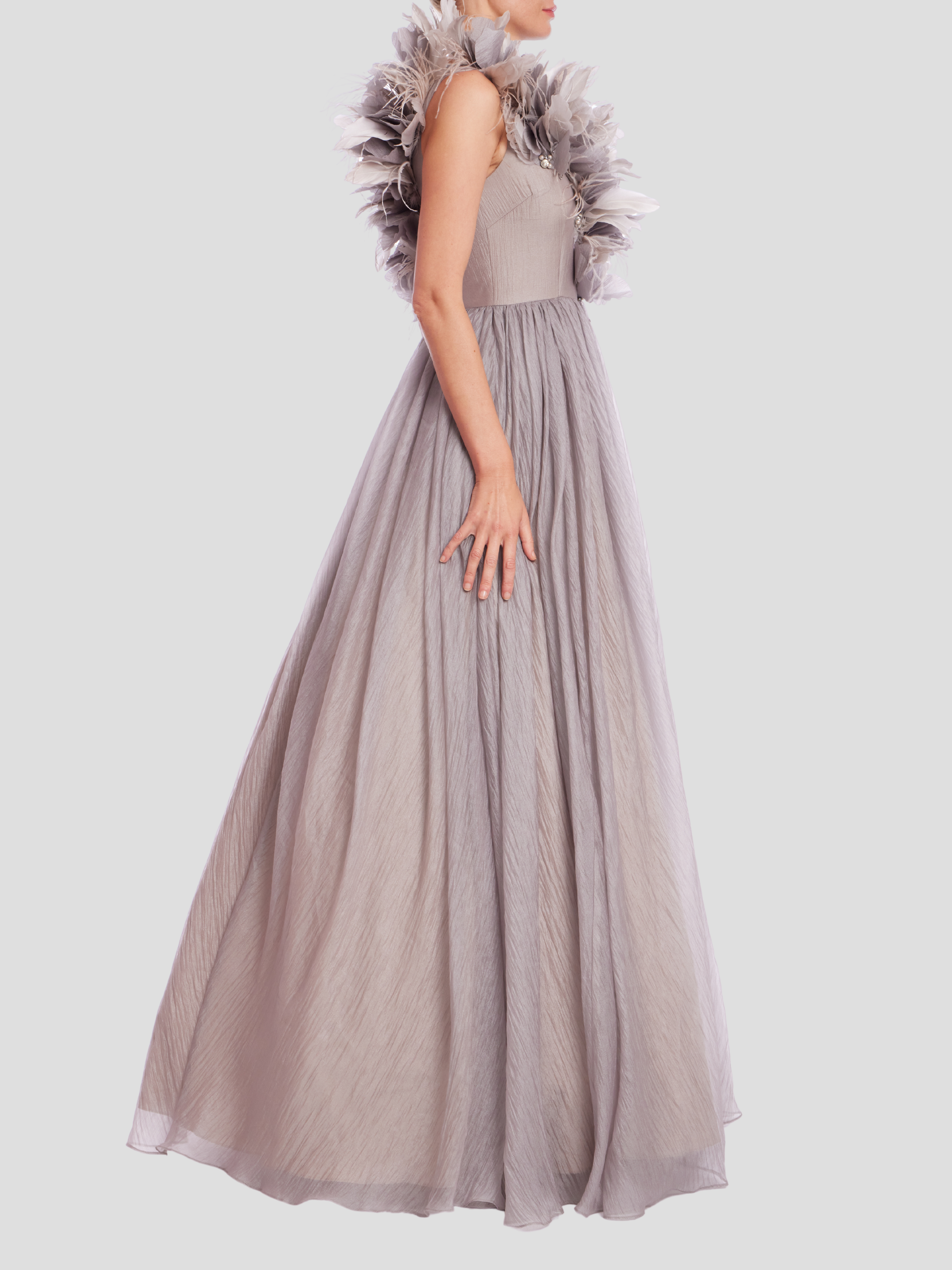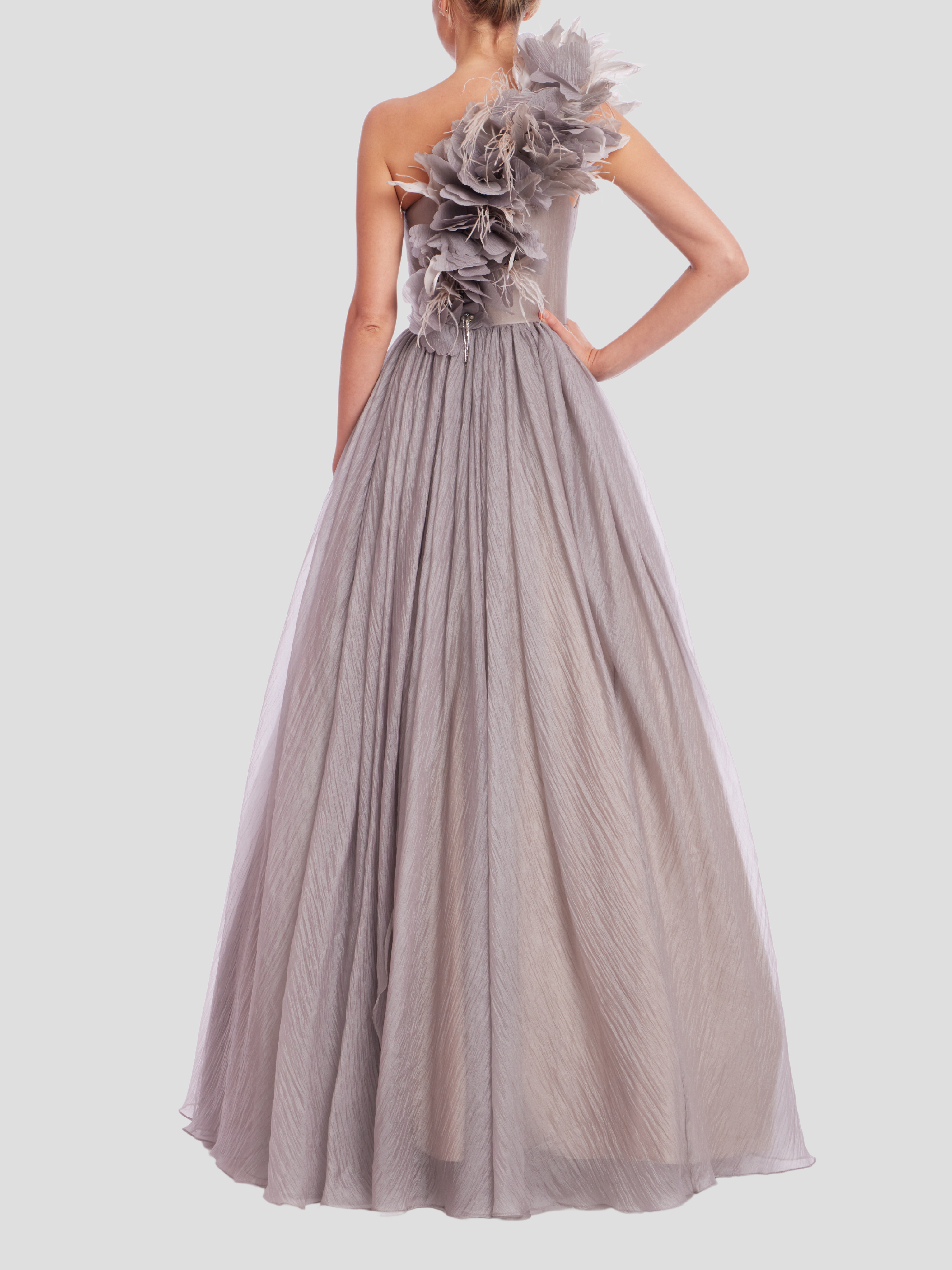 This 3D Feather One Shoulder Gown combines modern design with luxurious details. The one shoulder feature adds a touch of elegance, while the 3D feathers bring a unique texture to this gown. Perfect for formal events or special occasions.