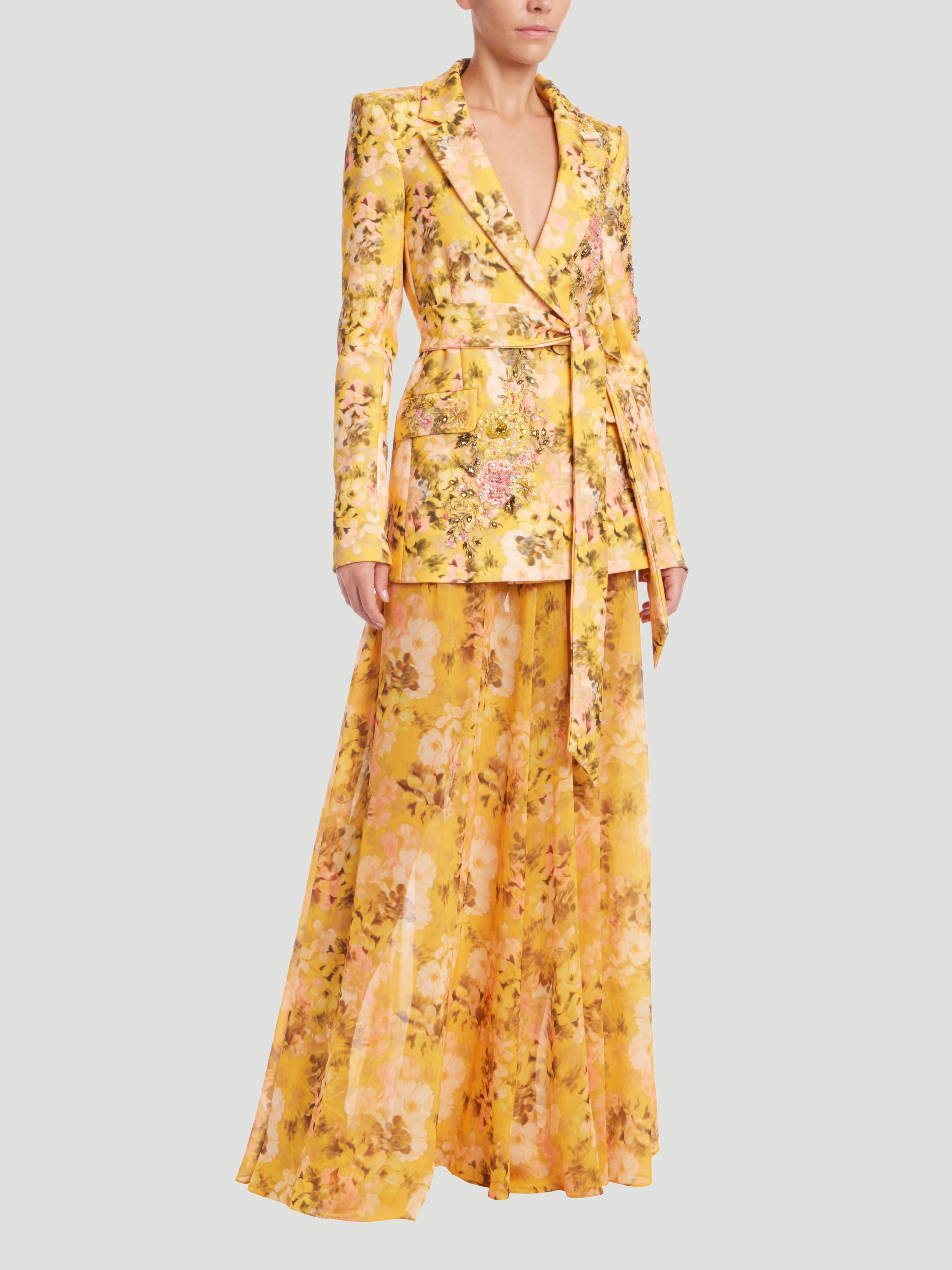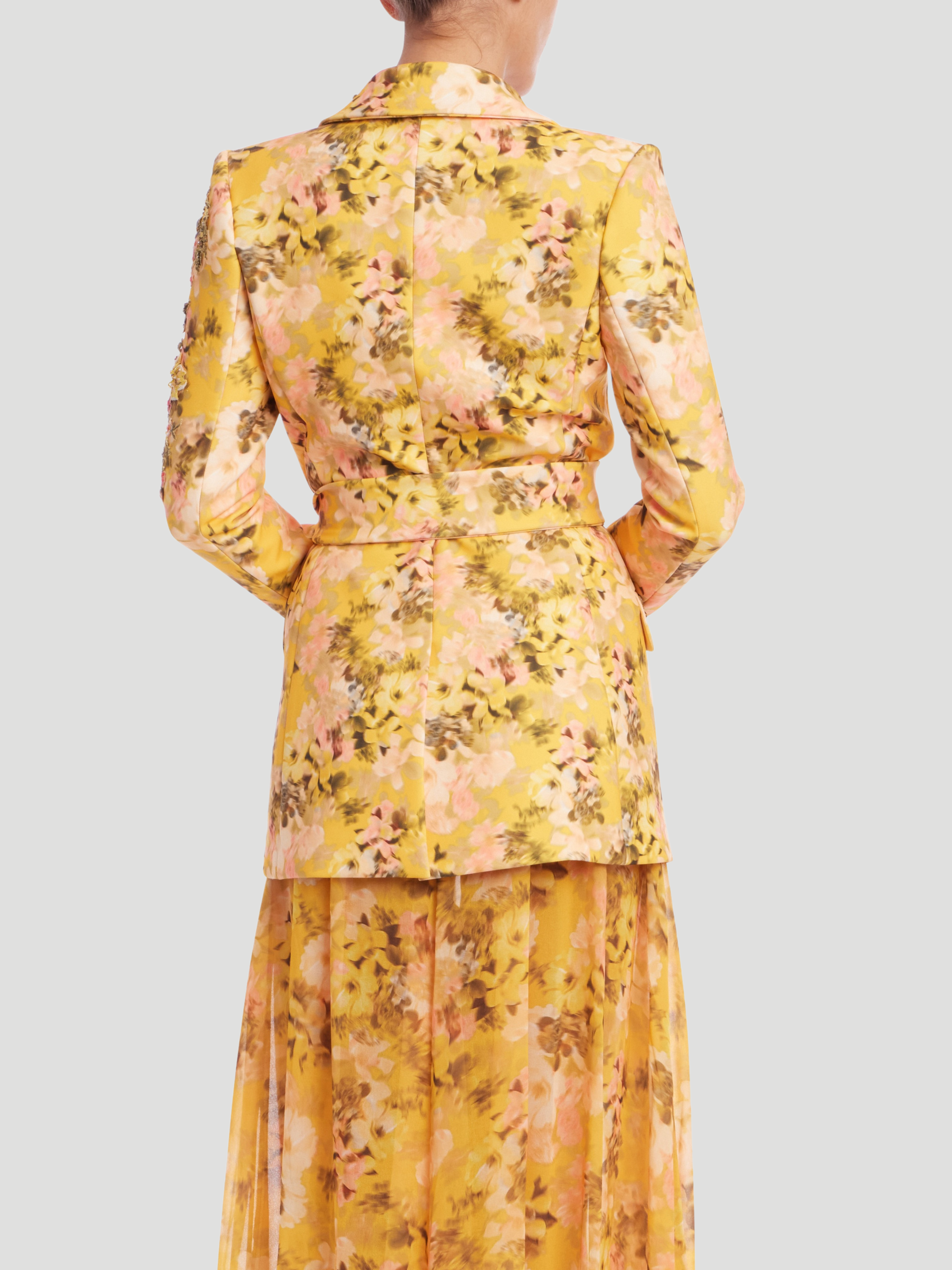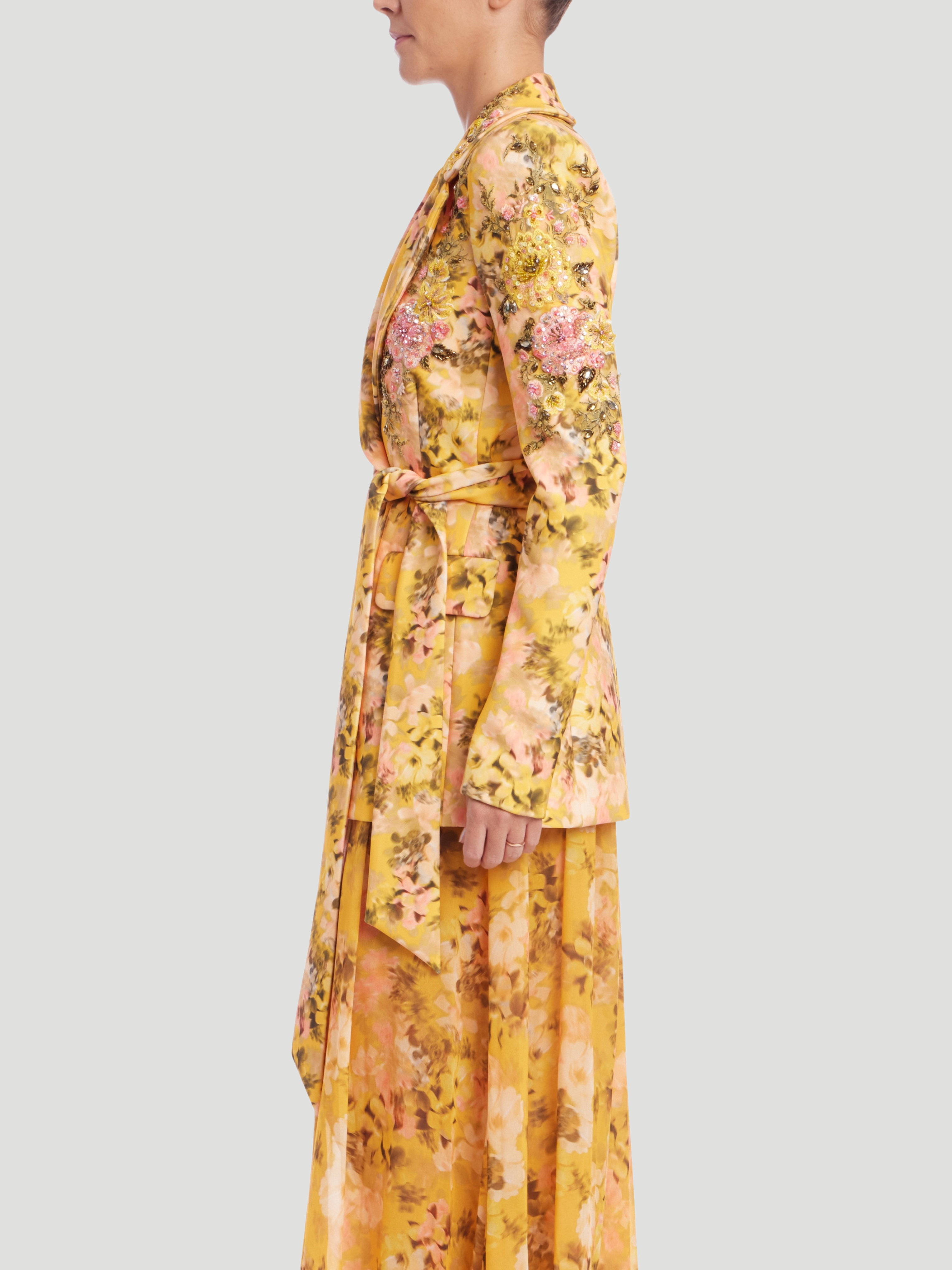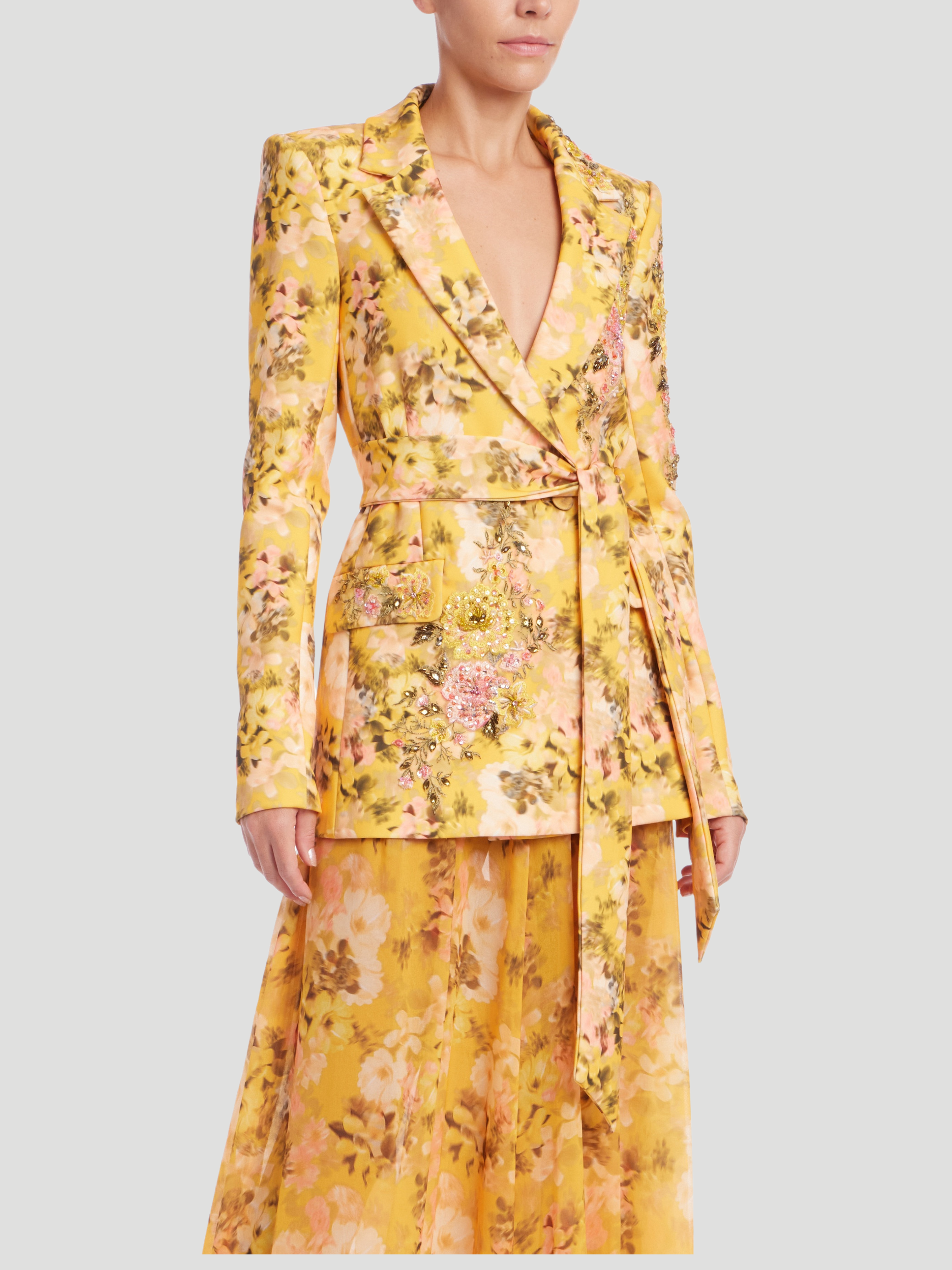 Elevate your wardrobe with the Floral Printed Tie Waist Blazer. Constructed from structured crepe, this jacket features a vibrant golden-yellow floral print and polished lapels. The waist-defining self-tie belt and beaded appliqués add a touch of romance and sparkle, creating a modern masterpiece that exudes sophistication and charm.
