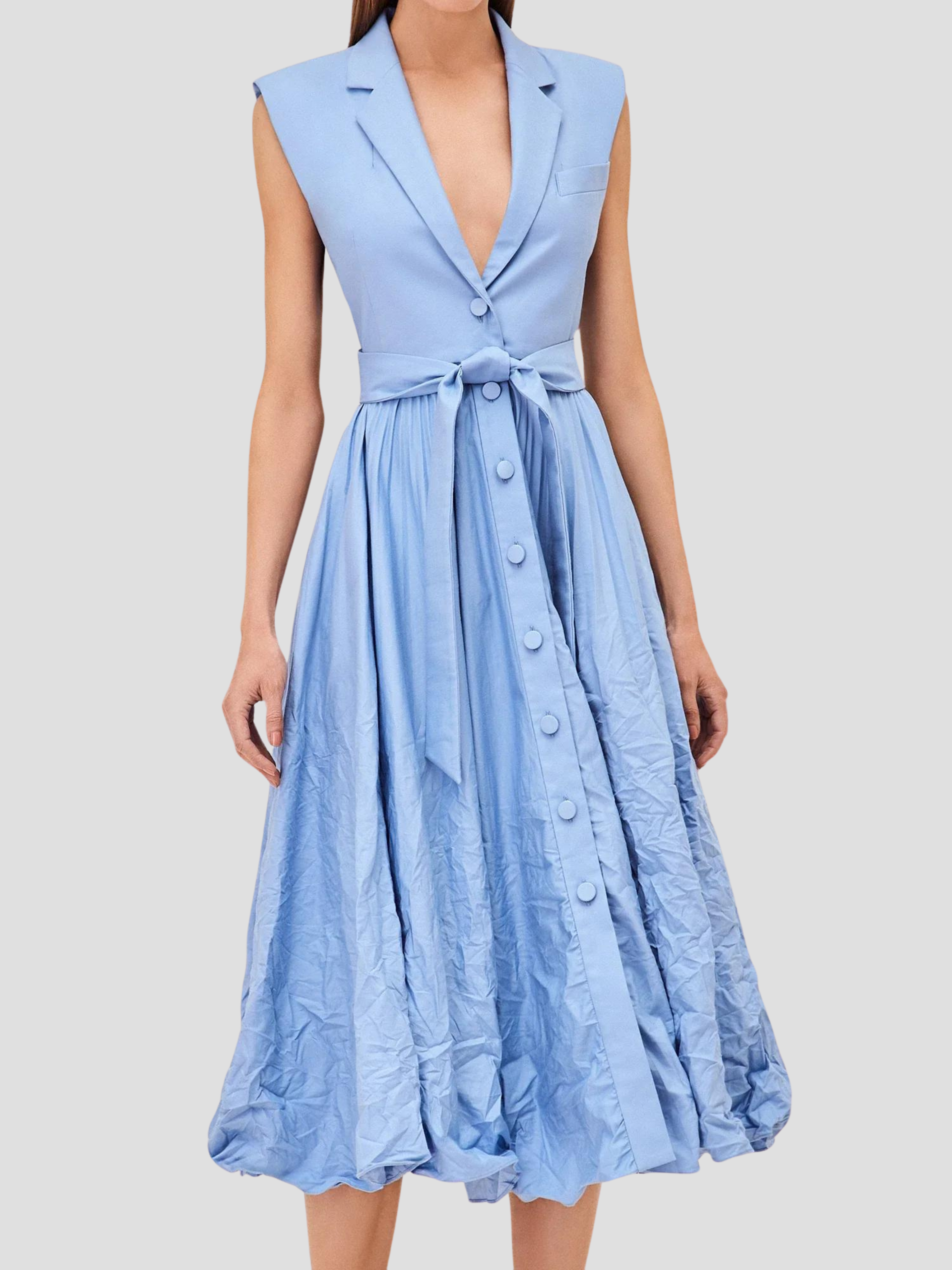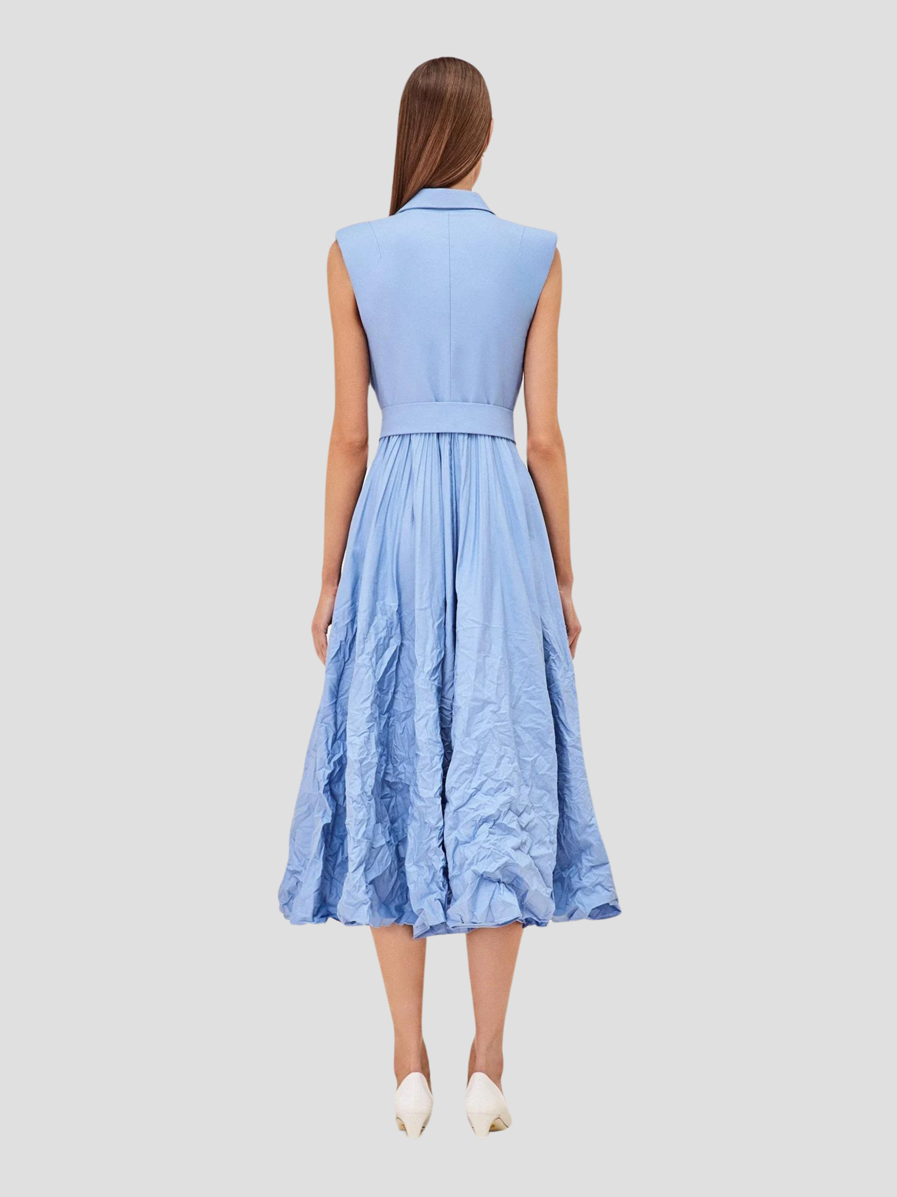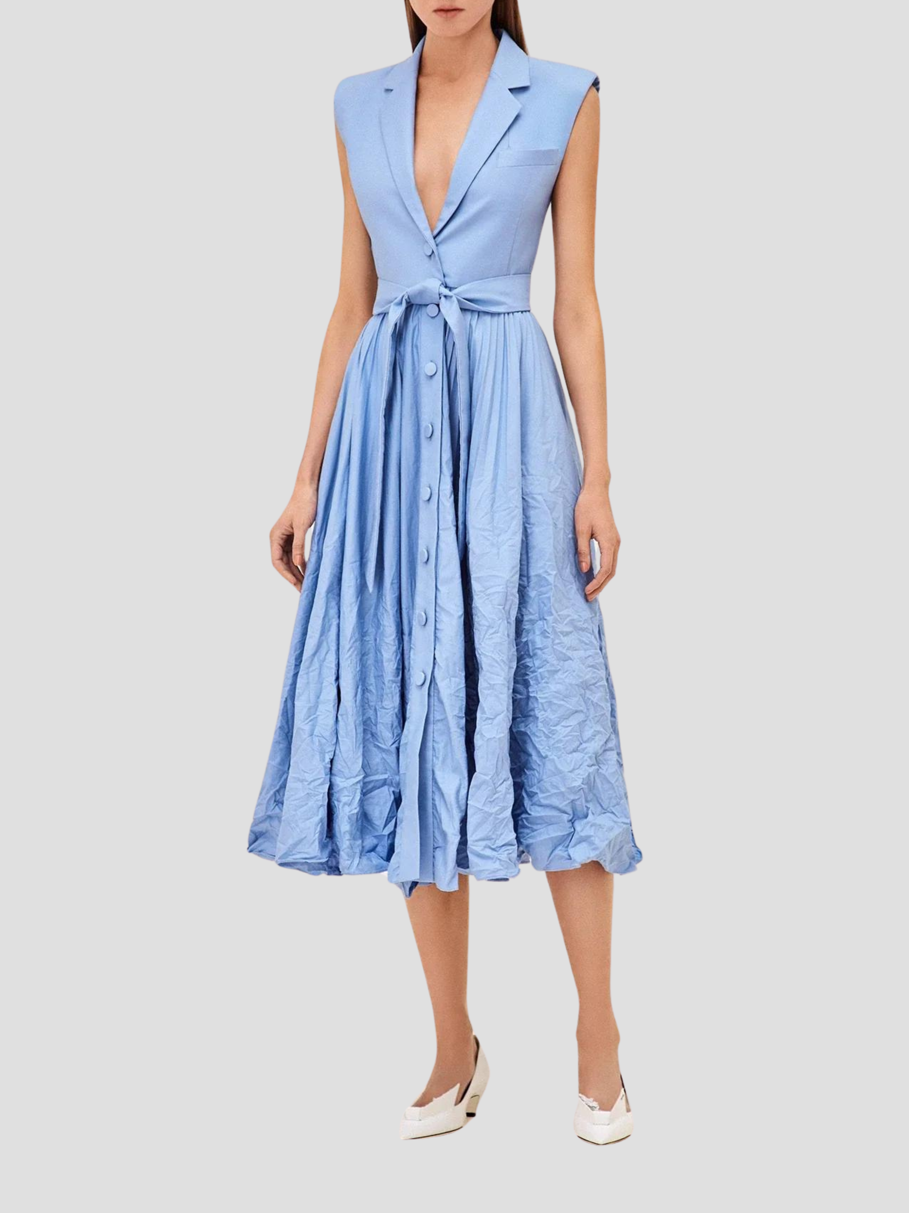 Embrace sophistication and style in the Beau Dress - a perfect fusion of sharp lapels and a fluid, plunging V-neckline. The crisp top harmonizes with the delicate crinkles of the skirt, creating a dynamic texture that moves effortlessly with you. A cinched waist, accented by a matching fabric belt, flatters your figure for a truly stunning silhouette.