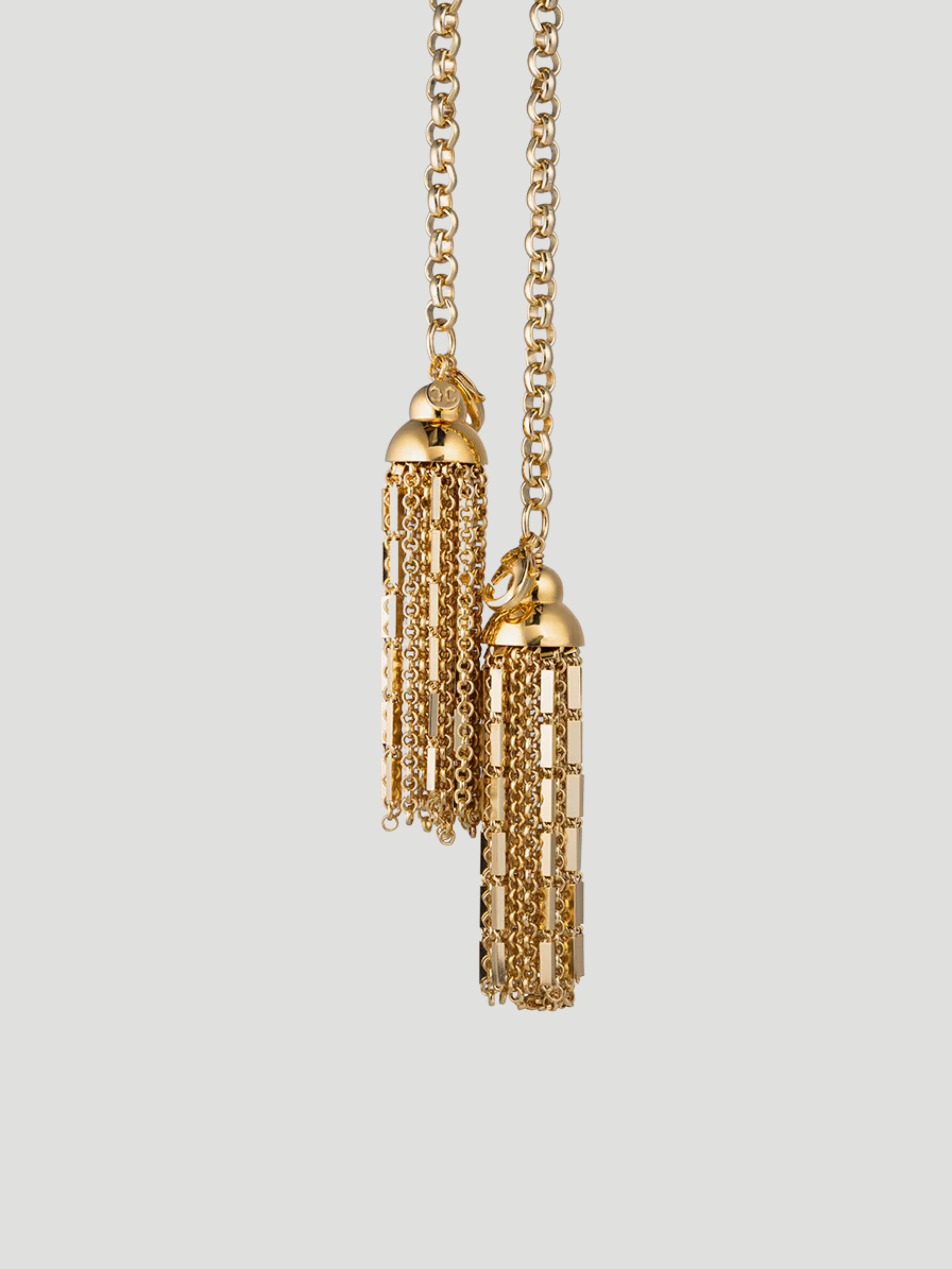Elevate any outfit with our Tassel Necklace, made from recycled brass and plated in 14k gold. The lobster-claw closure allows for versatile styling and can be worn as a necklace, hip jewelry, or handbag chain. Complete your look with this stylish and sustainable piece from Christina Caruso.
