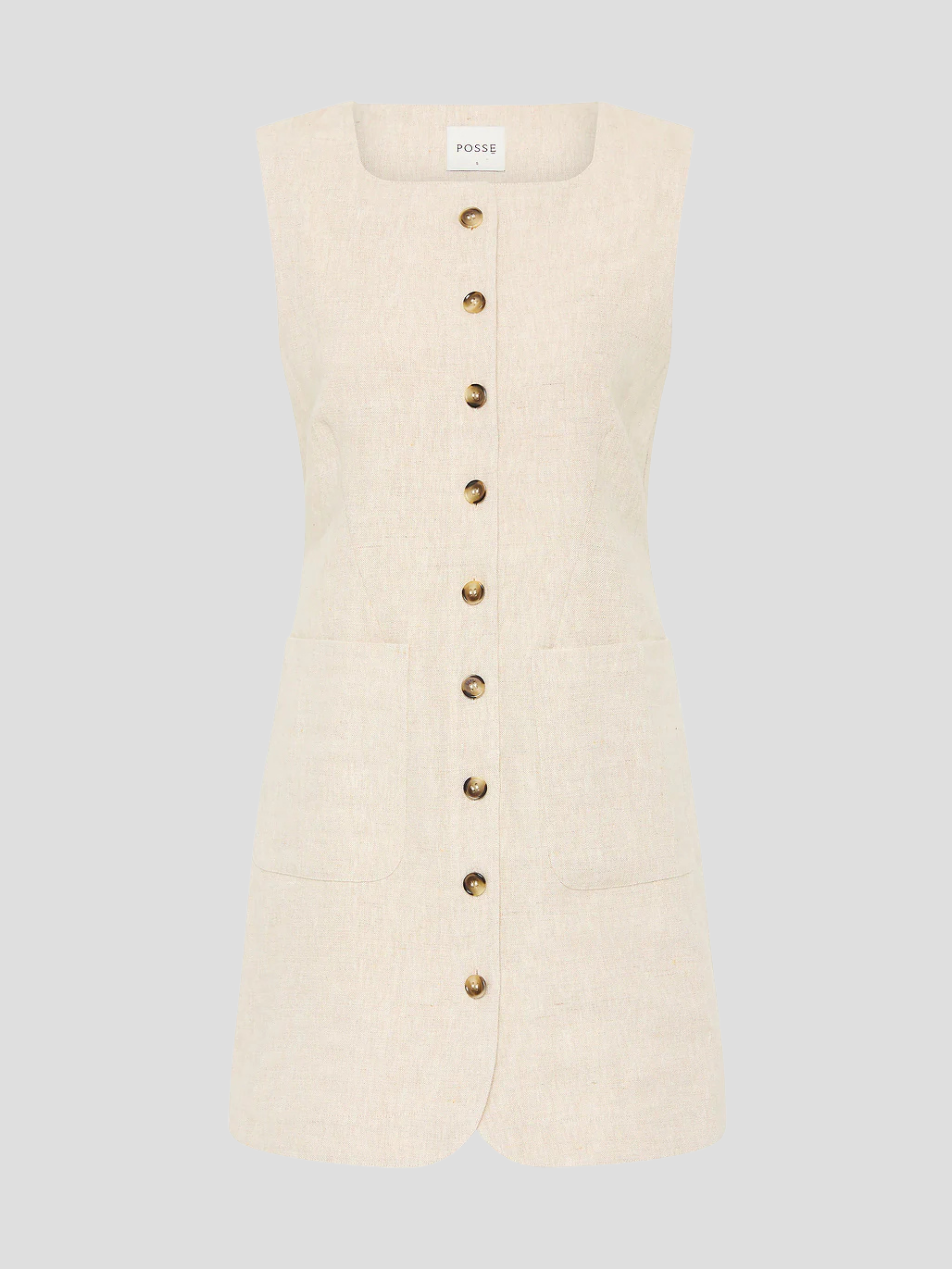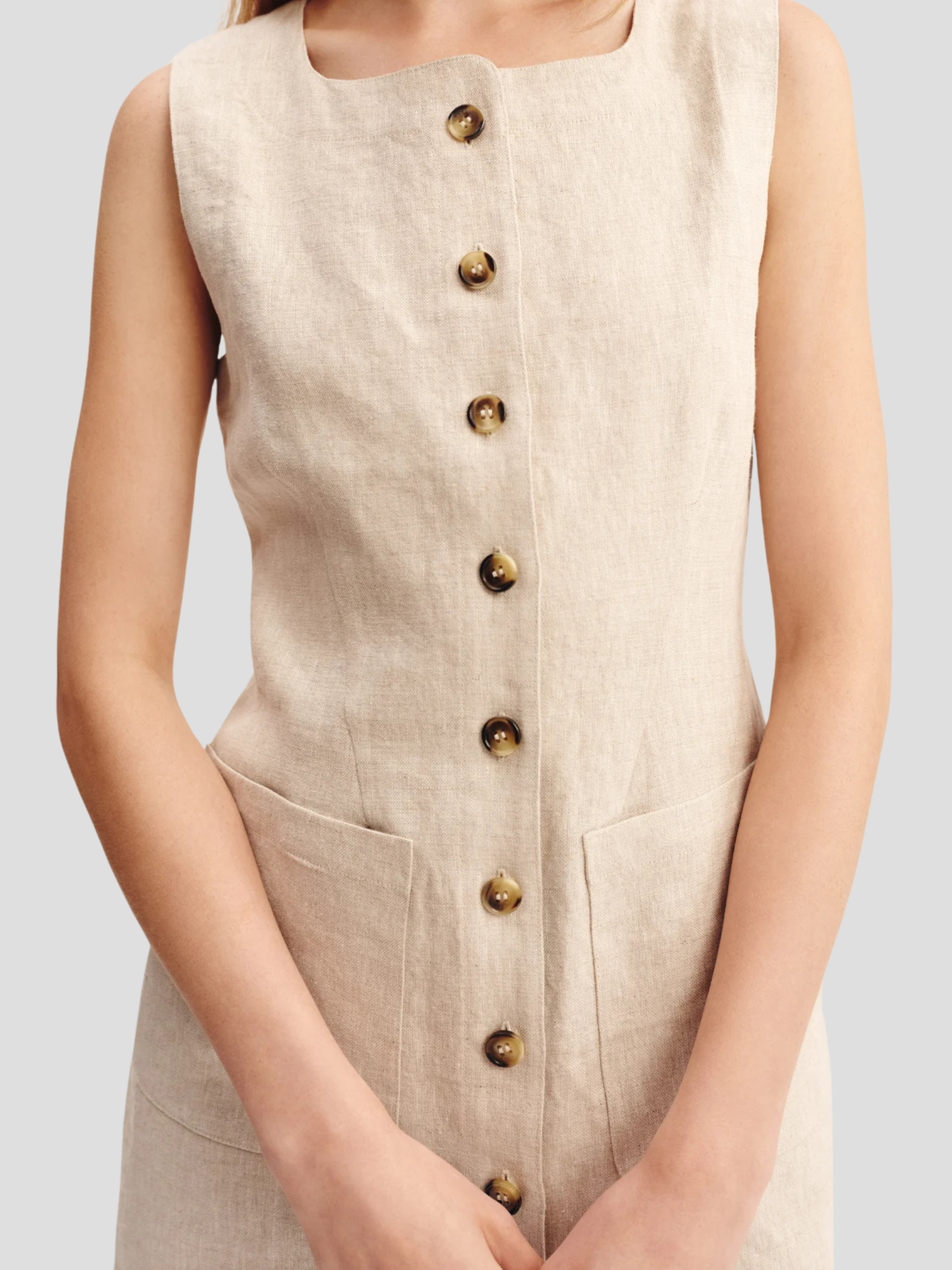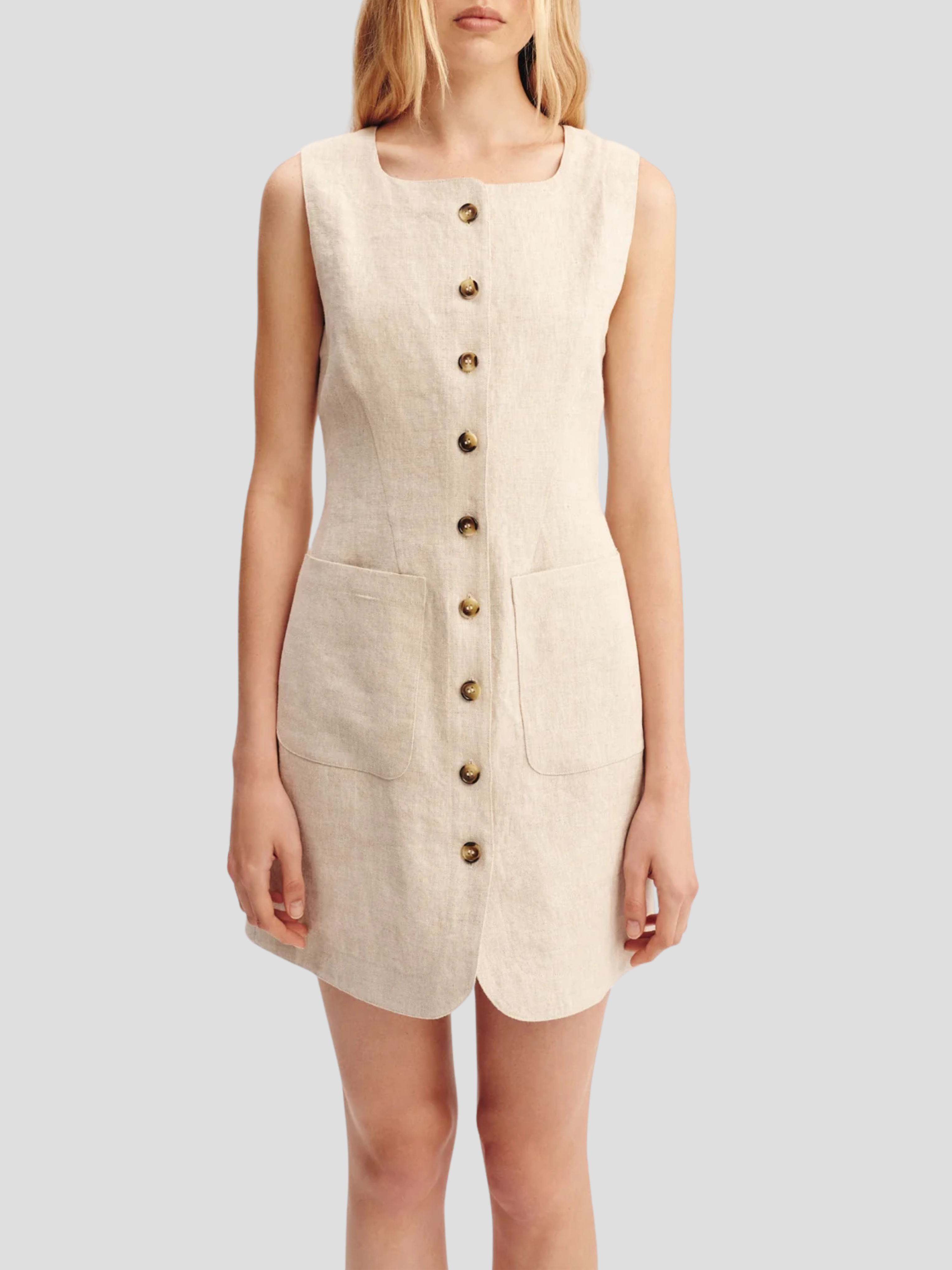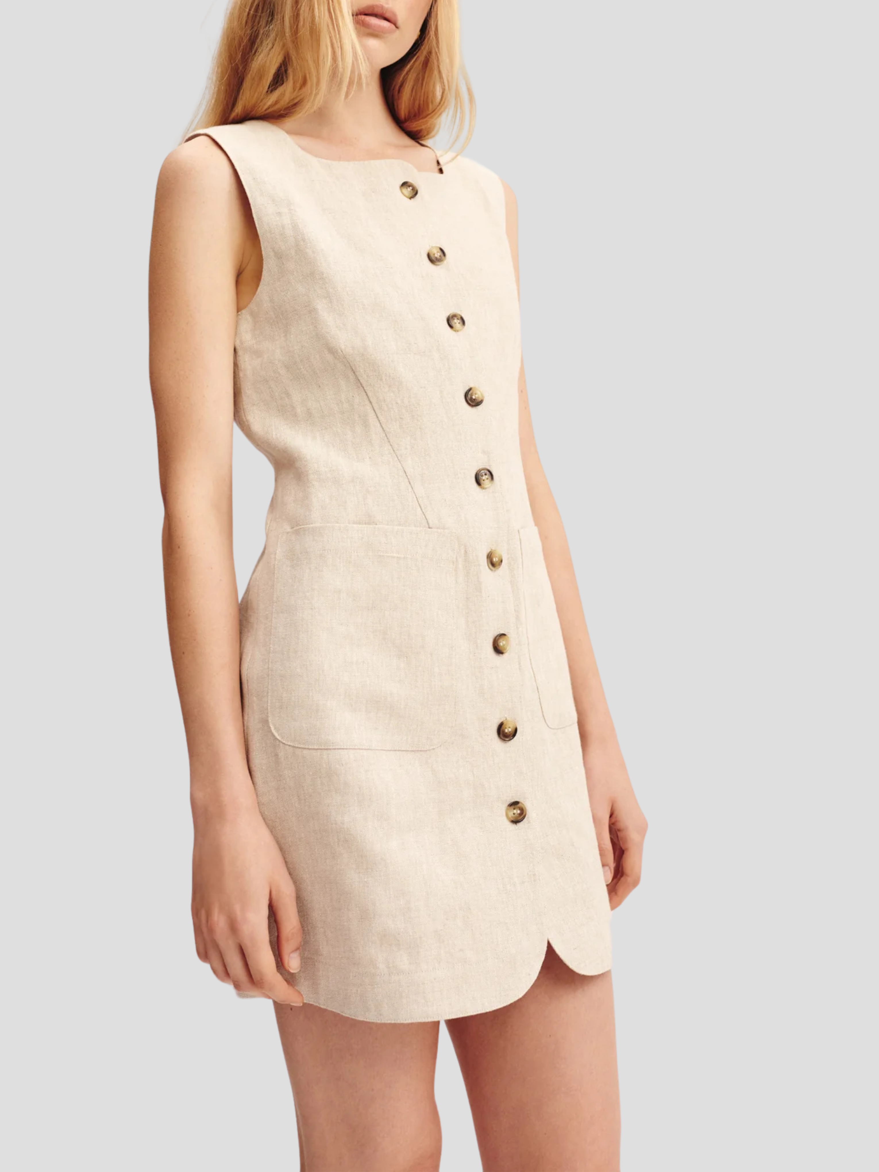 Cut from premium linen, the Emma Mini Dress features an elegant high neckline, mottled centre-front buttons and a curved hem. Use the adjustable back buckle to create a cinched silhouette.