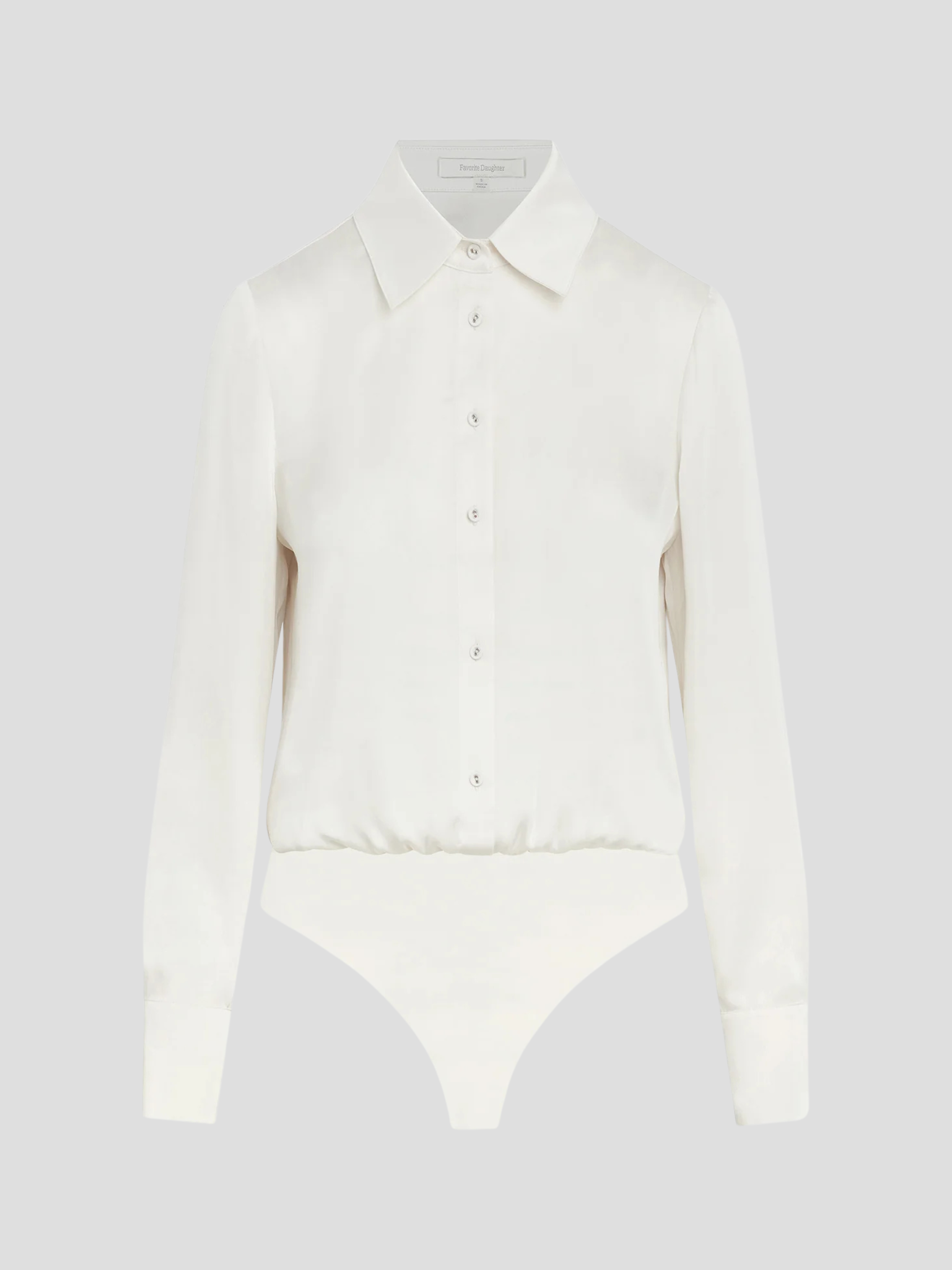 A silky, satin button-down shirt with serious style. The Take Me Seriously Bodysuit features a collared neckline and full sleeves. With a tailored fit, it's a no-fuss tuck thanks to the comfortable snap bodysuit.