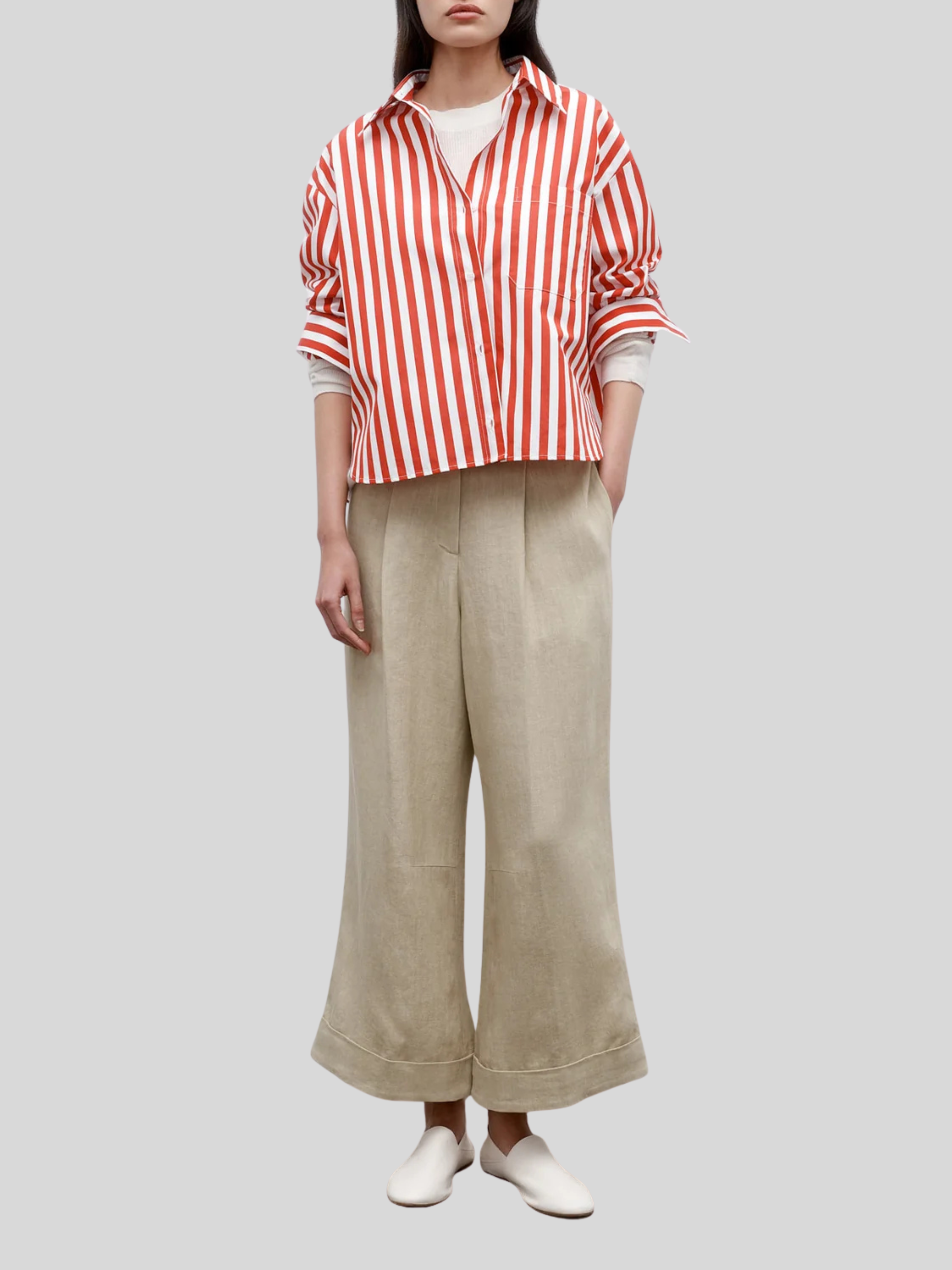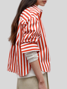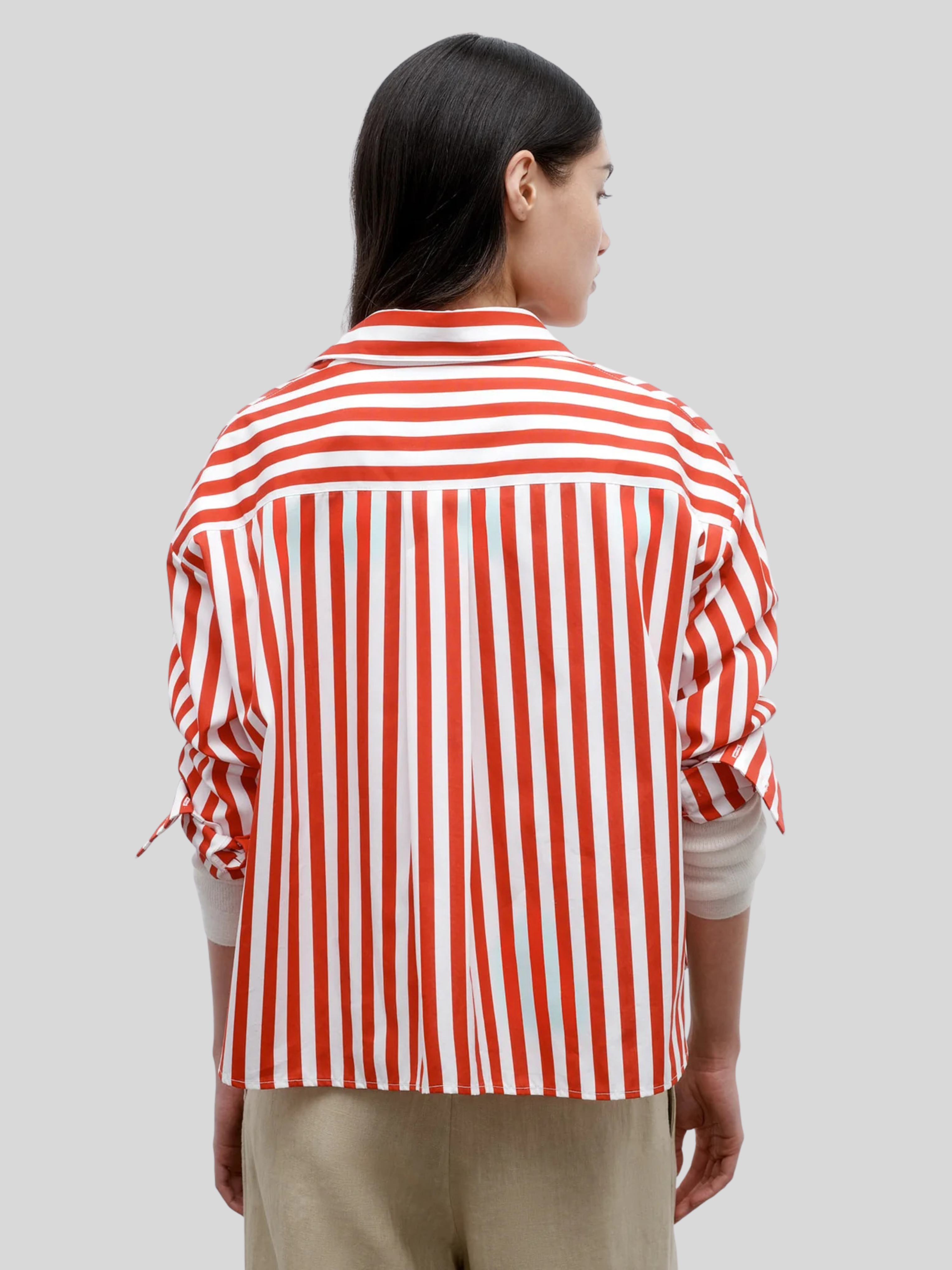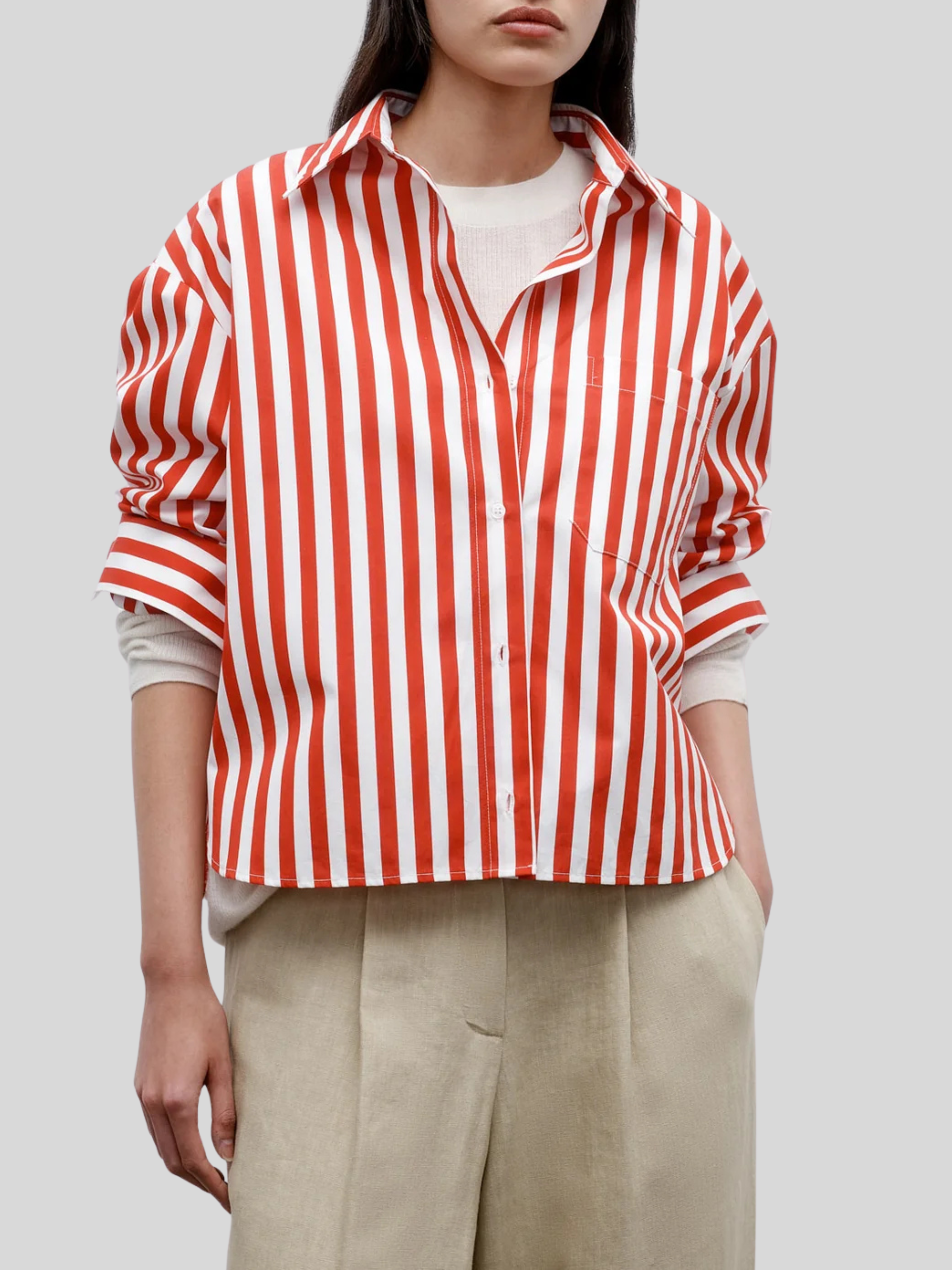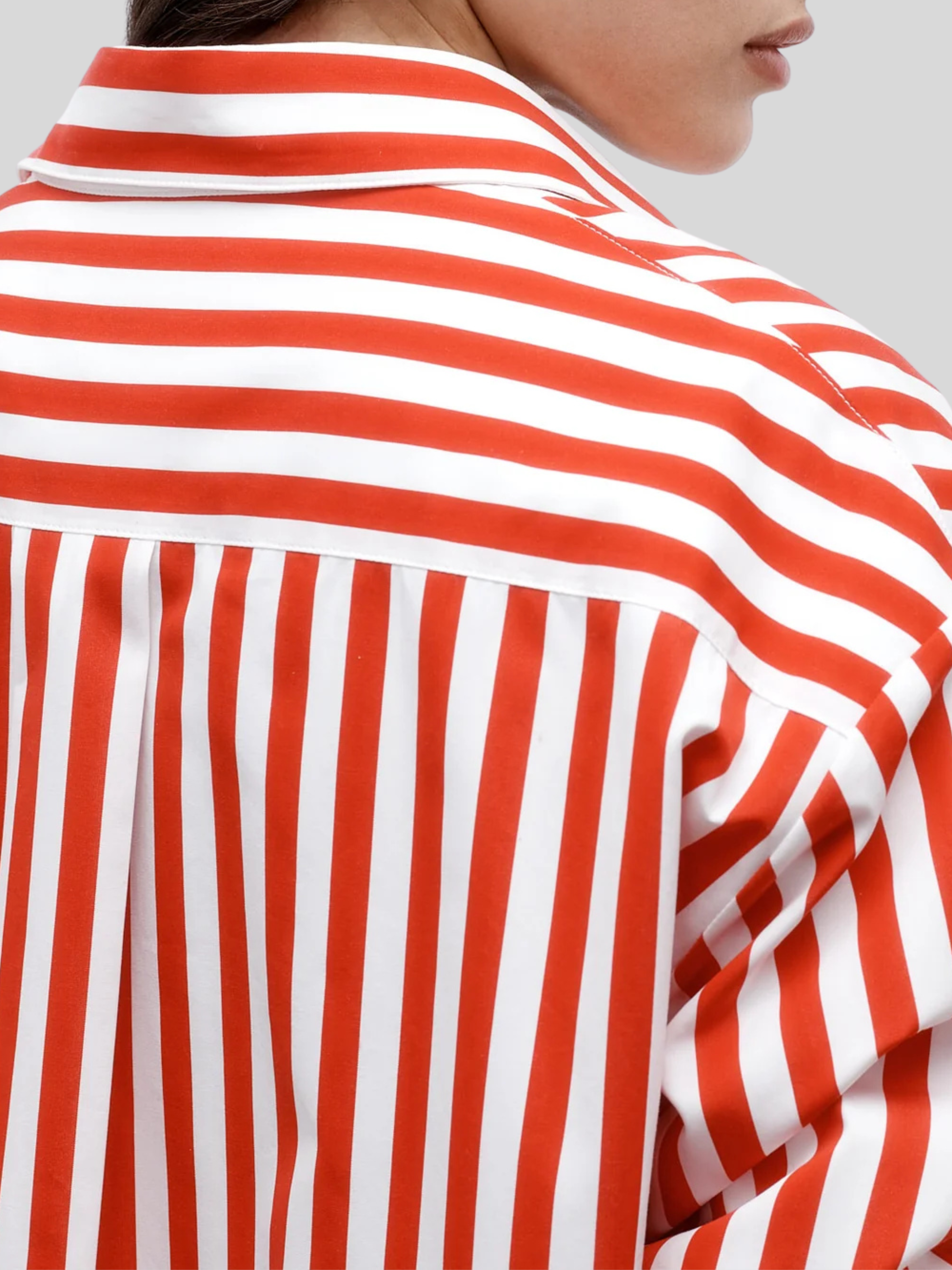Slightly cropped long sleeved button up in bold striped italian cotton shirting. The J.D is a boxy fit with a curved hem and box pleat at the back. Complete with a chest patch pocket, point collar and our signature single roll button cuffs.