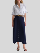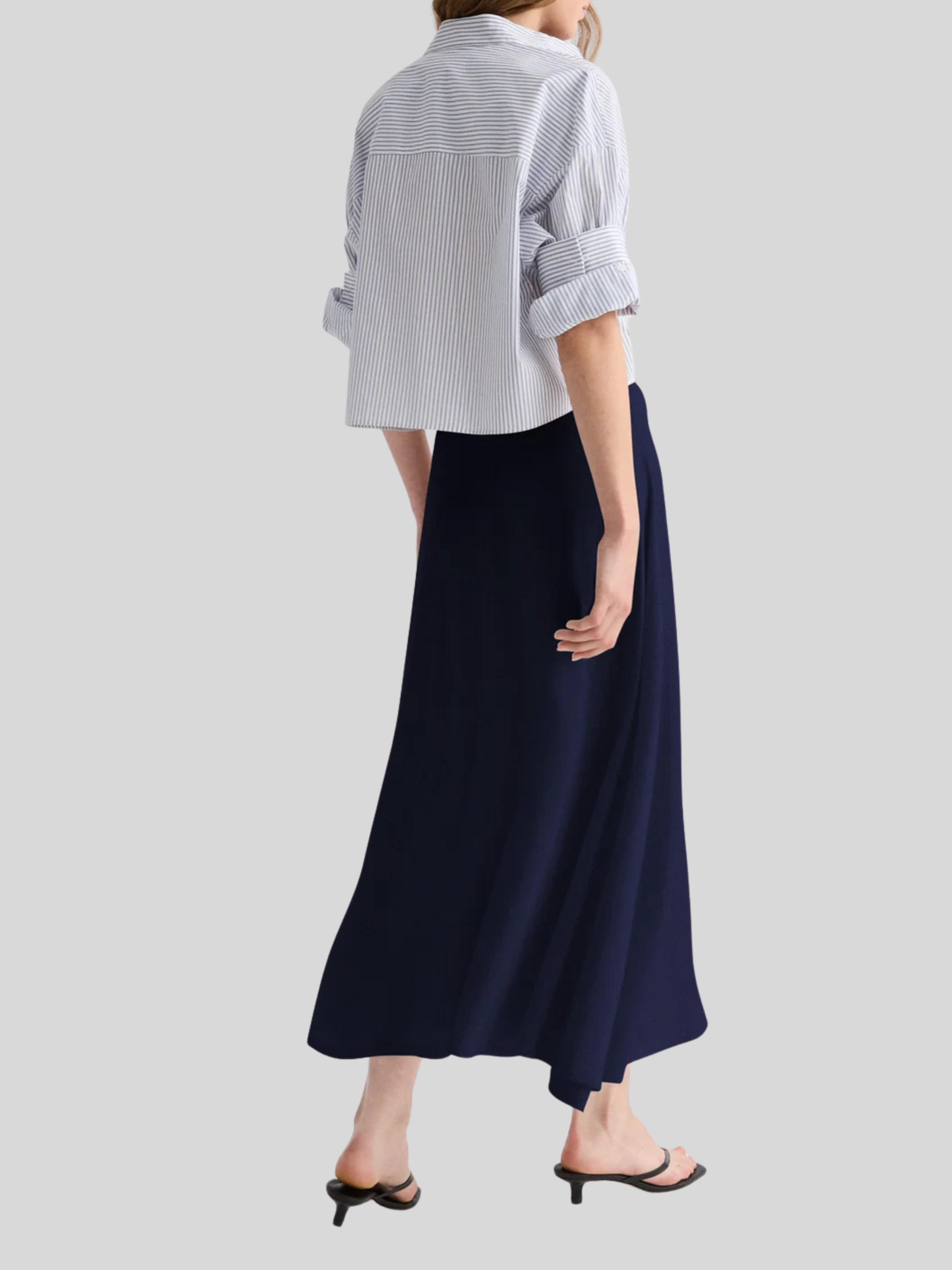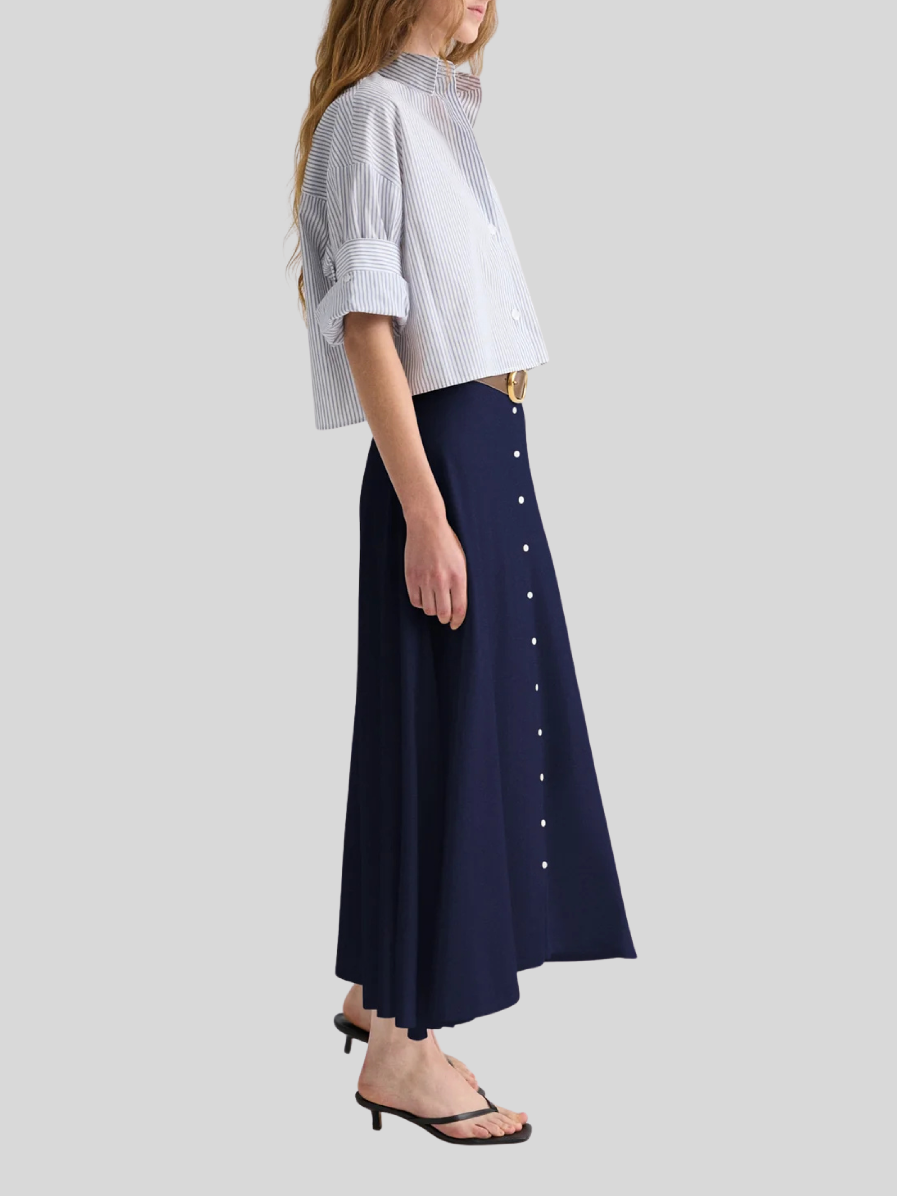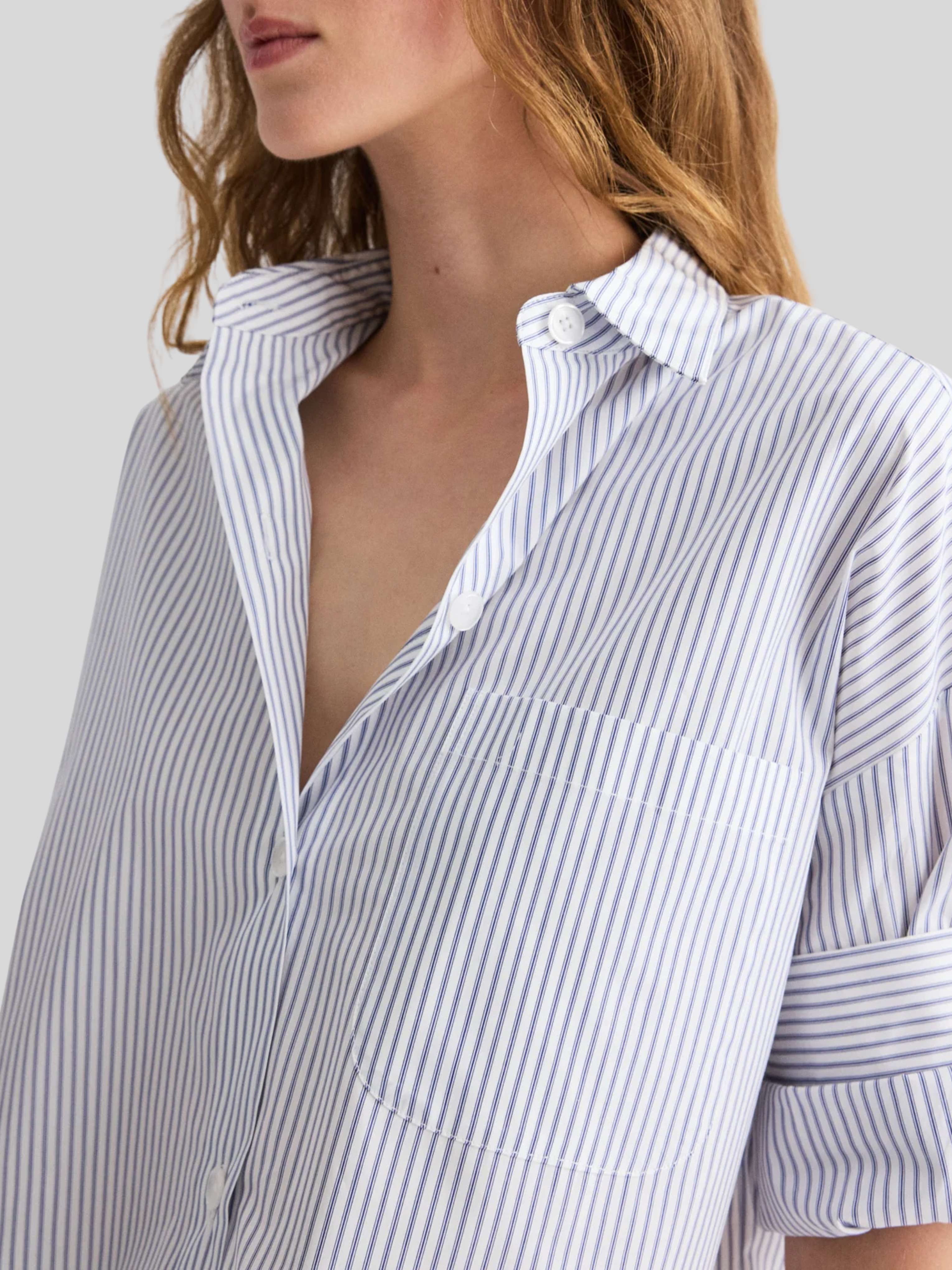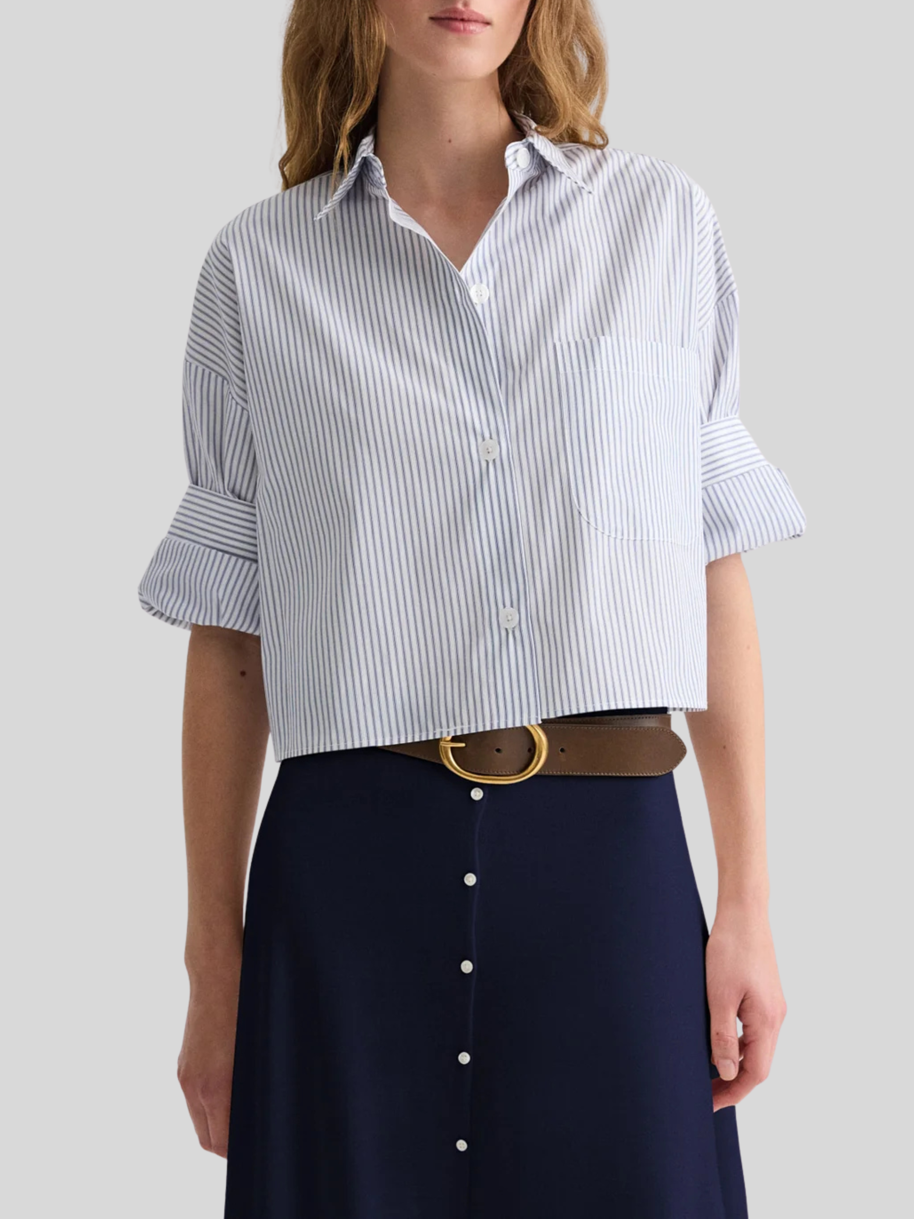 TWP’s signature short sleeved button down crafted in micro hairline stripe. The Next Ex is a cropped, boxy silhouette, complete with a chest patch pocket, button up placket, spread collar, and our signature double roll button cuffs.