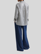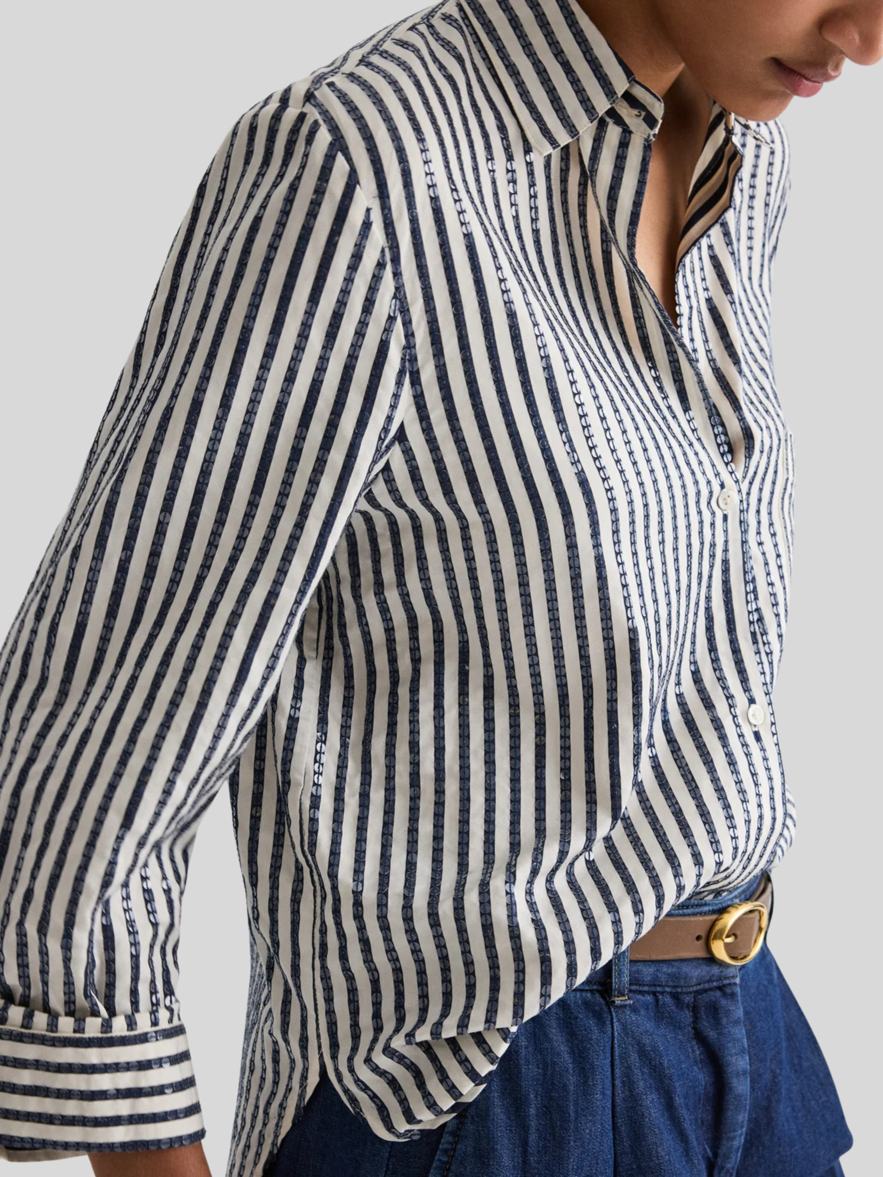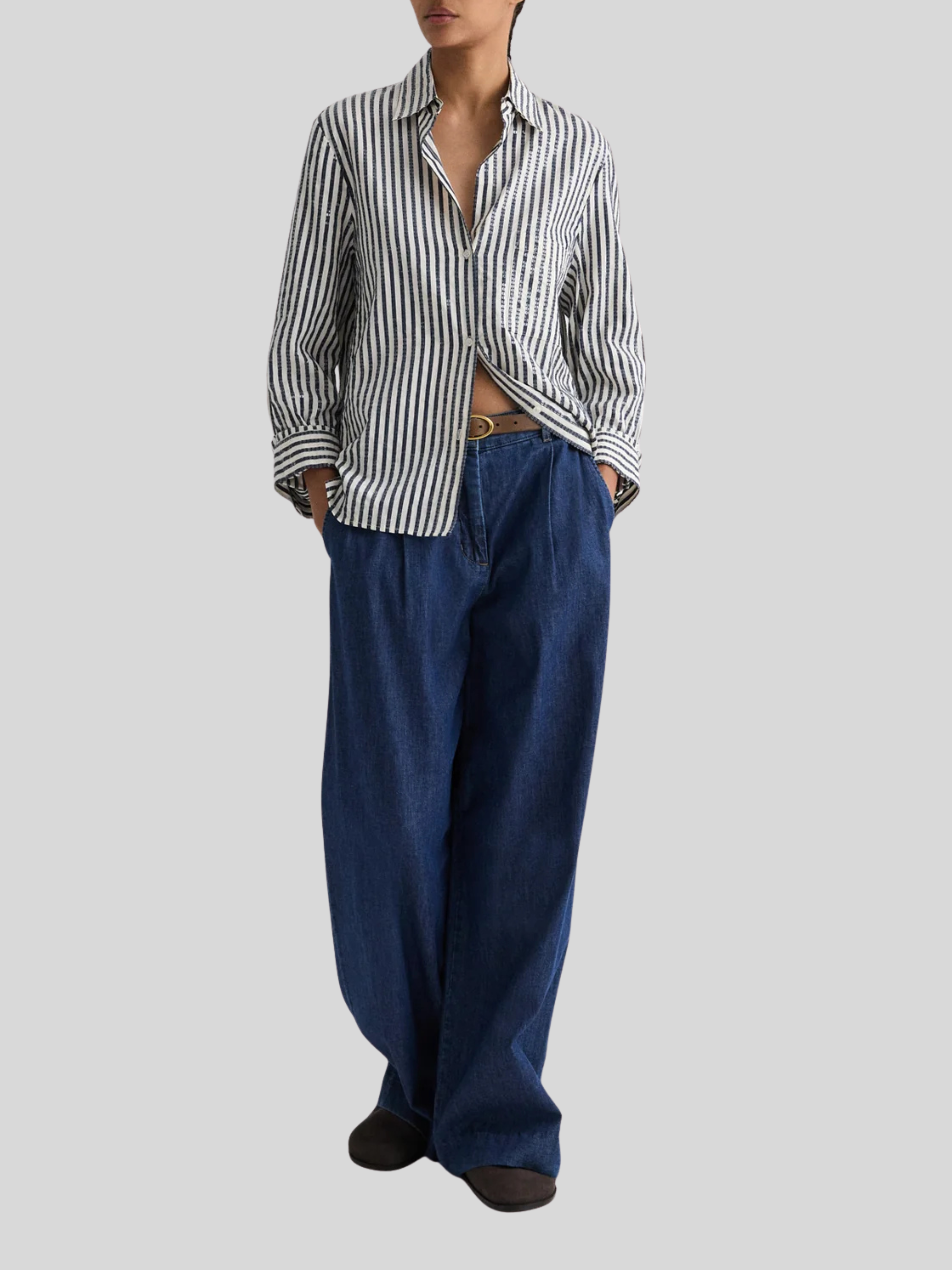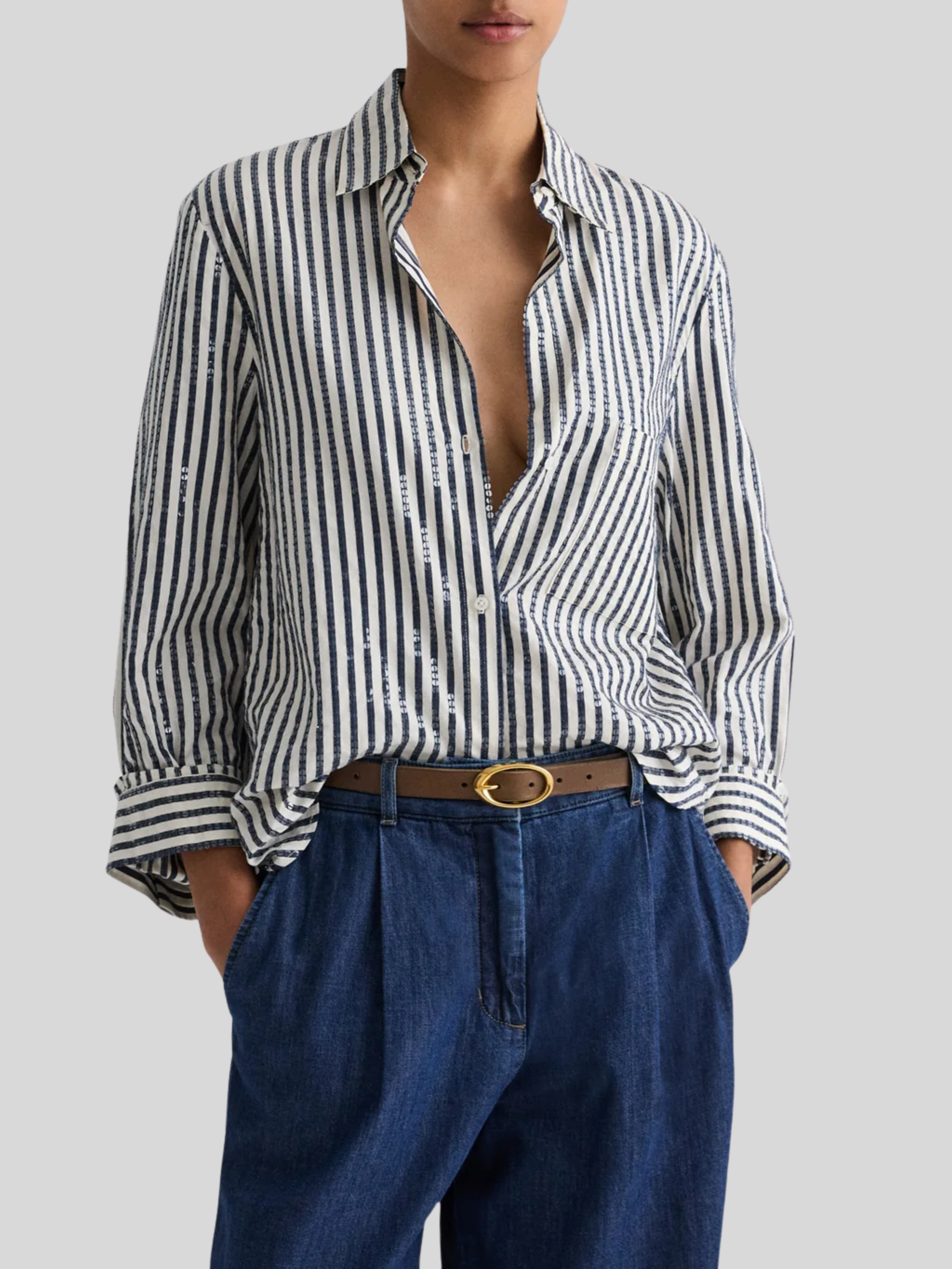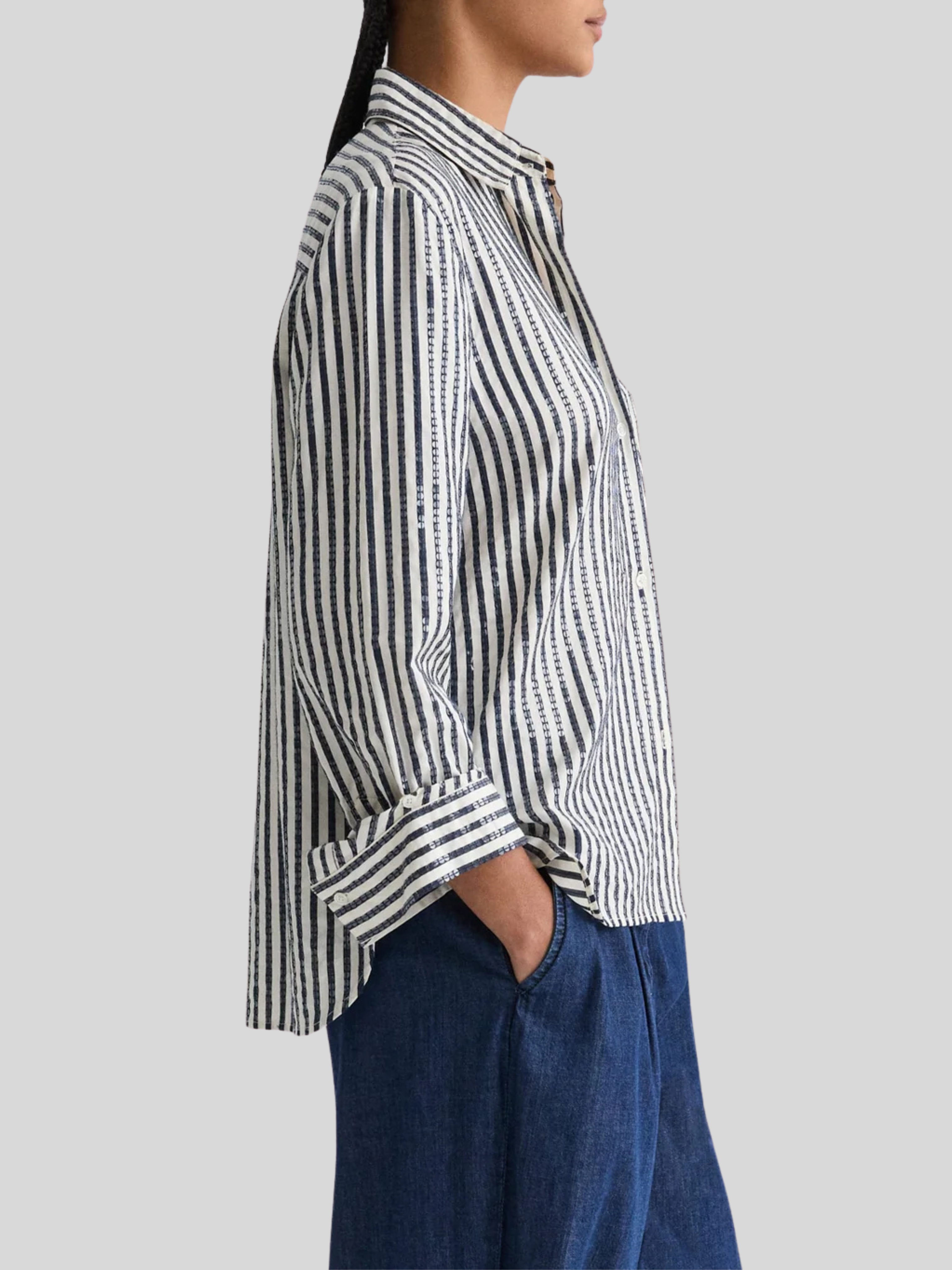Oversized button down shirt in clear sequin on stripe. Fabric is superfine Italian cotton shirting embellished with clear sequins. The Next Morning is a relaxed silhouette with a center box pleat at the back. Complete with an exposed button up placket, chest patch pocket, spread collar and single roll button cuffs.