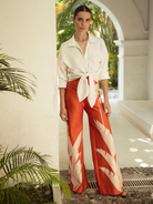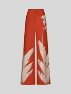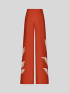 “Dandelion” is an orange high-waisted pant, crafted in structured scuba fabric for both comfort and shape. Its contrasting botanical print enhances the wide-leg silhouette, making it a bold yet refined piece.