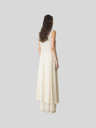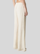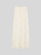 Soft, flowing, dreamy: the new jacquard trousers feature a vertical pattern of silver lamé threads, radiating delicate reflections. lined with an elasticated waistband, they sways with every step, creating a subtle yet eye–catching play of light.
