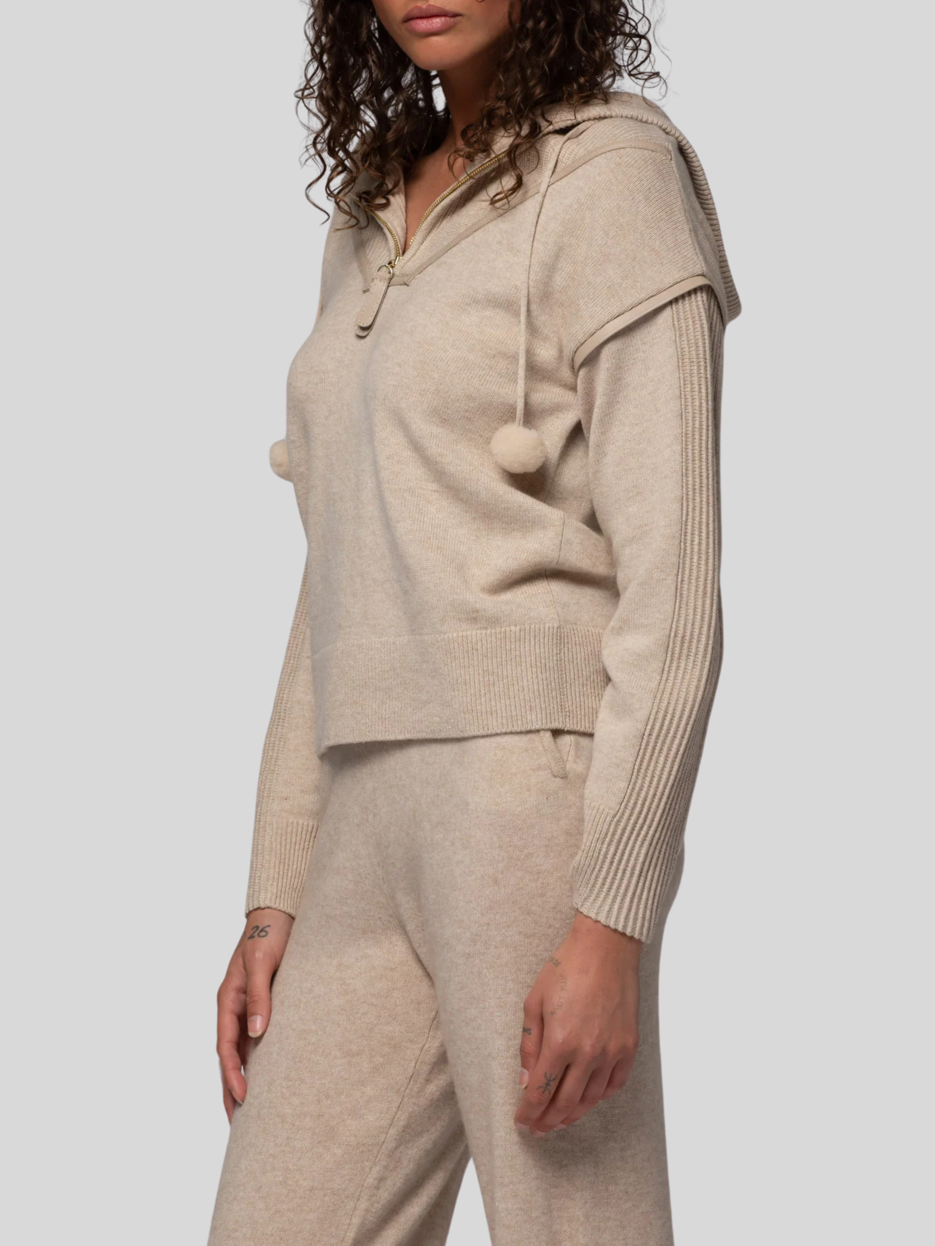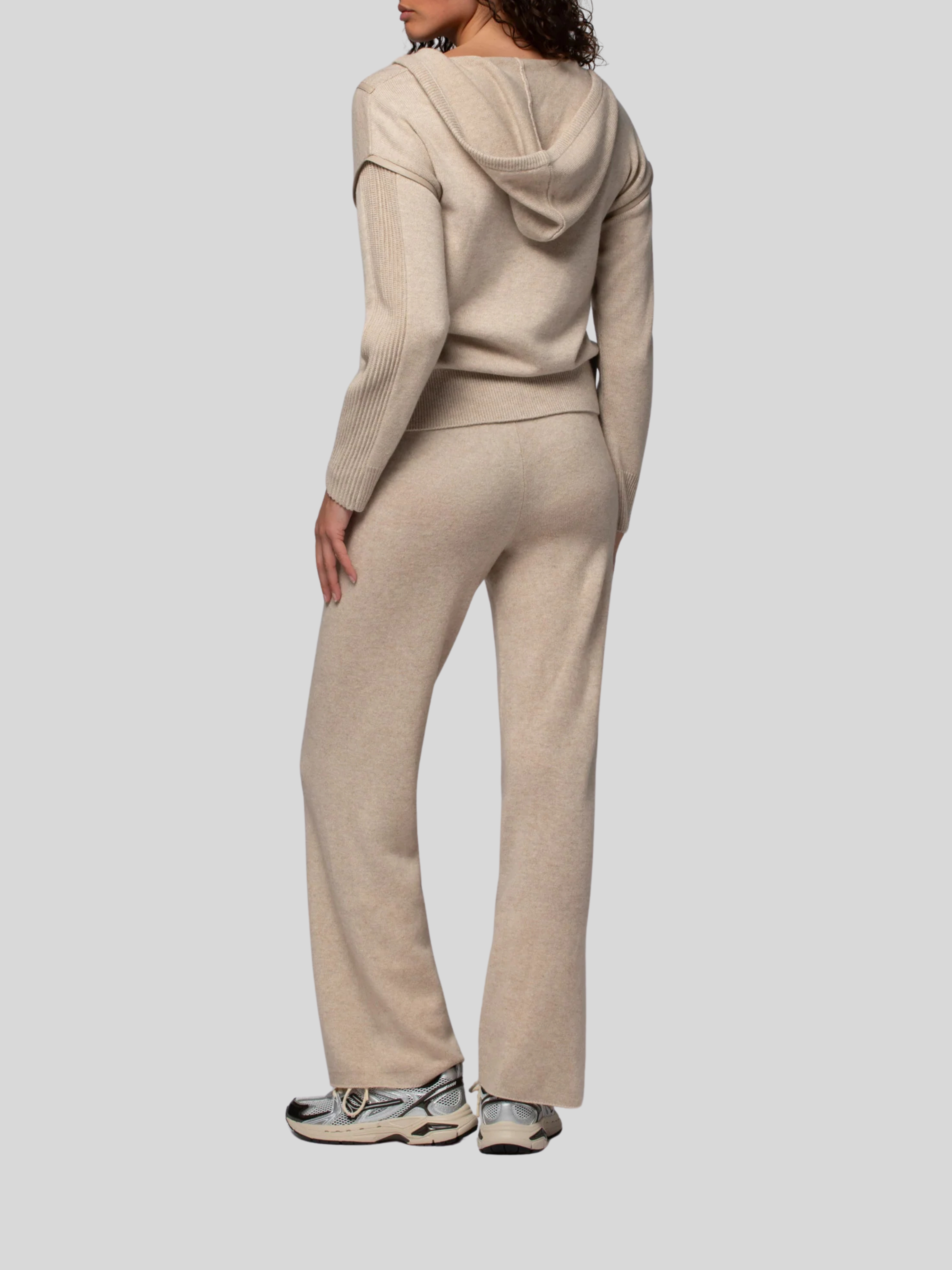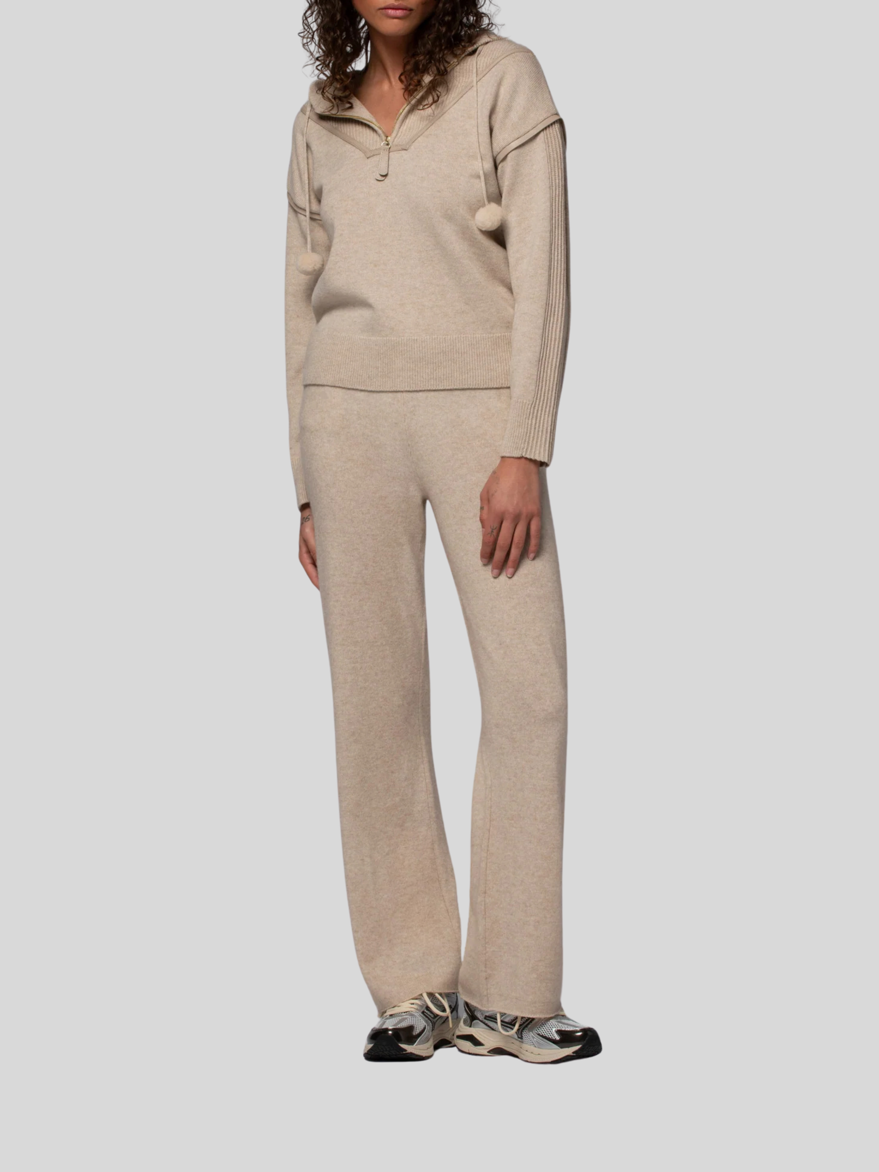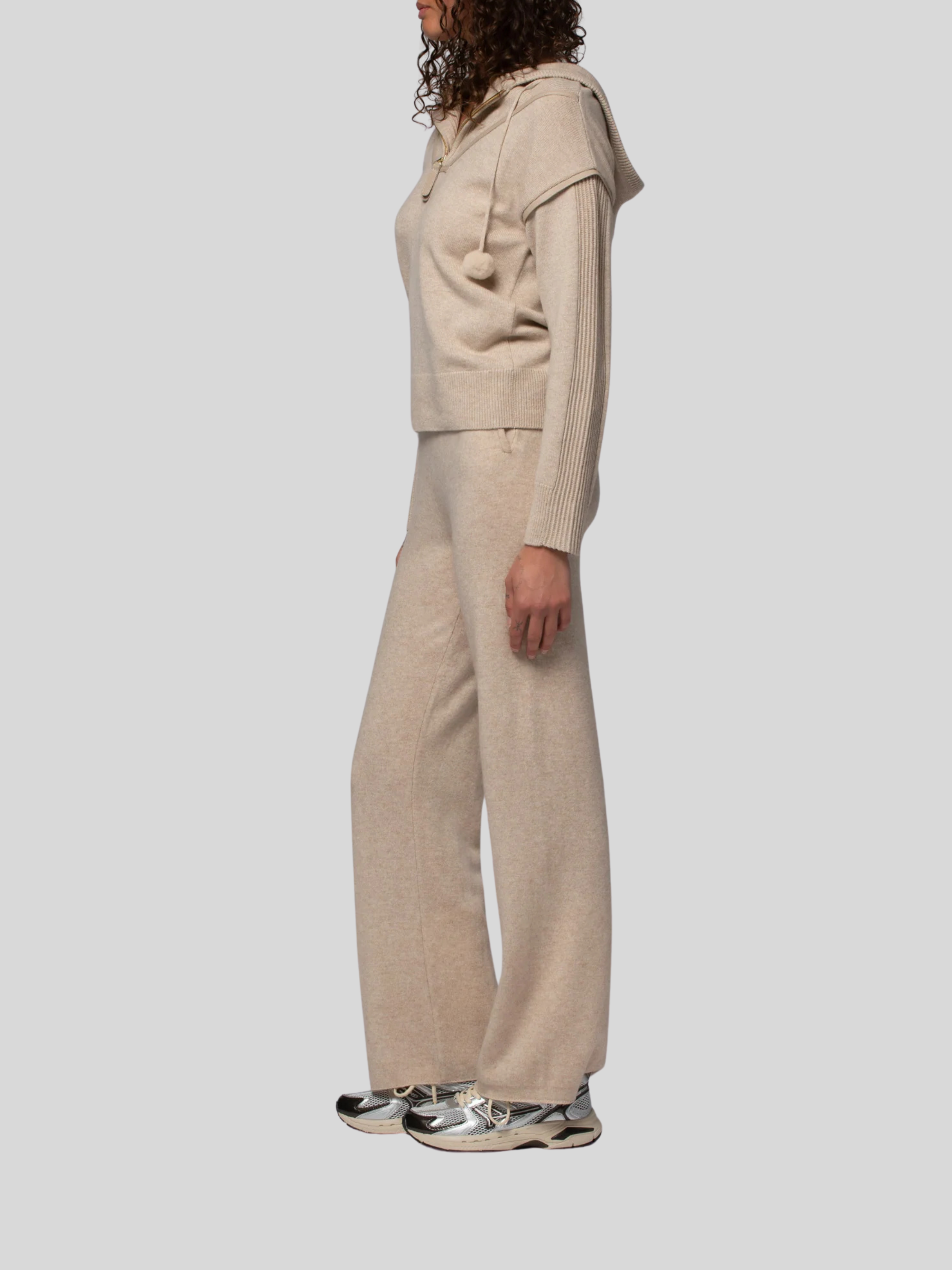 As refined as it is comfortable, the BASIL pants are a must-have in any woman’s wardrobe. Crafted from a luxurious wool and cashmere jersey, they offer unmatched softness and warmth. The wide-leg cut creates a relaxed yet elegant look, while the elasticated waistband ensures a perfect fit and adapts to all body shapes. A delicate gathered silk band at the waist adds a subtle touch of sophistication. Two side pockets, edged with fine ribbed knit trim, complete the design.