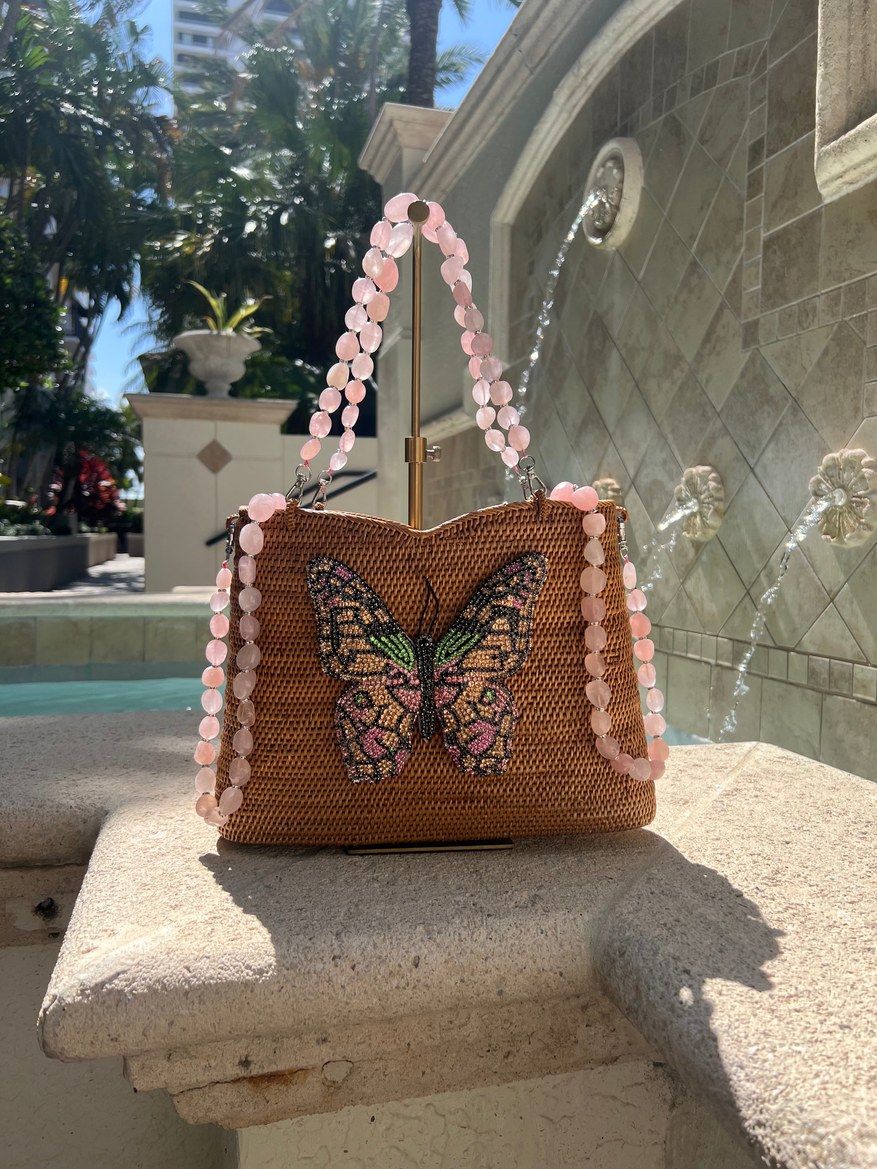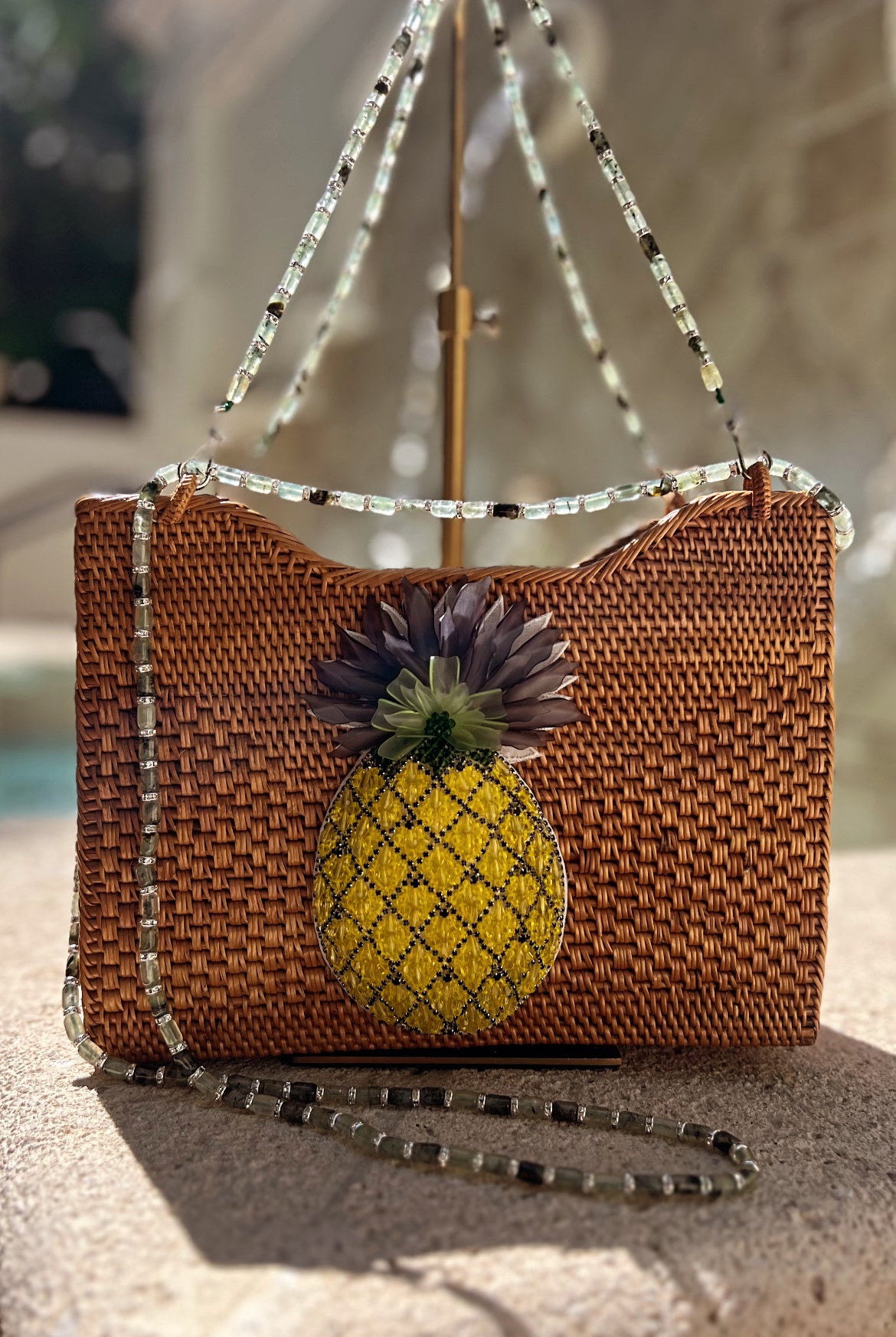 Pimenta creates handwoven bags from Ata grass, native to Indonesia. Artisans use traditional techniques to craft and smoke the grass, achieving a distinct caramel hue. Beading is meticulously done by Mumbai craftsmen. Pimenta ensures fair compensation for artisans, supporting their craft and communities with every bag produced.