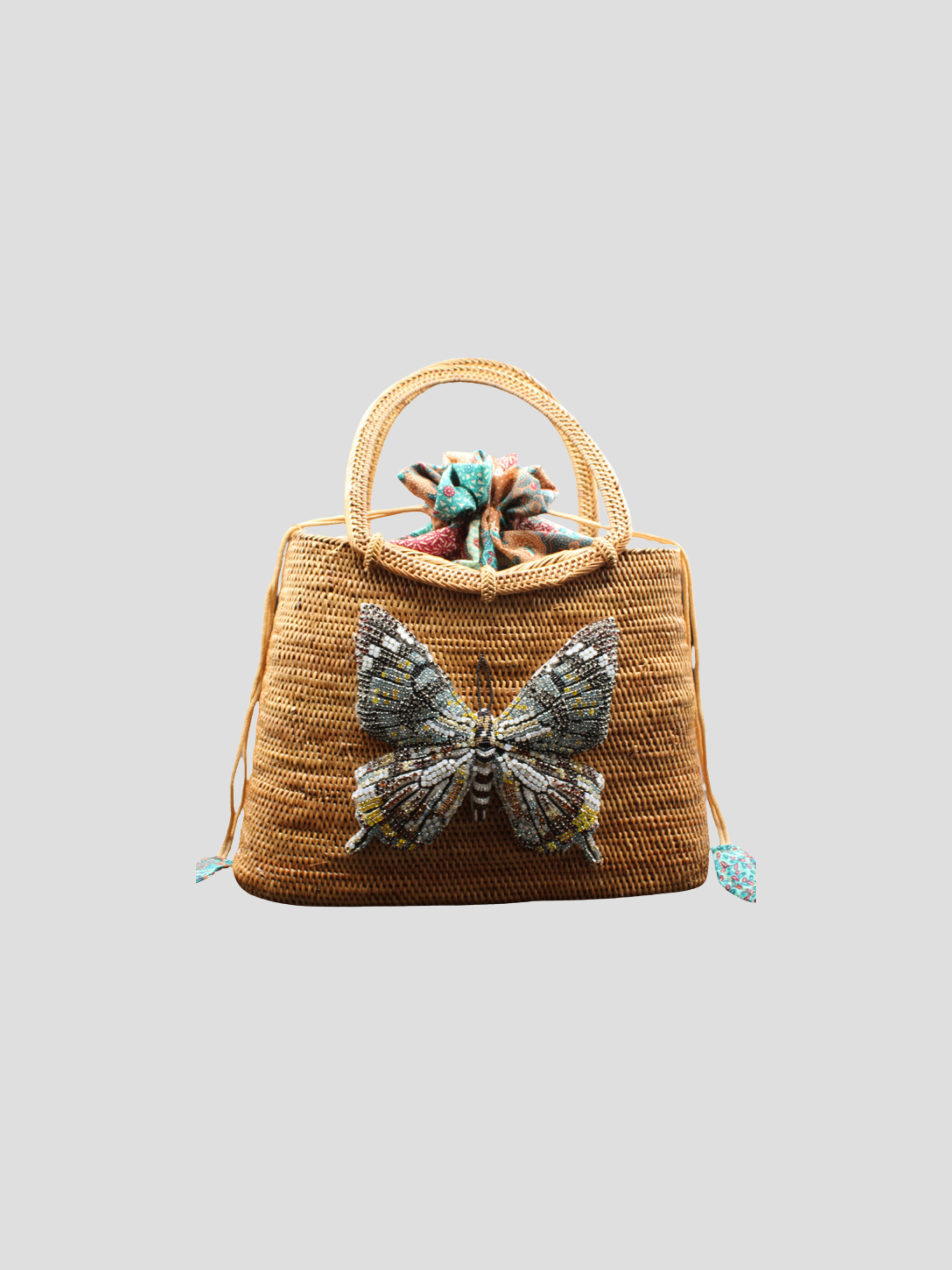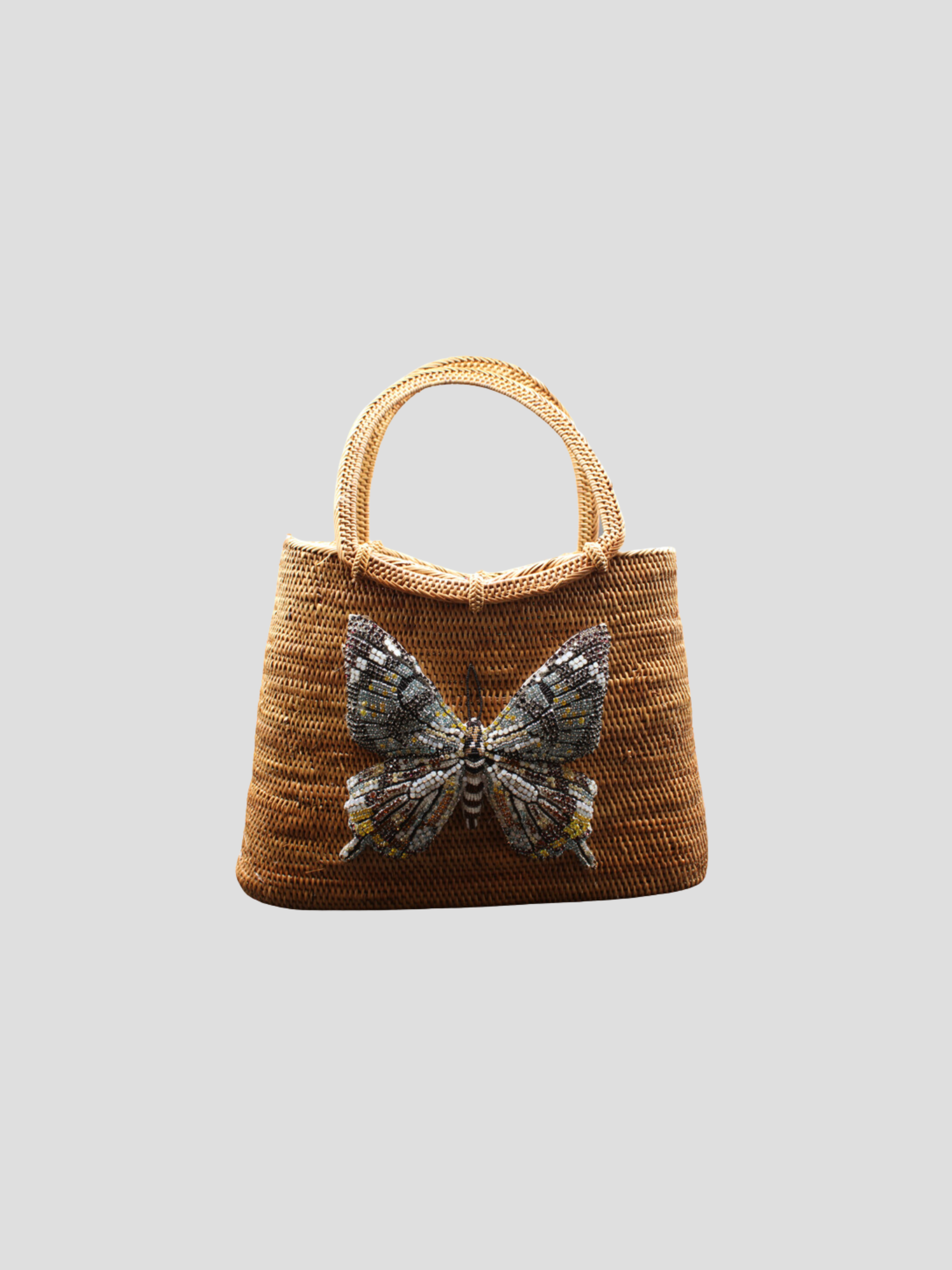 This stylish Raffia Tote features a stunning Swarovski Butterfly design, adding a touch of glamour to any outfit. Made from durable raffia material, it's perfect for carrying all your essentials. Elevate your wardrobe with this elegant and functional accessory.