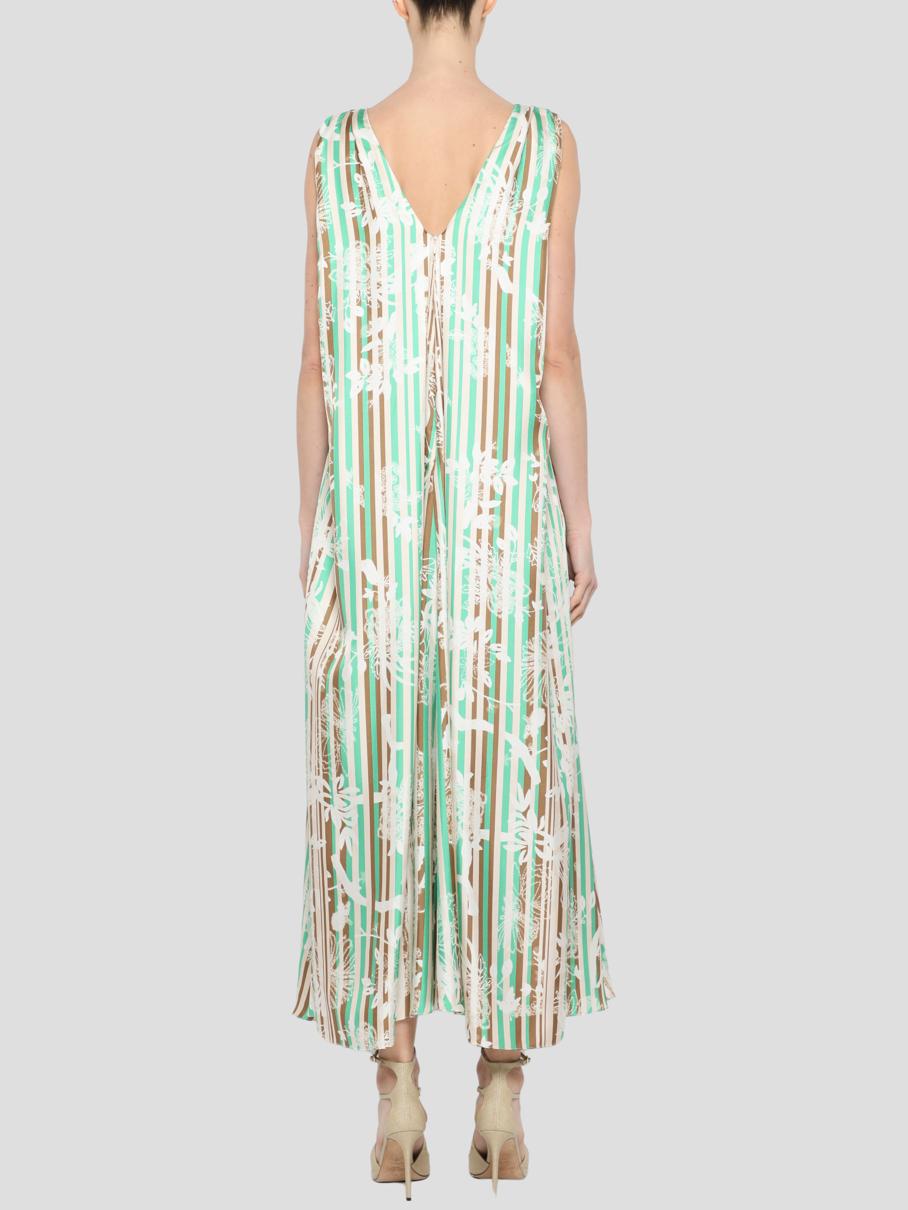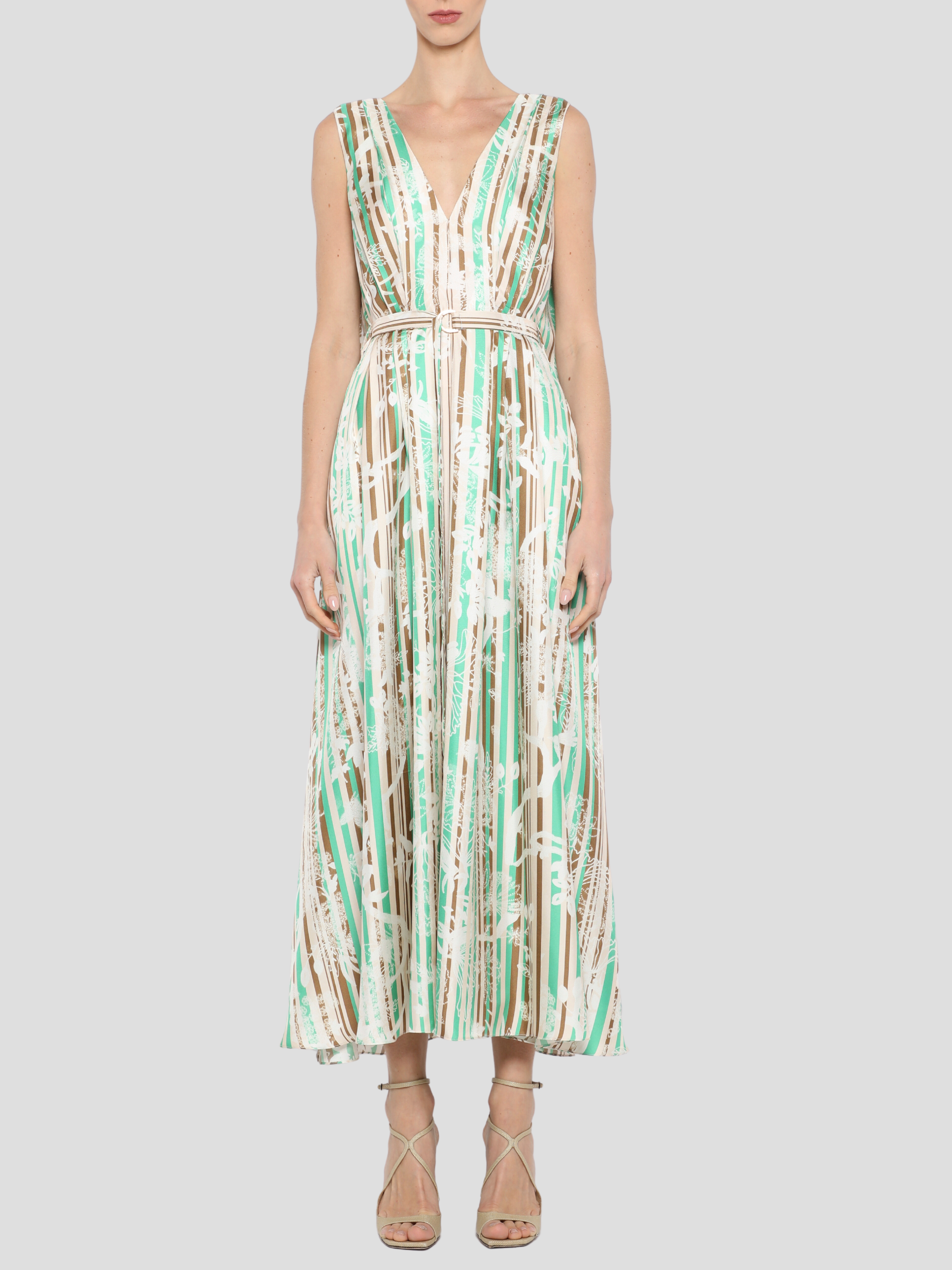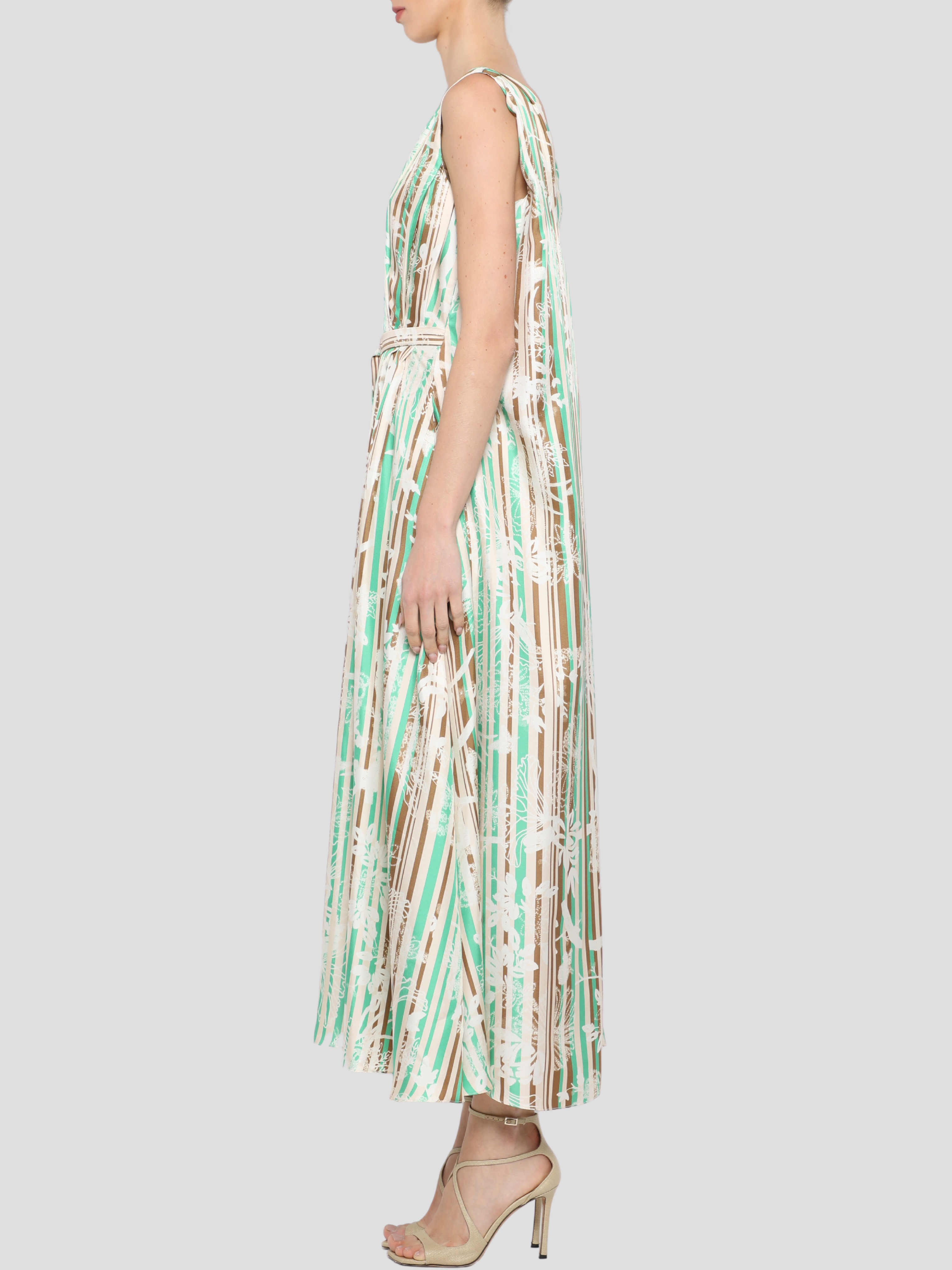 Pleat Front V-Neck Watteau Back Dress in Ecru Multi