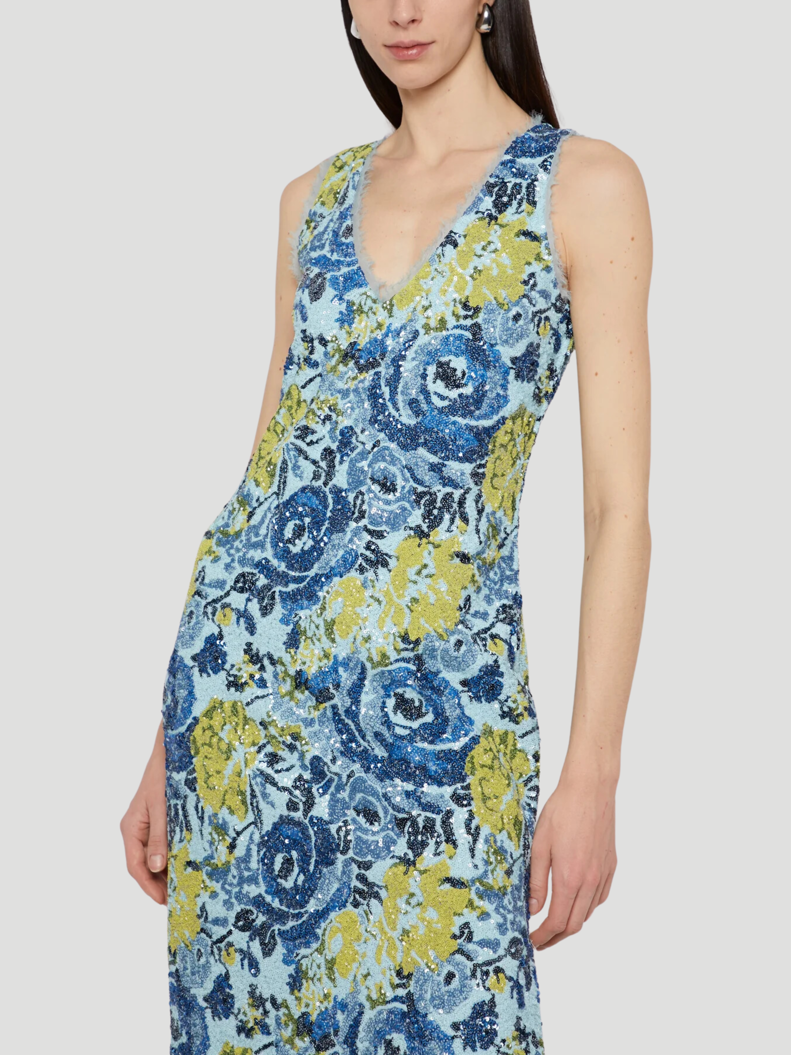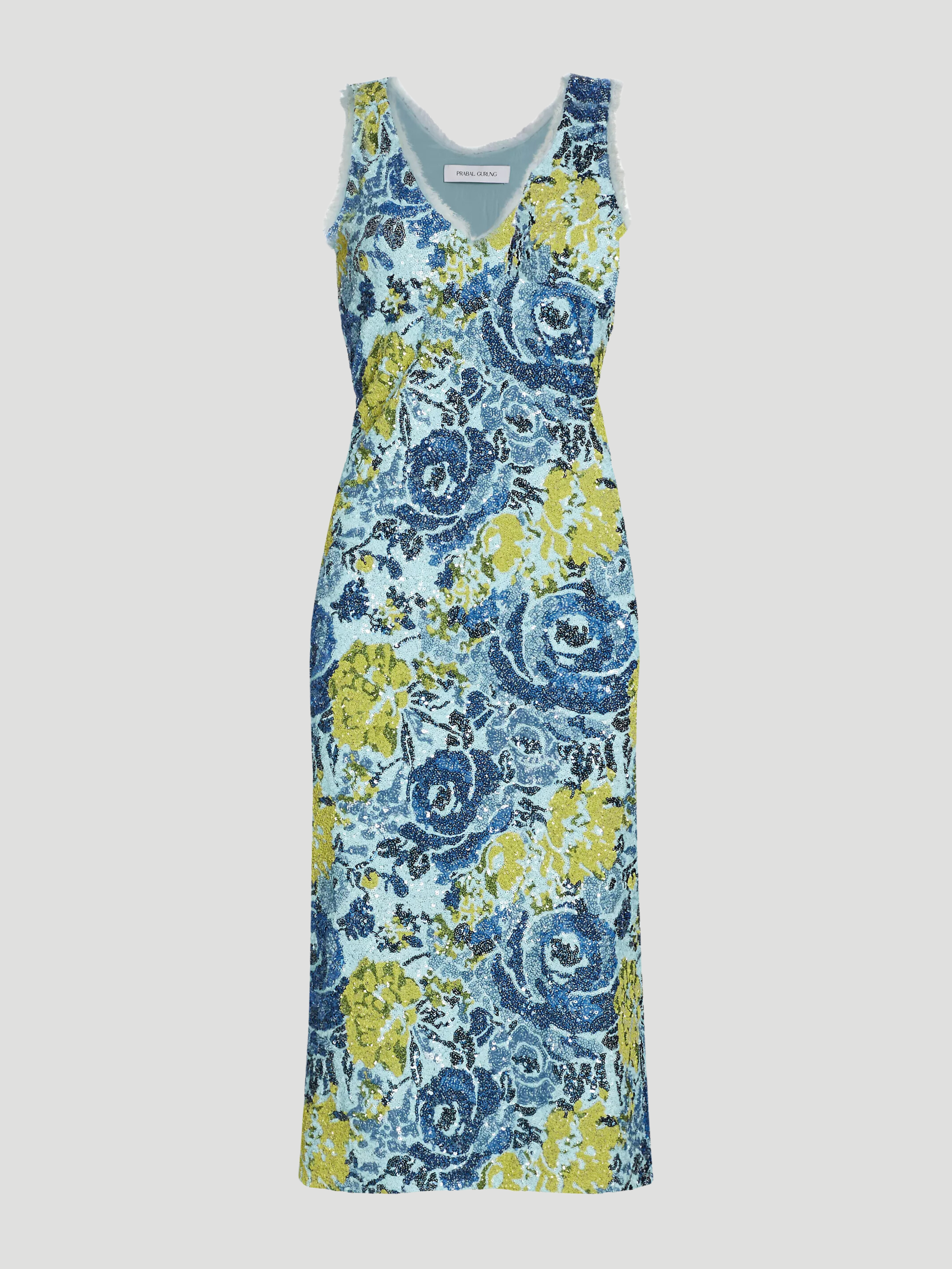 Expertly designed by Prabal Gurung, this V-neck cocktail dress features a stunning sequin floral motif and chic side slits for added movement. The perfect statement piece for any occasion, this dress exudes elegance and sophistication.