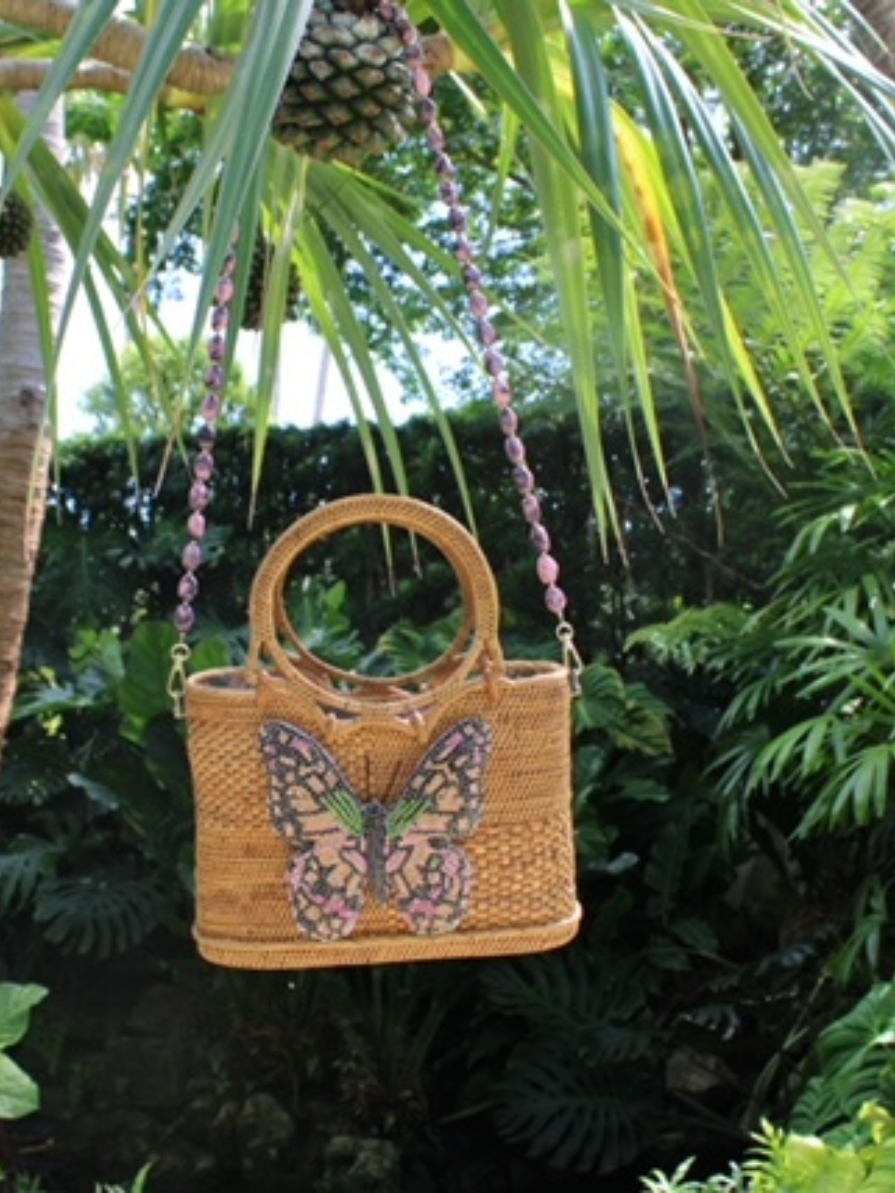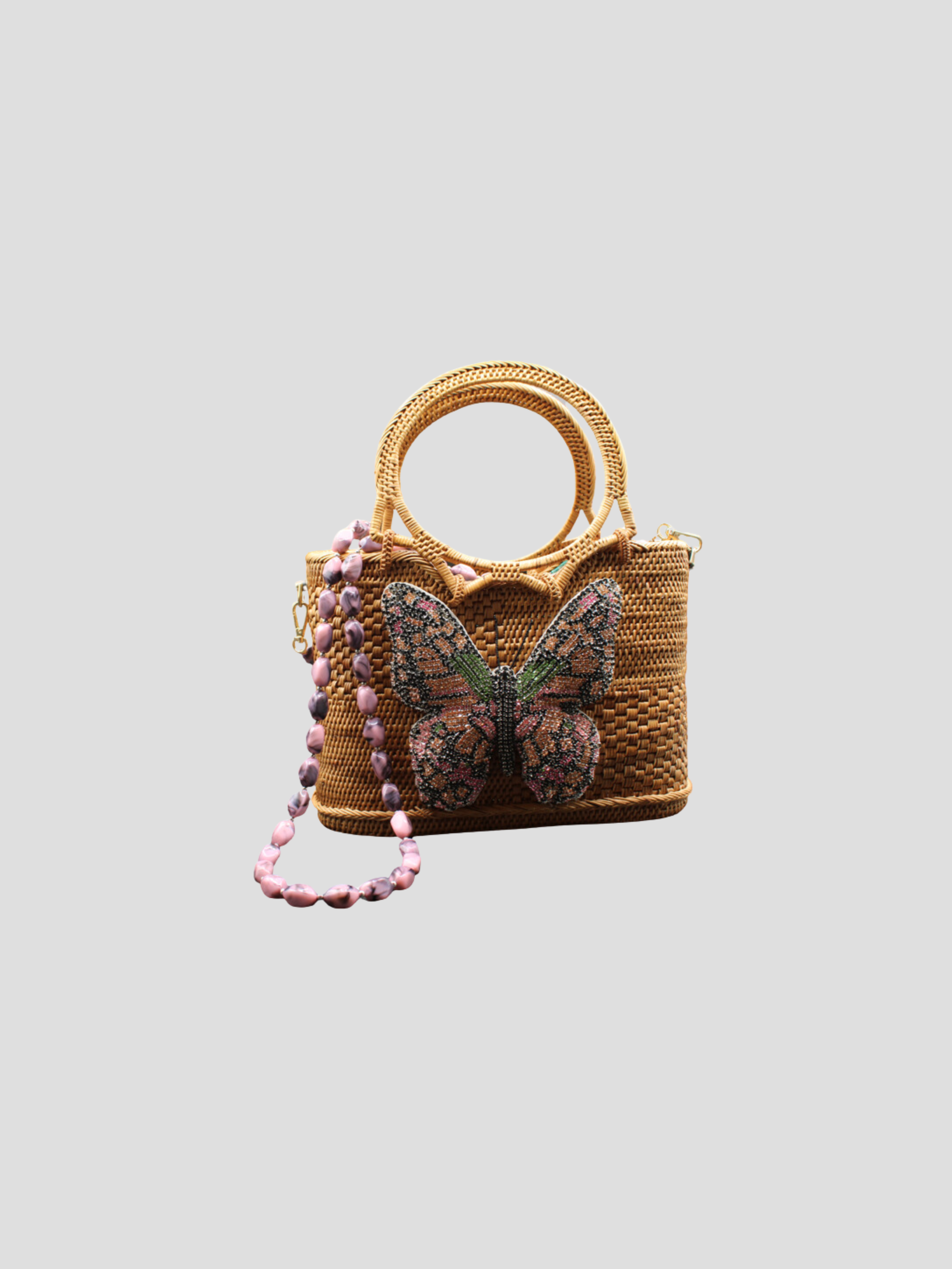 Raffia Tote with Pink Butterfly and Gemstone Strap