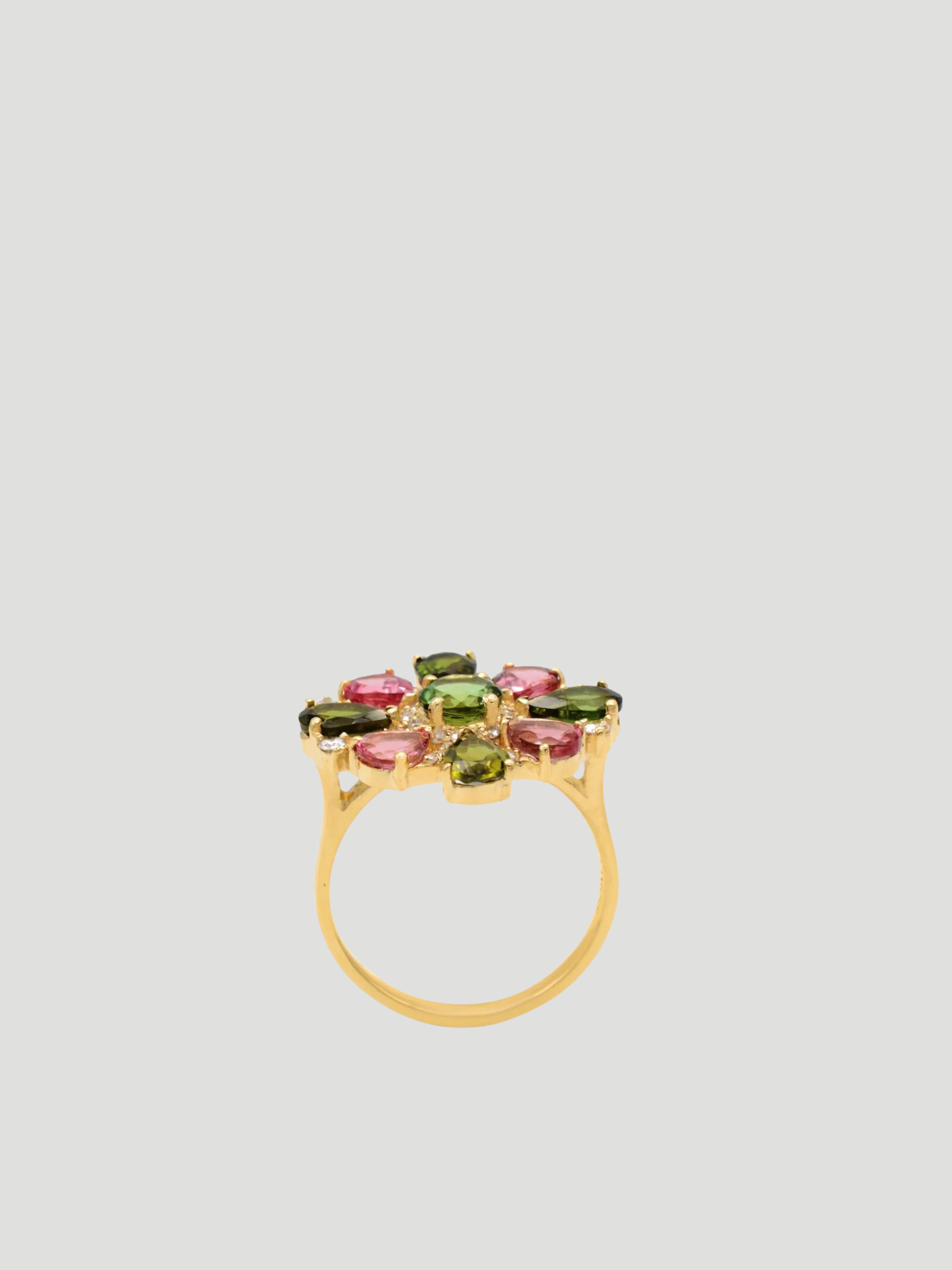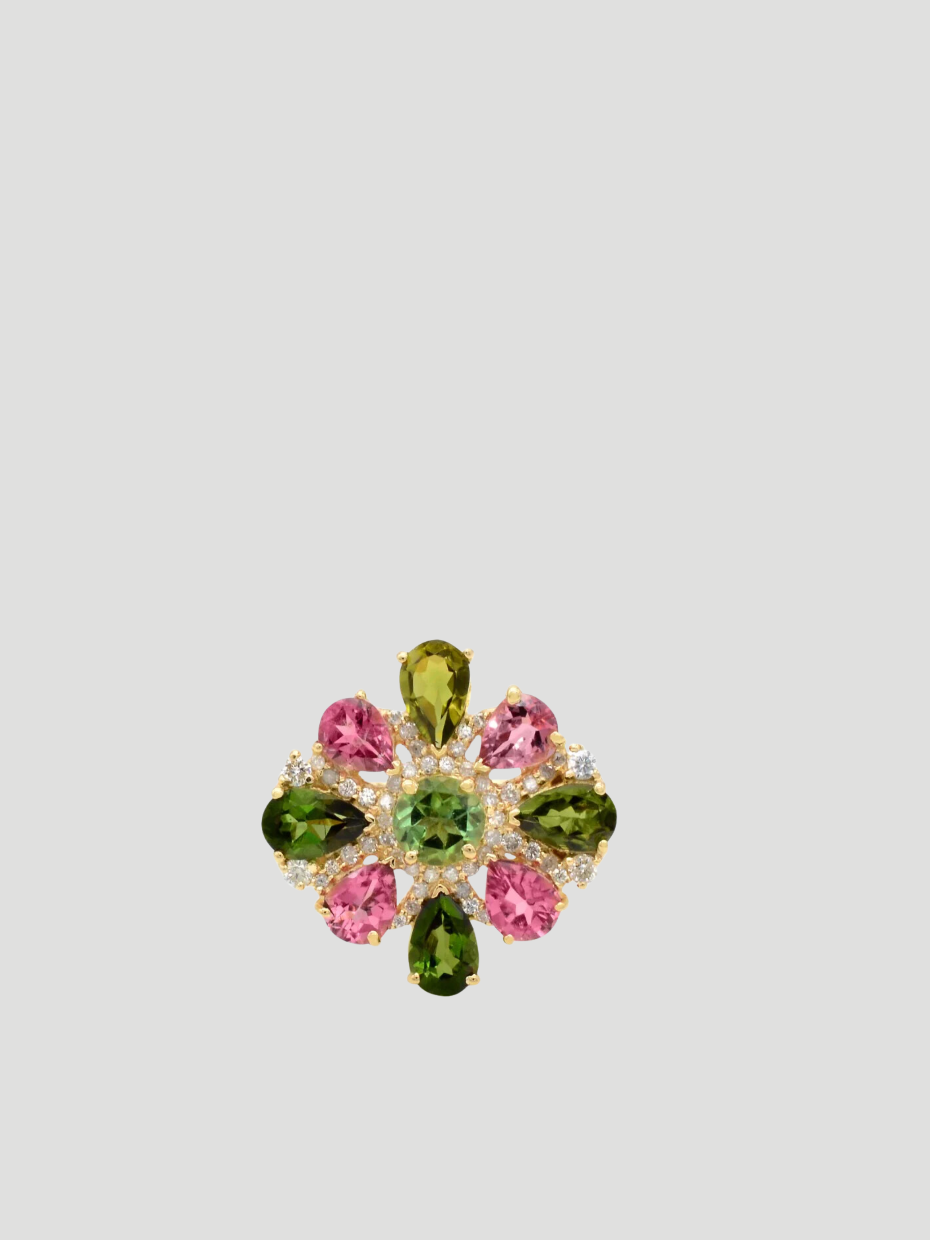 Discover the vibrant hues of Jaipur with La Muse's Floral Radiance Ring. Inspired by blooming palace gardens, this stunning ring is adorned with a radiant mix of tourmalines and diamonds, evoking India's colorful heritage. Elevate any look with this exquisite piece of jewelry.