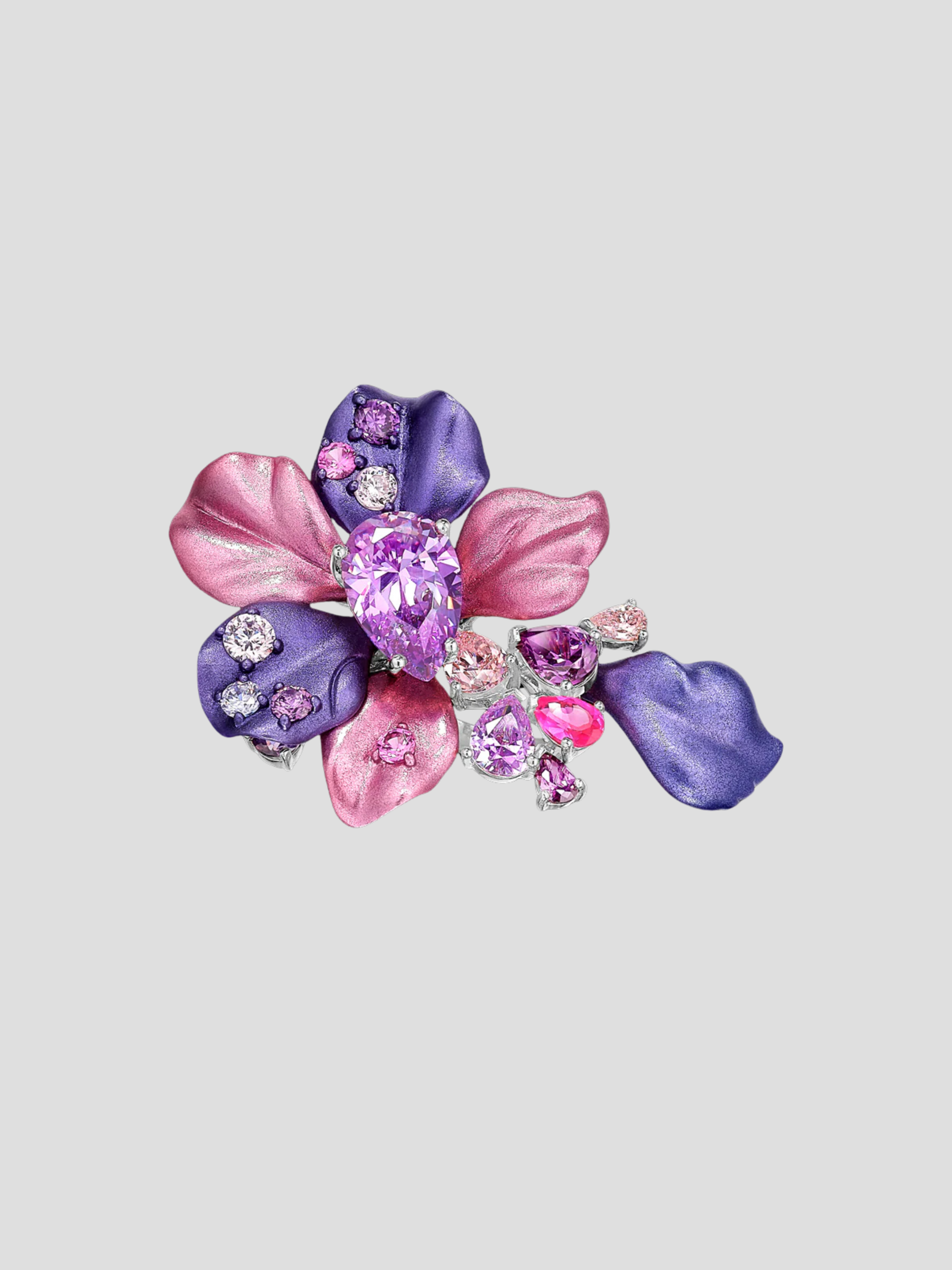 Recycled aluminium, 18k white gold & rhodium vermeil, laboratory-grown and created gemstones including violet amethysts, lilac amethysts and blush pink sapphires