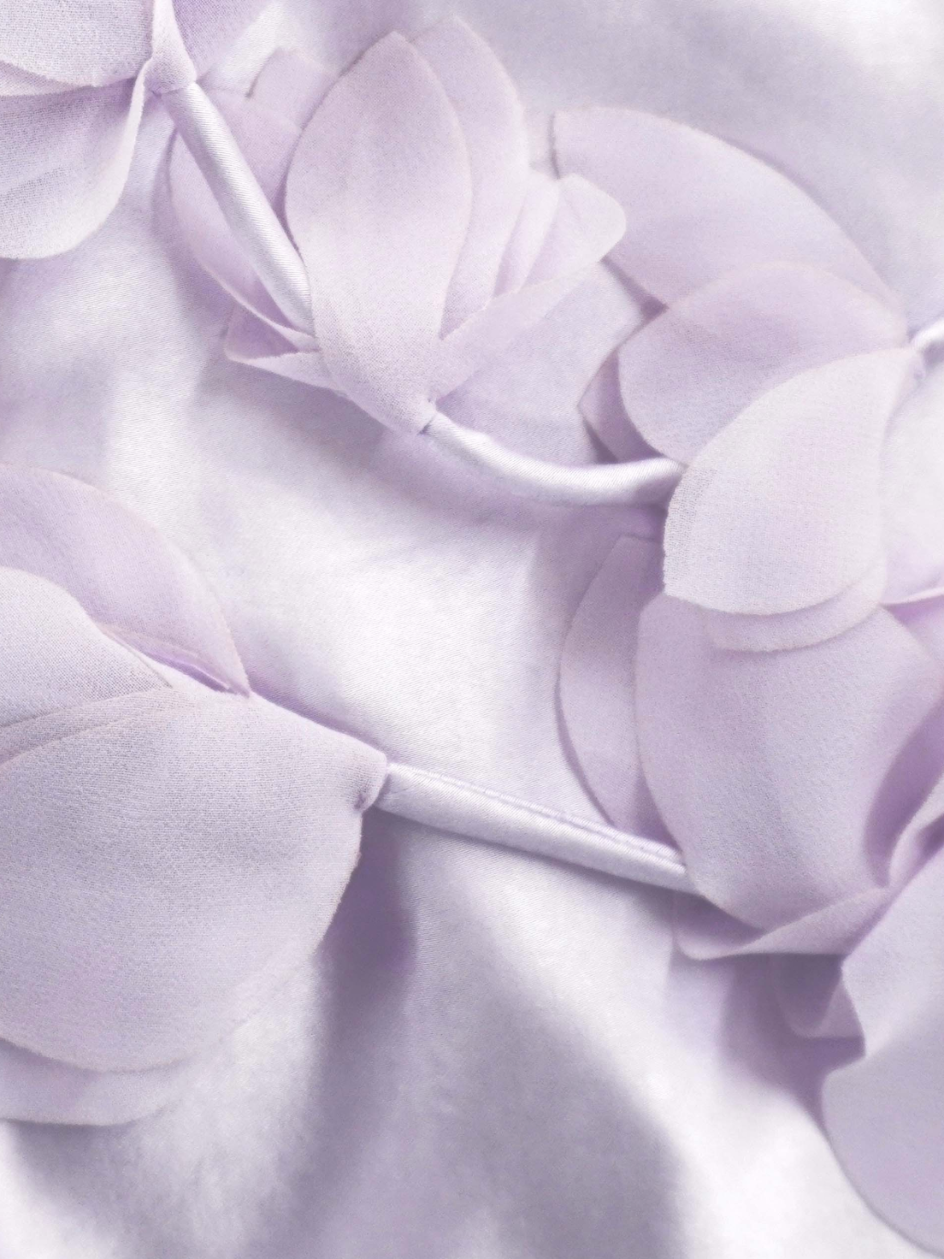 This satin dress exudes understated elegance with its minimalist silhouette and flowing maxi skirt. Highlighted by bust detailing, delicate floral motifs add extra romance to the ethereal look.