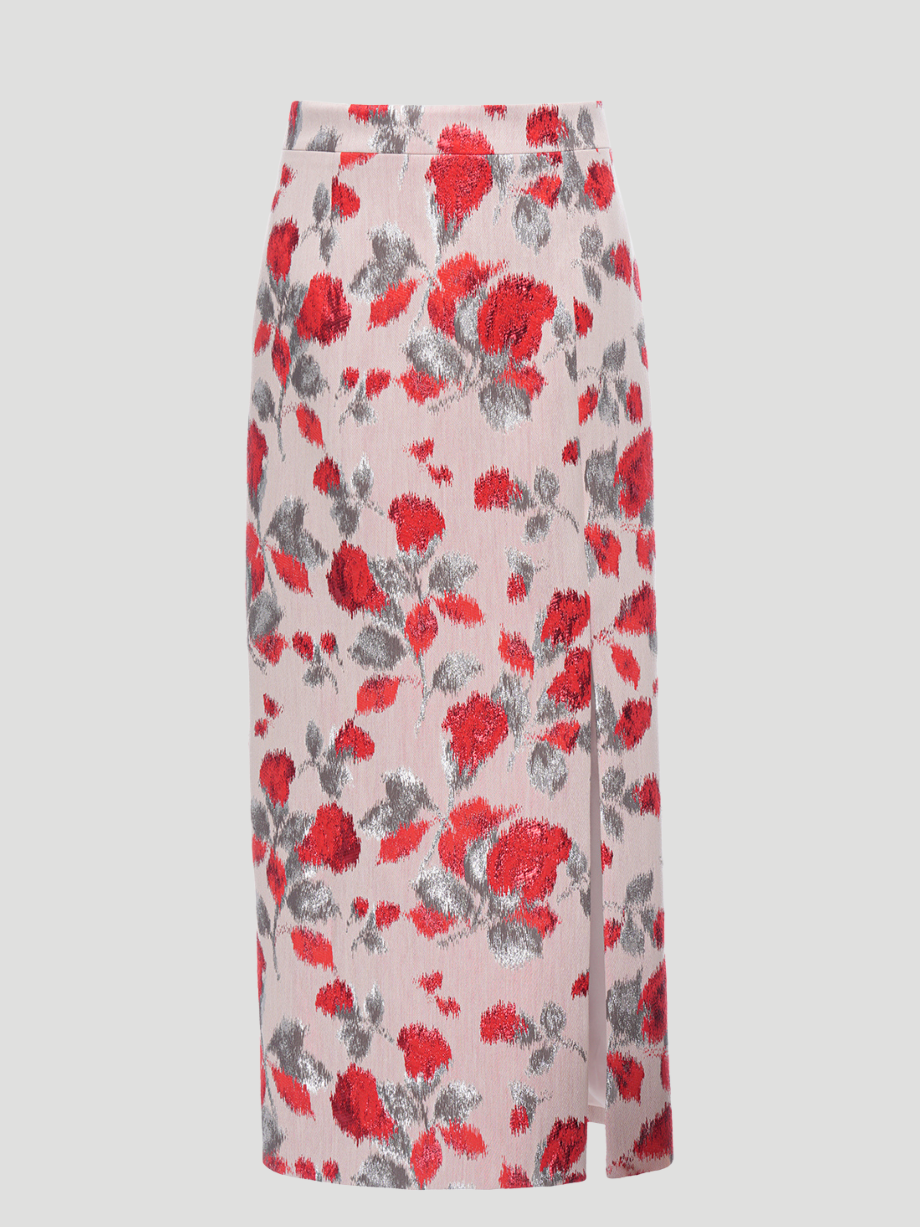 Elevate your wardrobe with the Midi Printed Pencil Skirt by Huishan Zhang. Adorned with vibrant red and silver floral patterns, this skirt boasts a classic pencil silhouette with a modern edge. Perfect for pairing with statement blouses or tailored tops, it adds sophistication and a touch of artistry to any ensemble.