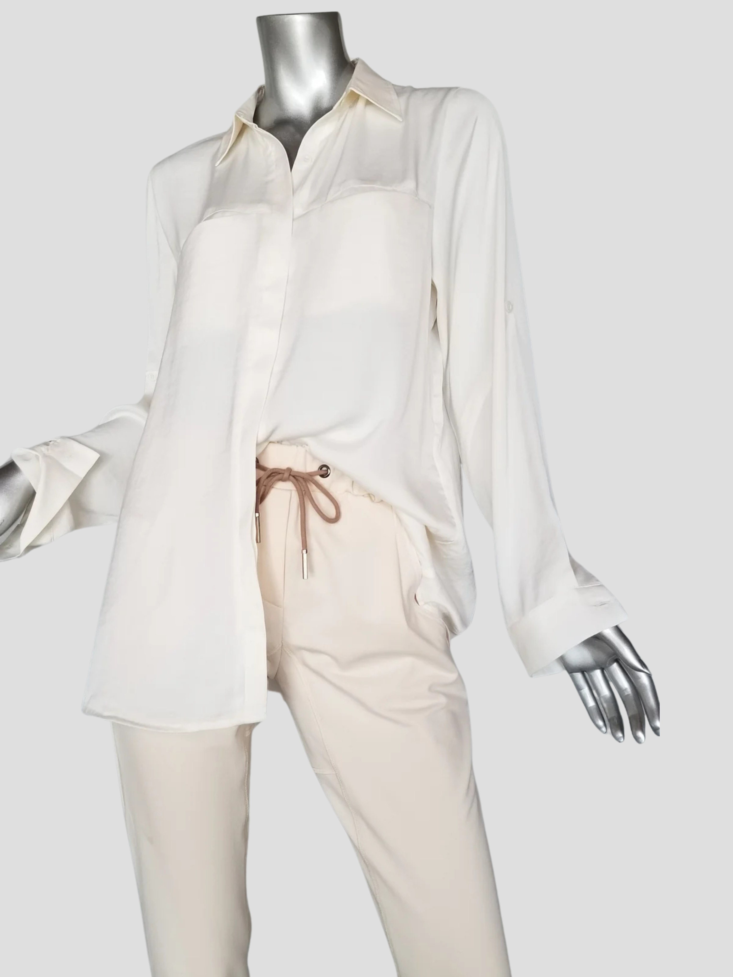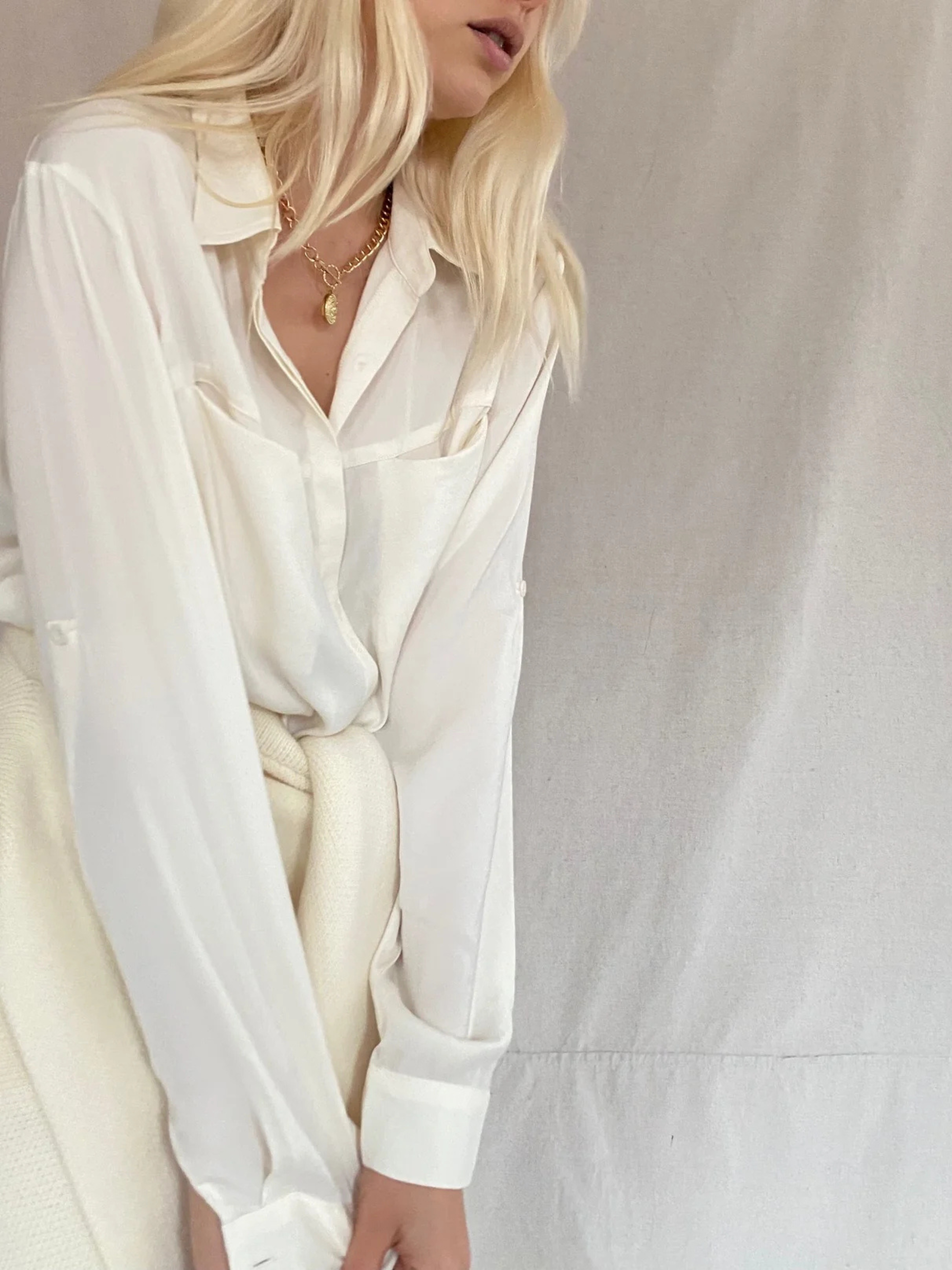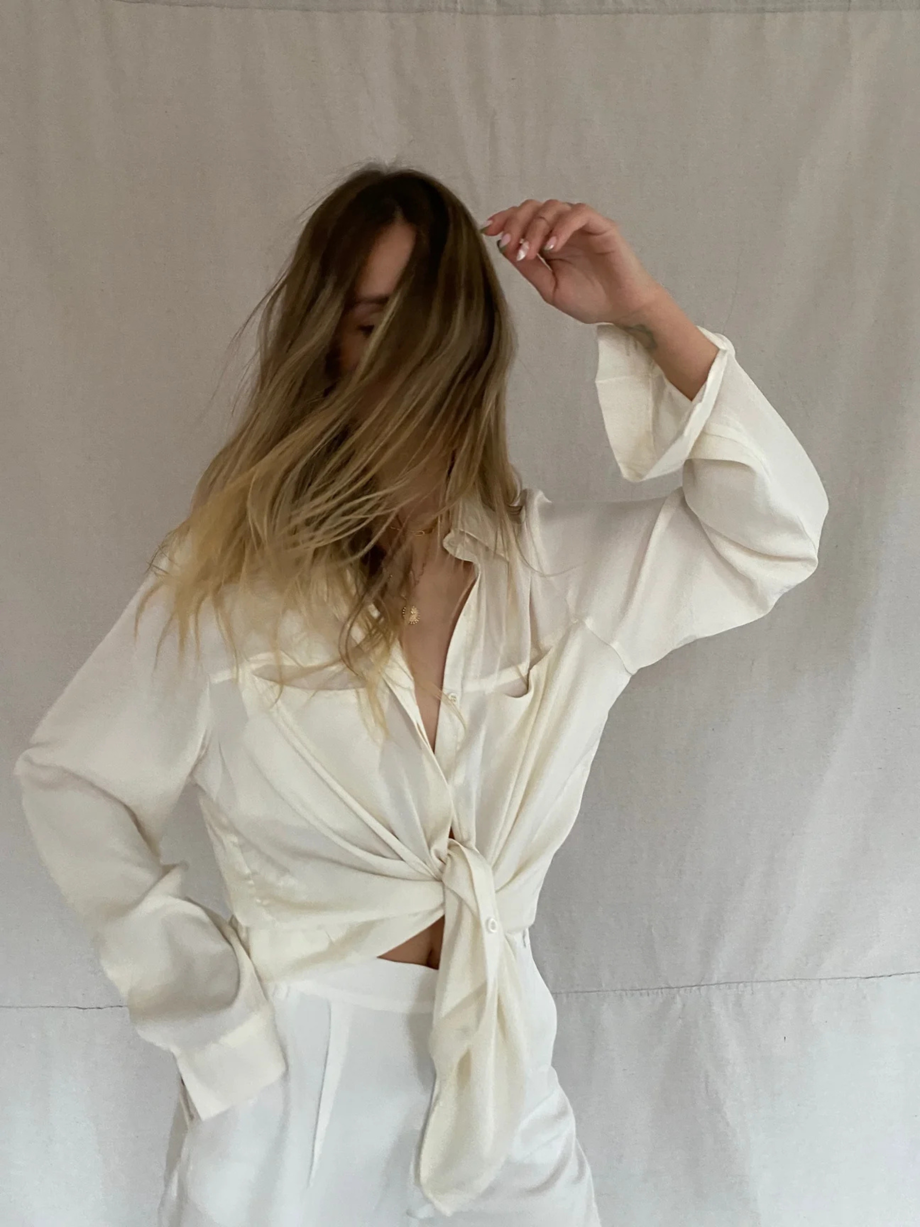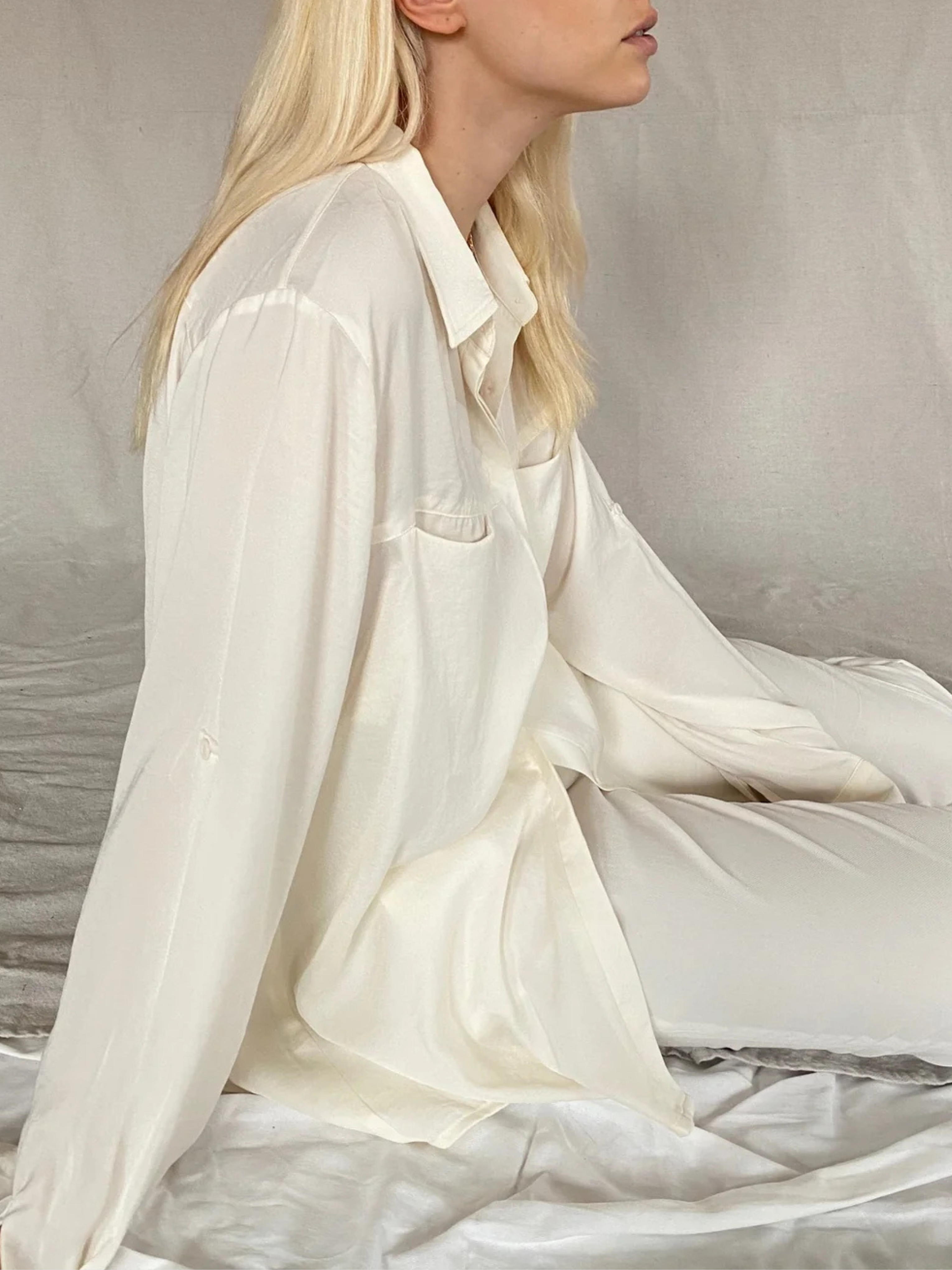 The shirt is made from our most beloved fabric, the liquid silk polyester that moves and feels like silk but is washable on the delicate cycle.