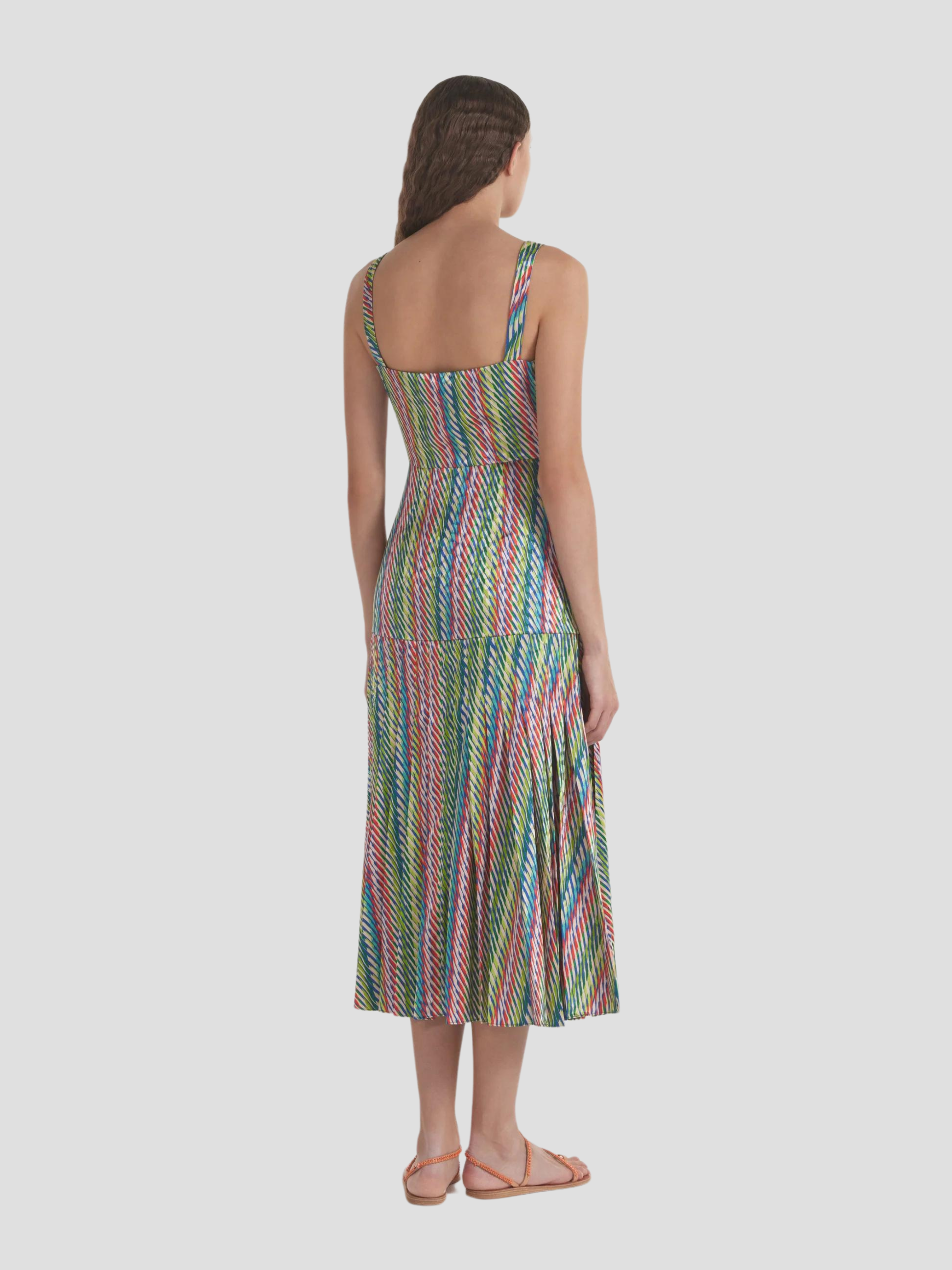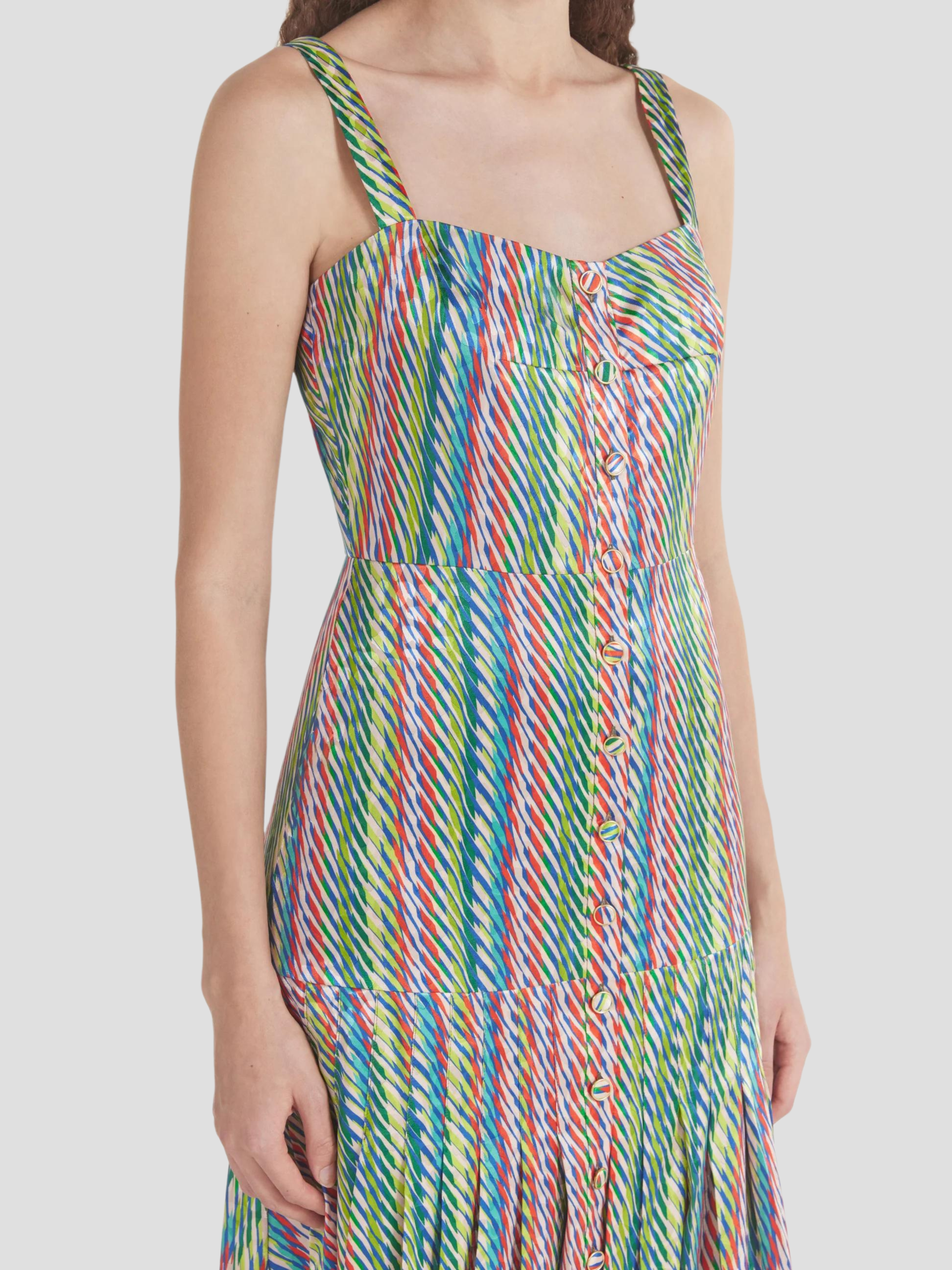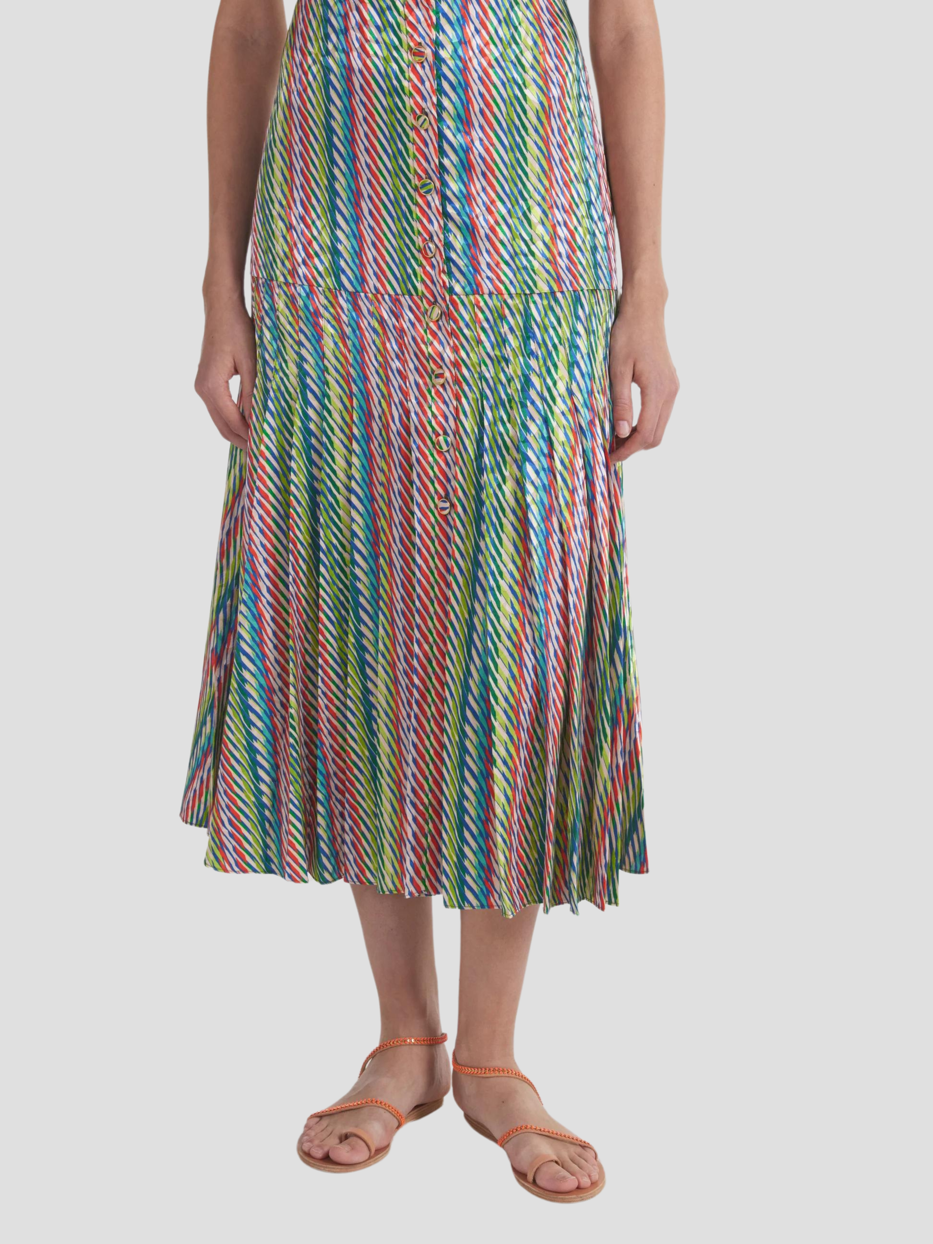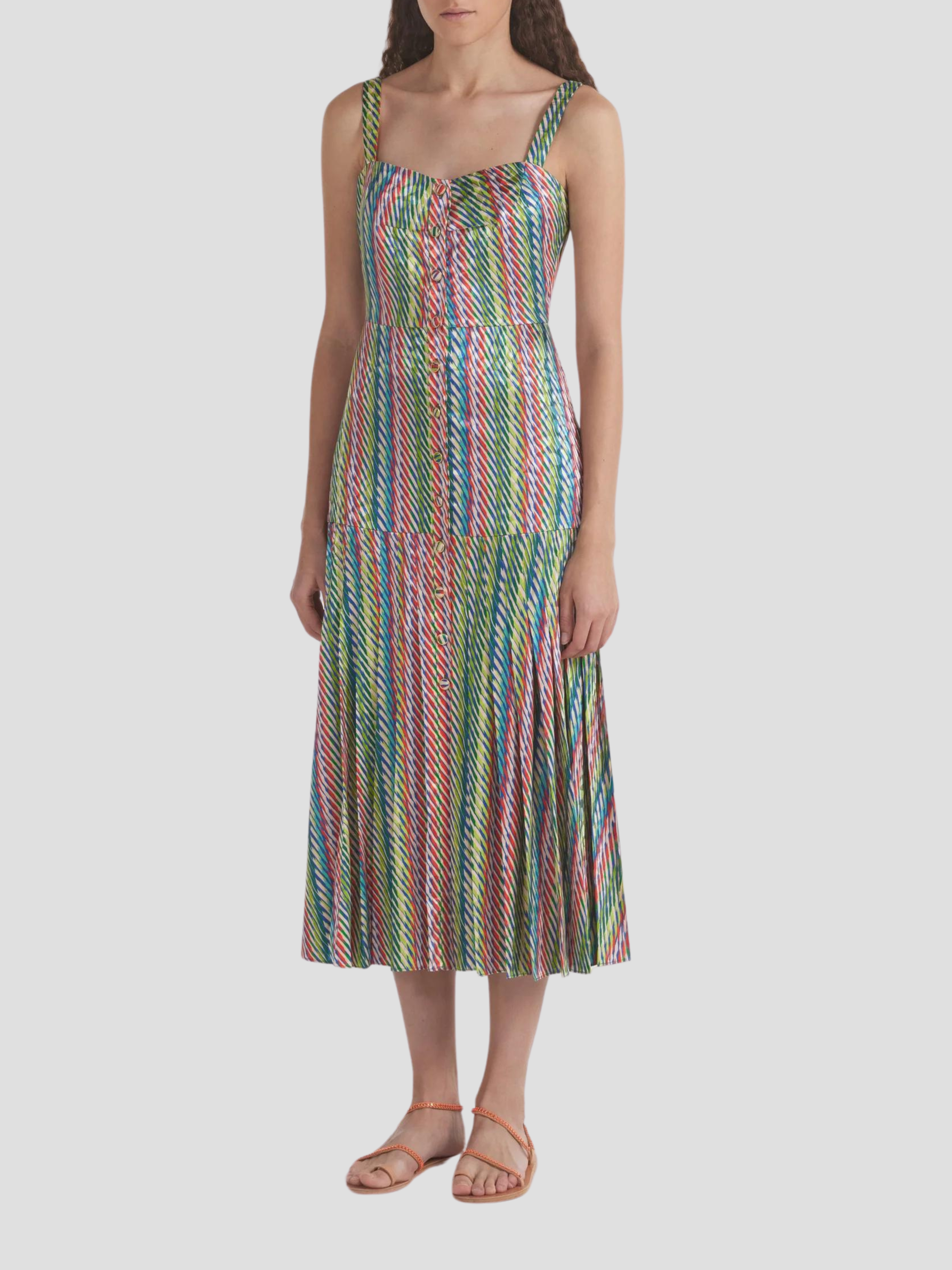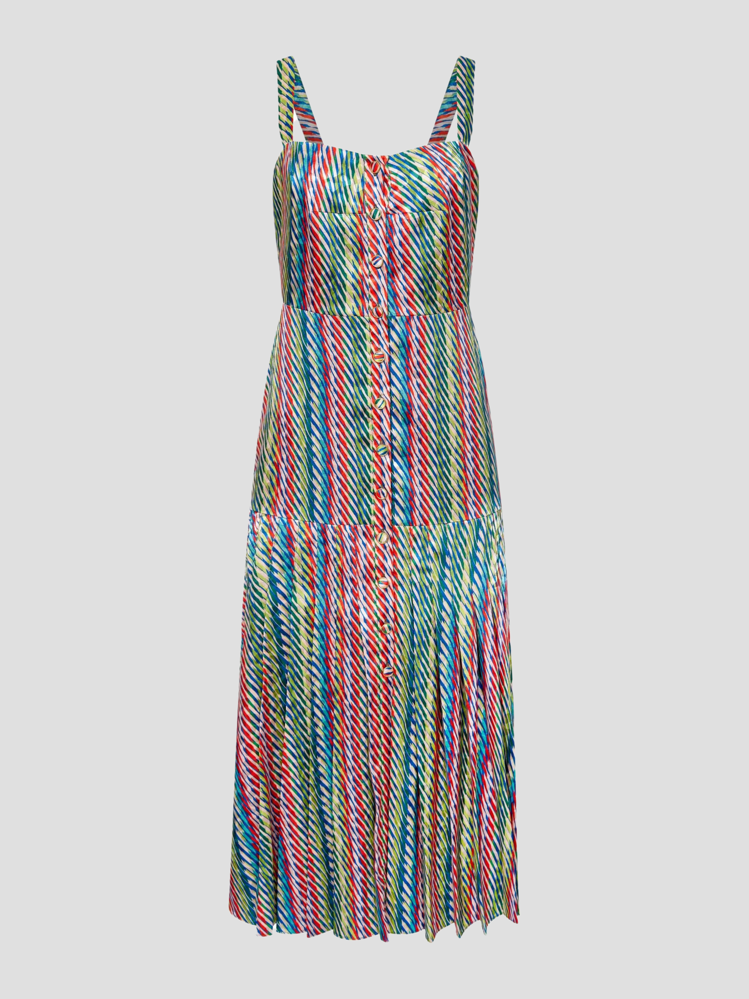 Simple in silhouette but with an eye-catching graphic print, the Karen Dress in Oblique Olive features a front button placket and sleeveless silhouette, offering charm and versatility. The fitted waist accentuates the figure, while the pleated skirt adds movement and fluidity to the look. The overlaying kaleidoscopic lines form a striking oblique print, create a captivating visual impact and adding a modern twist to the classic silhouette.