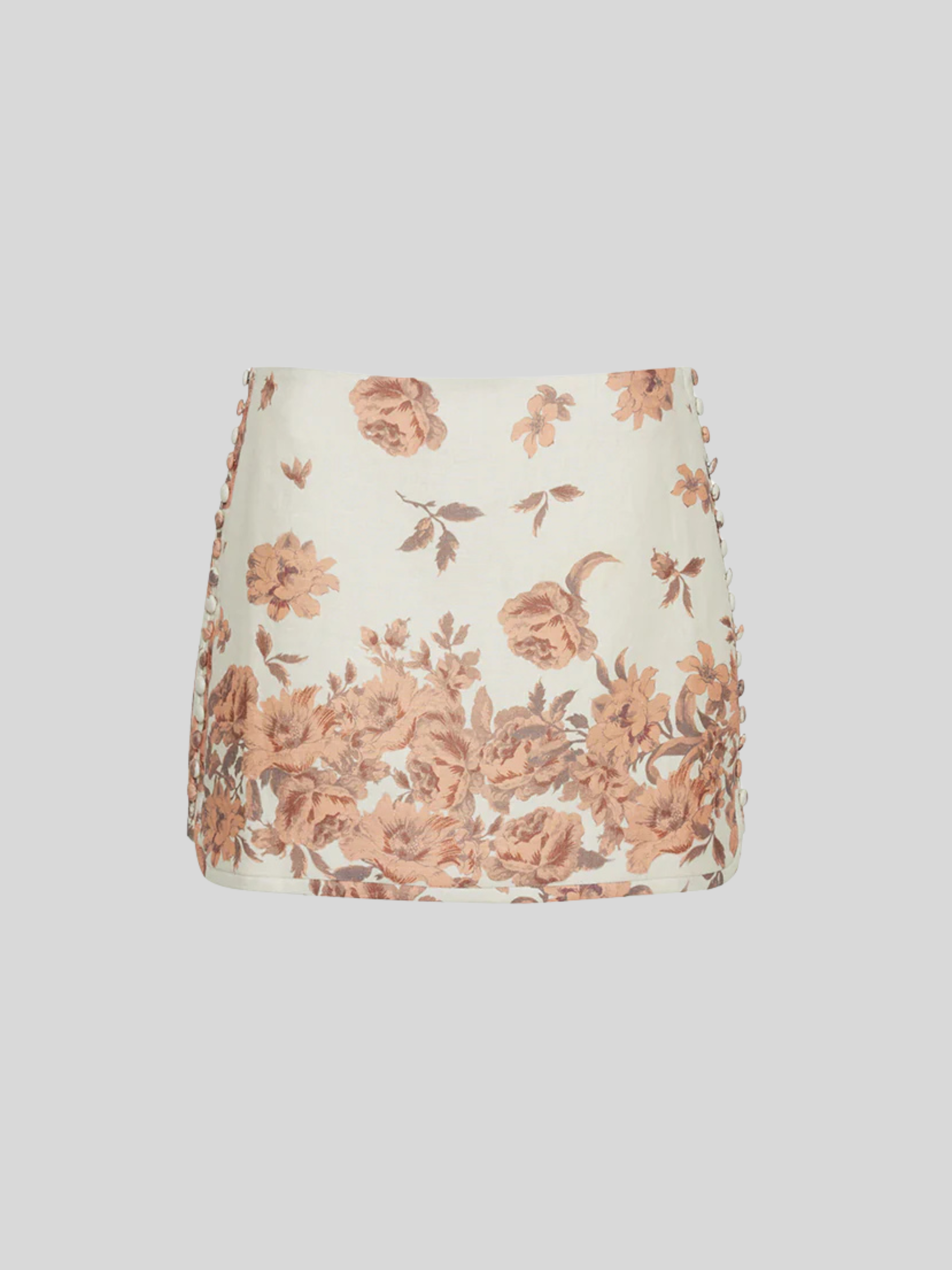 • Mini linen skirt with elliptical hem and decorative buttons